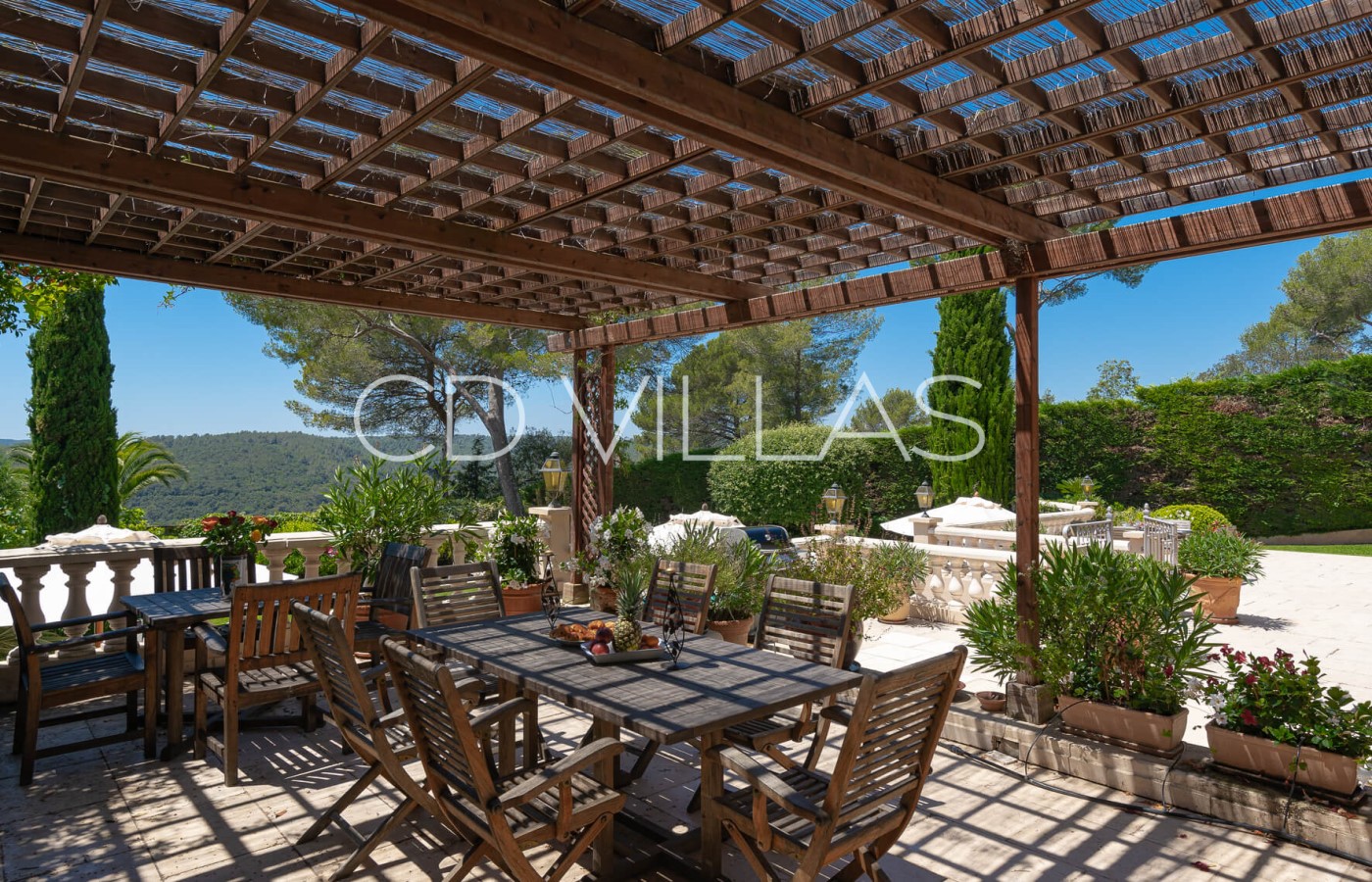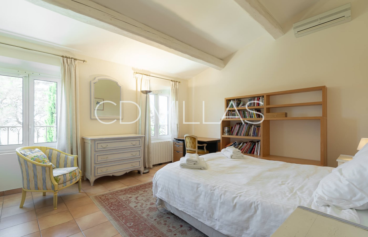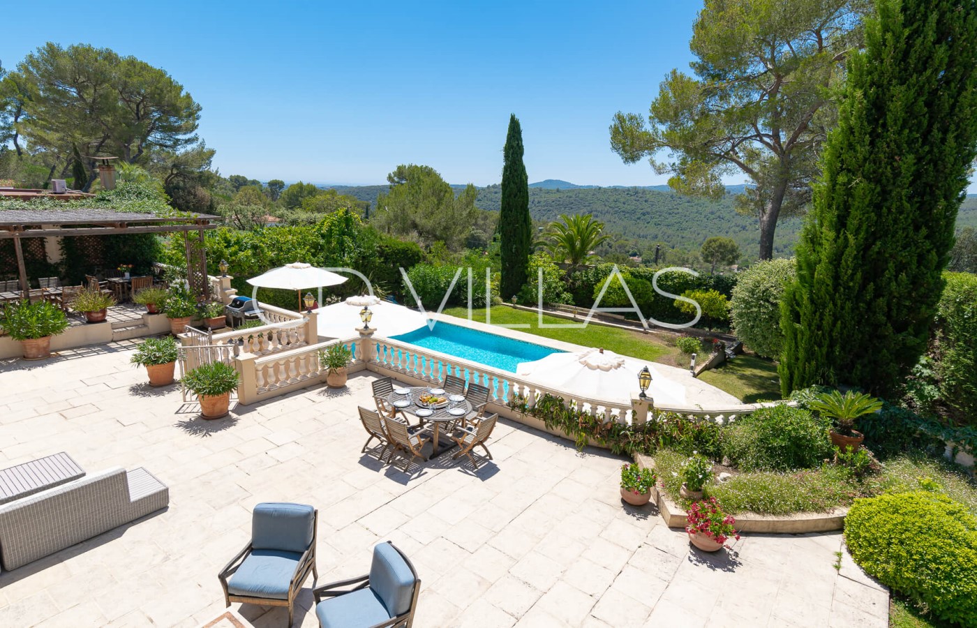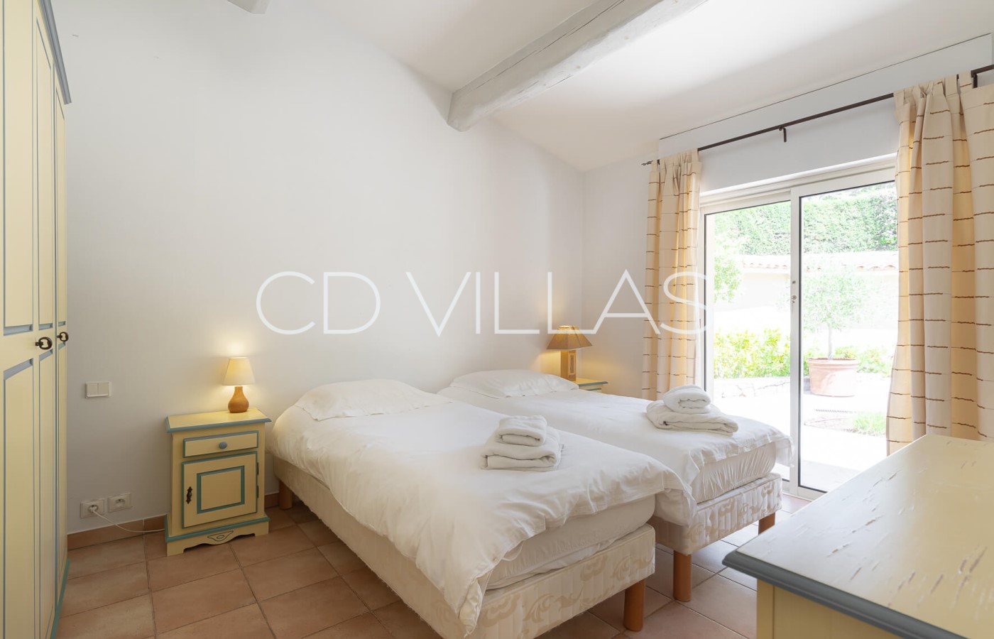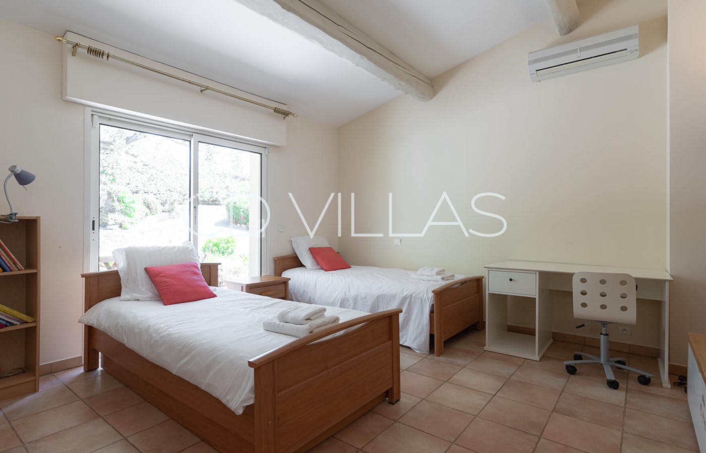 The villa offers accomodation for 10 people with 4 bedrooms in the main house and a separate studio, all air conditioned. The outdoor comprises of a spacious elevated terrace with dining and seating area and lovely views over the countryside, a large fenced pool that can be heated, all set in a beautiful Mediterranean garden.