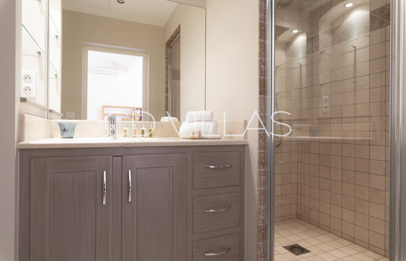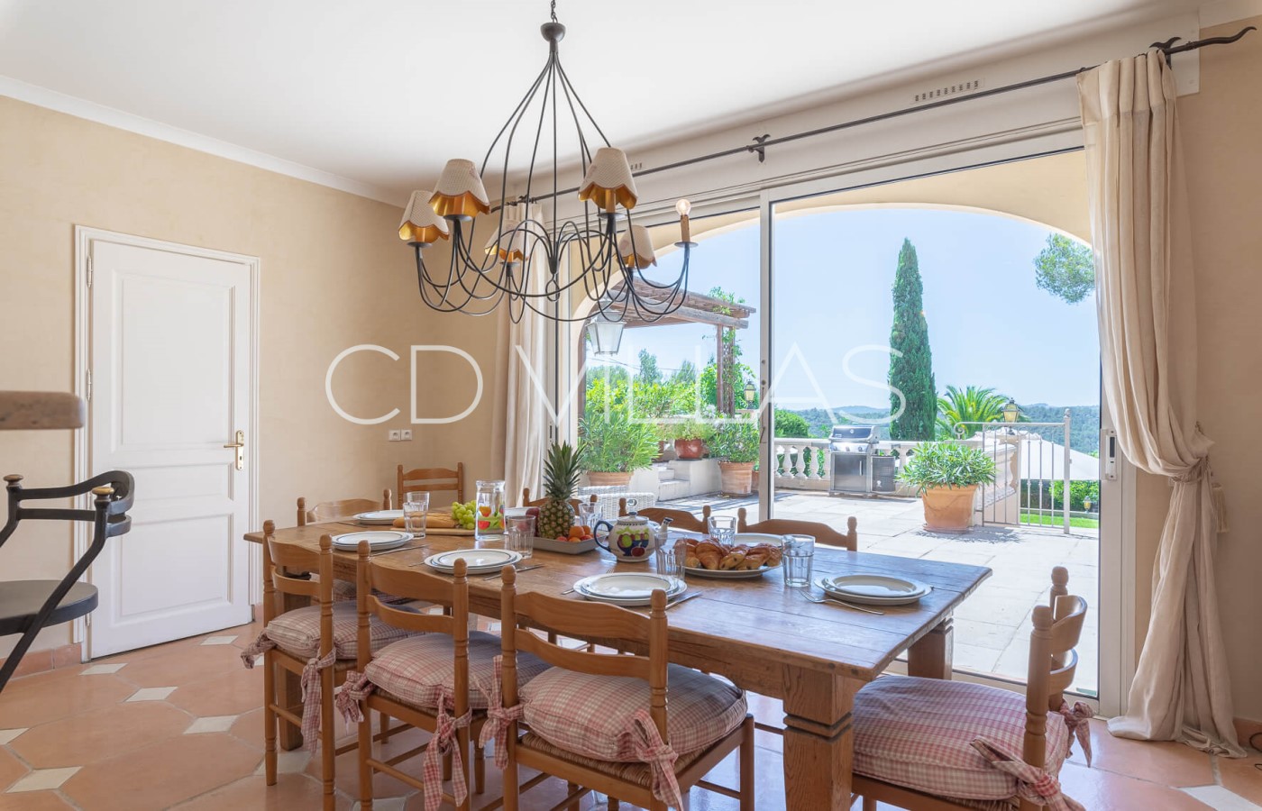 The accomodation is set on two floors with an ensuite master bedroom, a double with bathroom and two twin bedrooms sharing a bathroom located on the first floor. Steps lead down to a bright and spacious living and dining area with sliding doors opening to the terrace and view, furnished and decorated with Asian furniture and artifacts. Adjacent to the dining room is the open plan fully equipped kitchen with family dining table and chairs as well as a large back pantry, and a very comfortable TV den and Library with Blueray DVD player and Wii. The independant studio is located on the first floor level and is composed of a double bedroom with en suite shower room. All bedrooms are air-conditioned, the villa is equipped with an alarm and satellite TV with Canal+ channels.