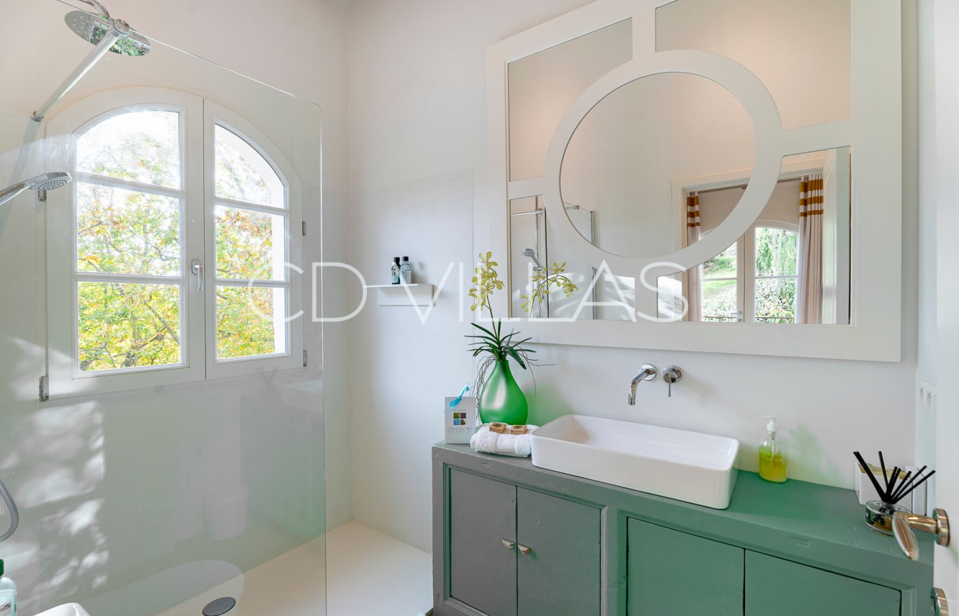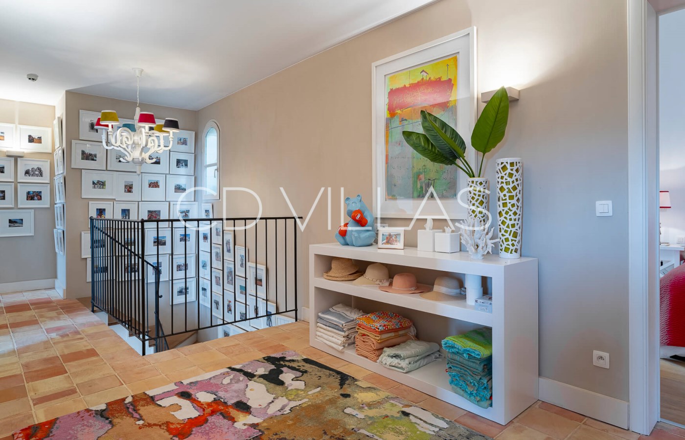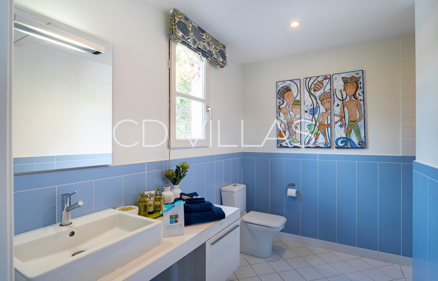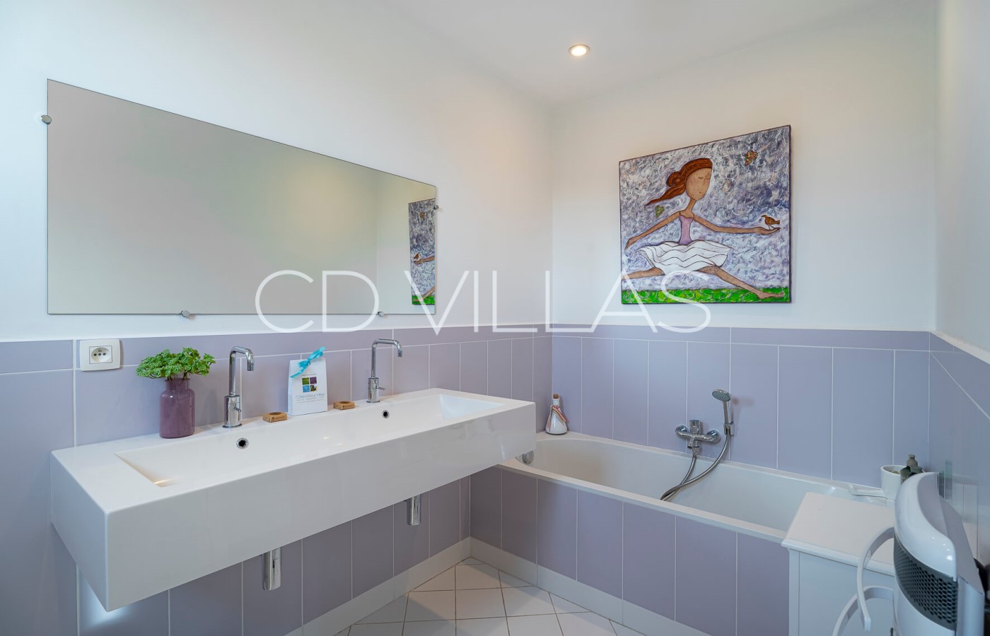 The villa is south facing and built on two levels, with wonderful, open plan living spaces, a modern fully equipped kitchen and comfy living room with floor to ceiling picture windows to enjoy the views over the countryside towards the sea. Upstairs, there are four bedrooms, two doubles and two twins, all air-conditioned with en-suite bathroom or shower room. Light and spacious, the villa has been tastefully decorated in neutral stone tones with modern fixtures and furnishings. The fifth bedroom with en suite shower room is accessed via steps leading up from the office area, adjacent to the living room.
