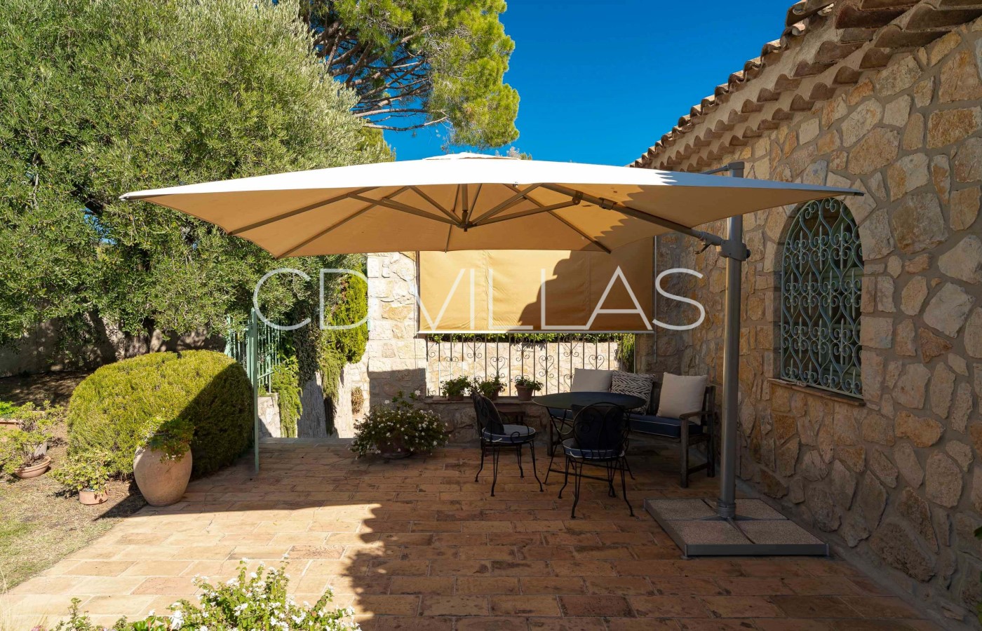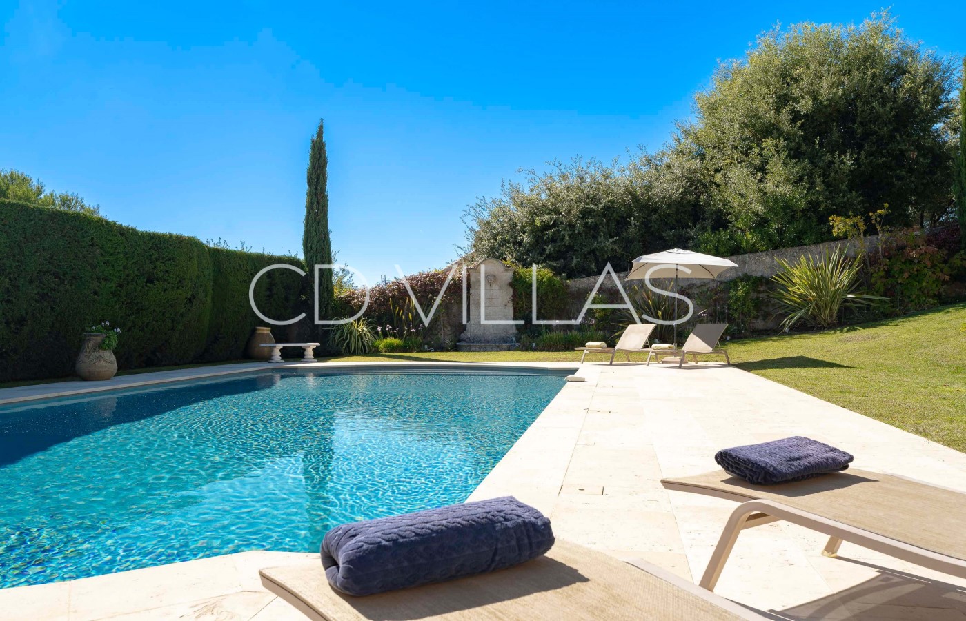 Outside, the villa truly comes into its own. A 16m saline swimming pool is set within a beautifully maintained, much-loved garden, with sun loungers and parasols creating an inviting space for long, lazy days by the water. A barbecue is available for relaxed al fresco dining, while the expansive lawn provides space for boules, table tennis or informal family games.