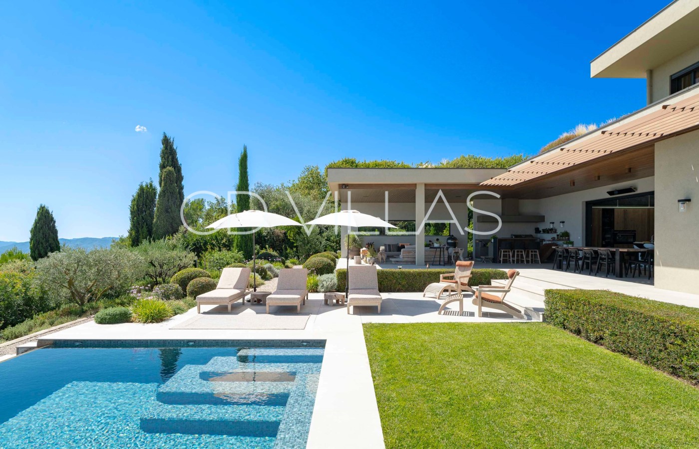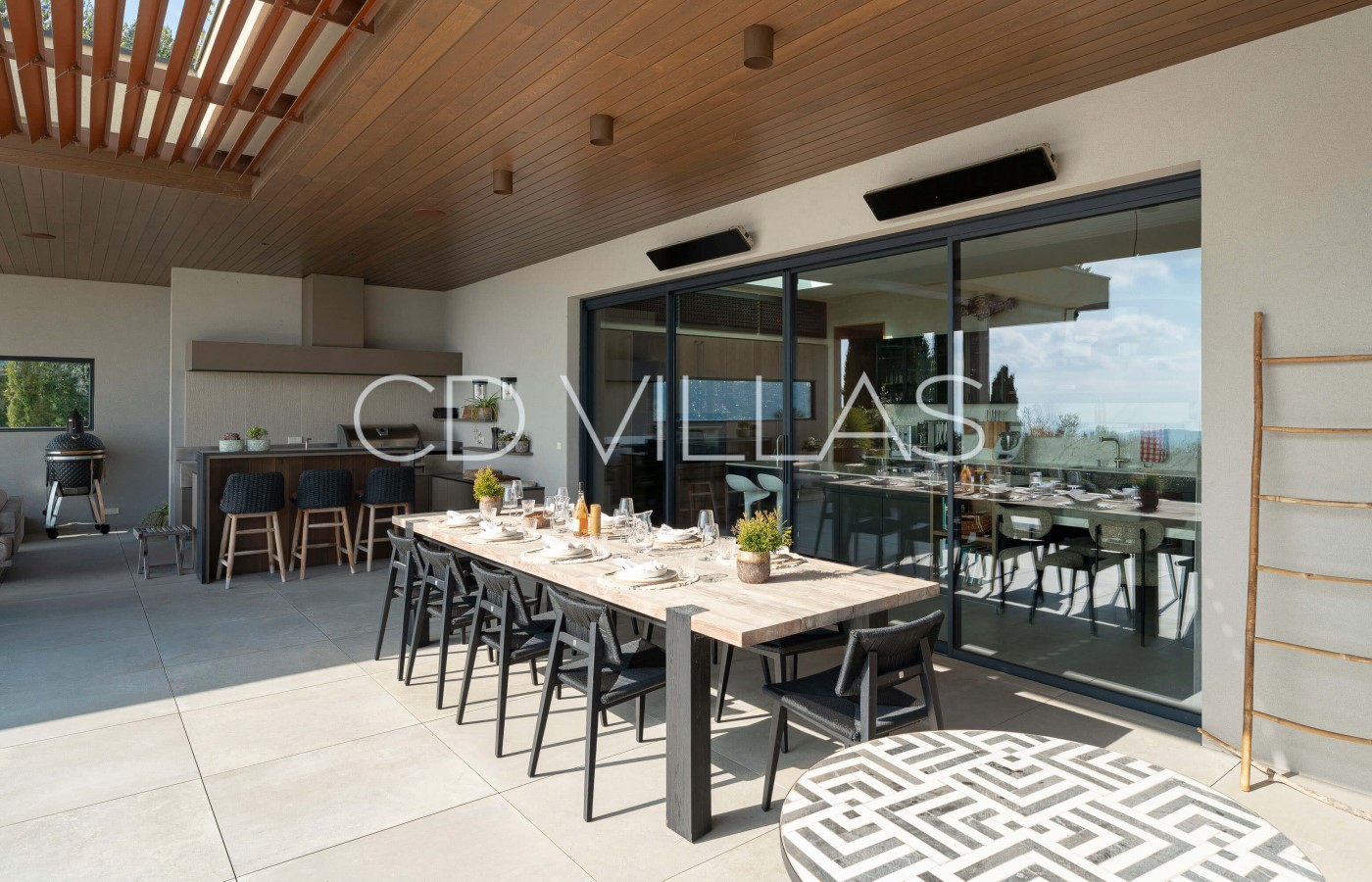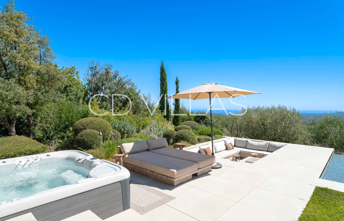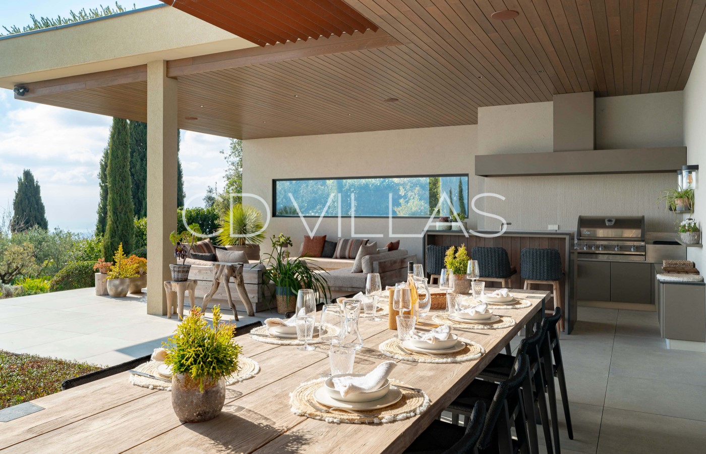 The exceptional outdoor living areas offer a true and luxury South of France holiday experience. There is a large infinity pool completed with a beautiful fire pit, a large covered outdoor dining area with fully equipped kitchen (gaz BBQ / Pizza oven / Plancha / Green Egg BBQ). A Sonos installation is available for the exterior living spaces. Outdoor shower also available.