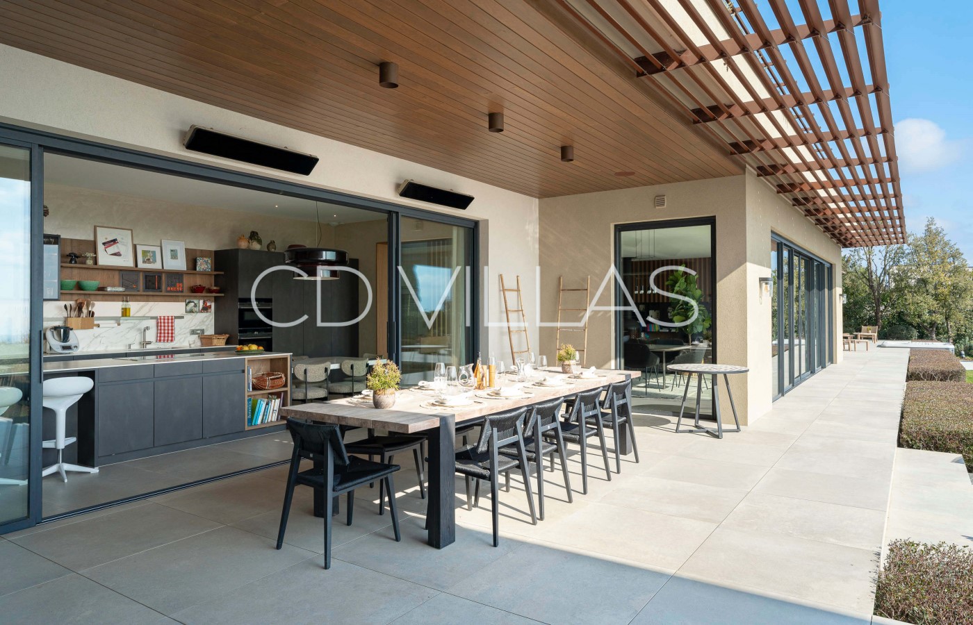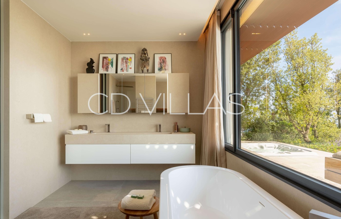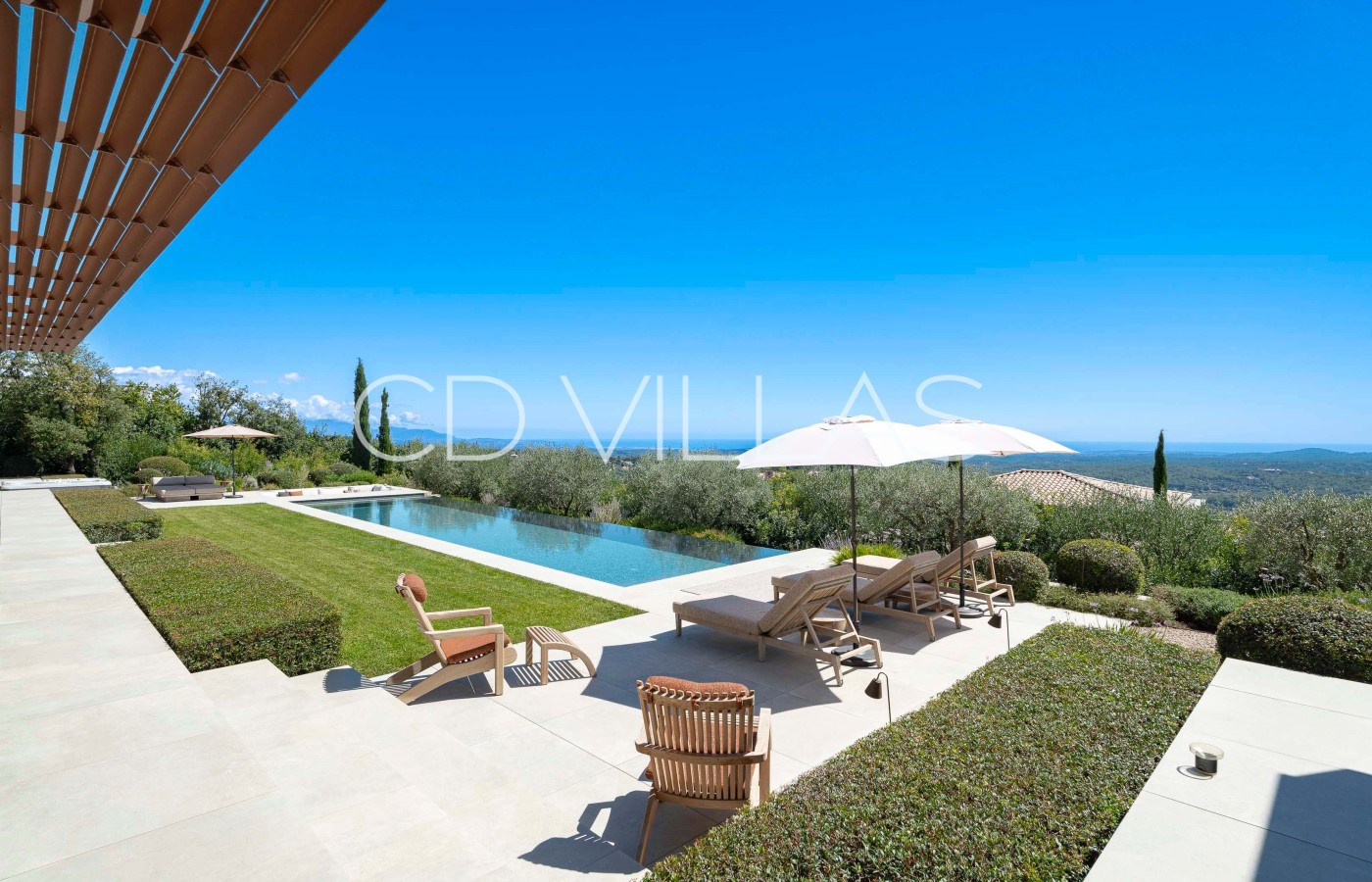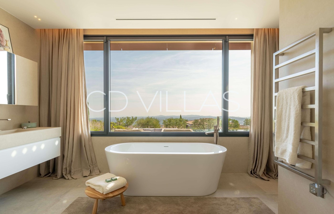 The exceptional outdoor living areas offer a true and luxury South of France holiday experience. There is a large infinity pool completed with a beautiful fire pit, a large covered outdoor dining area with fully equipped kitchen (gaz BBQ / Pizza oven / Plancha / Green Egg BBQ). A Sonos installation is available for the exterior living spaces. Outdoor shower also available.
