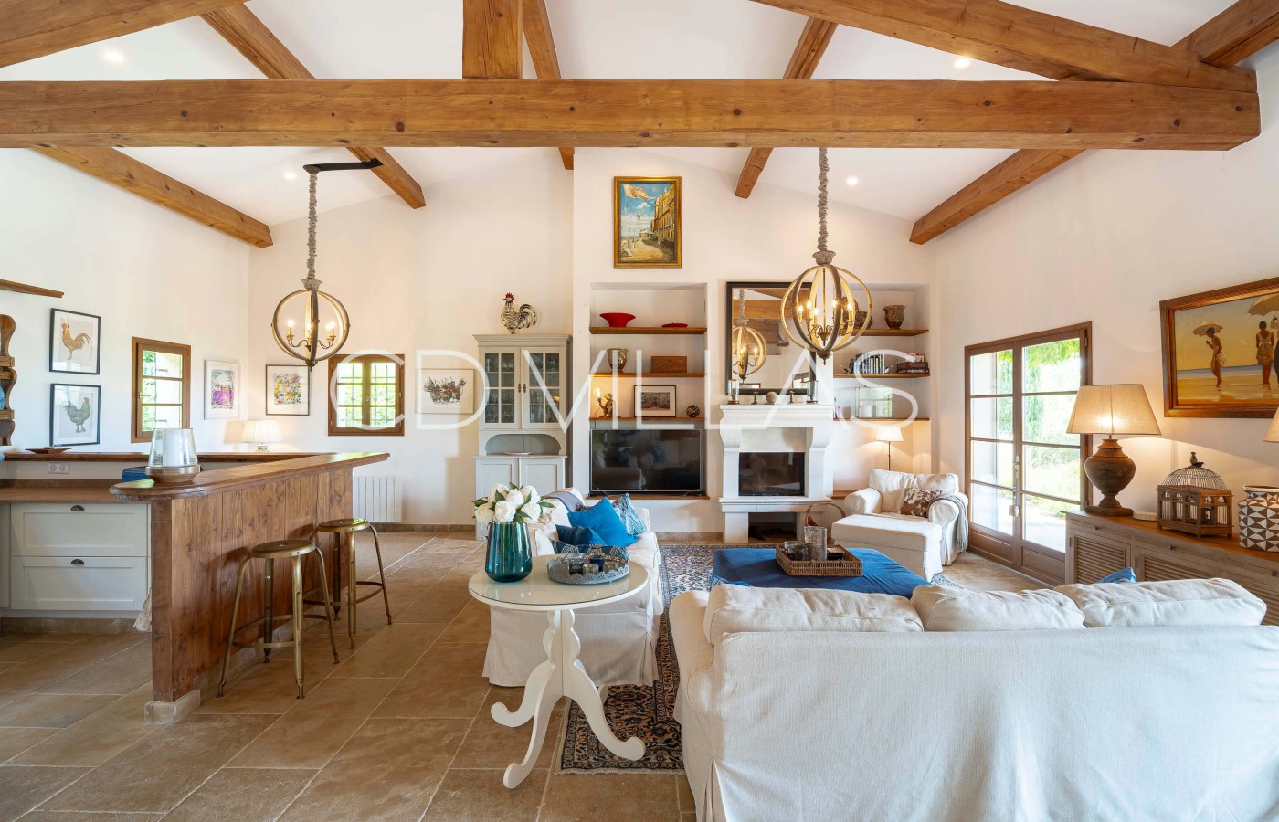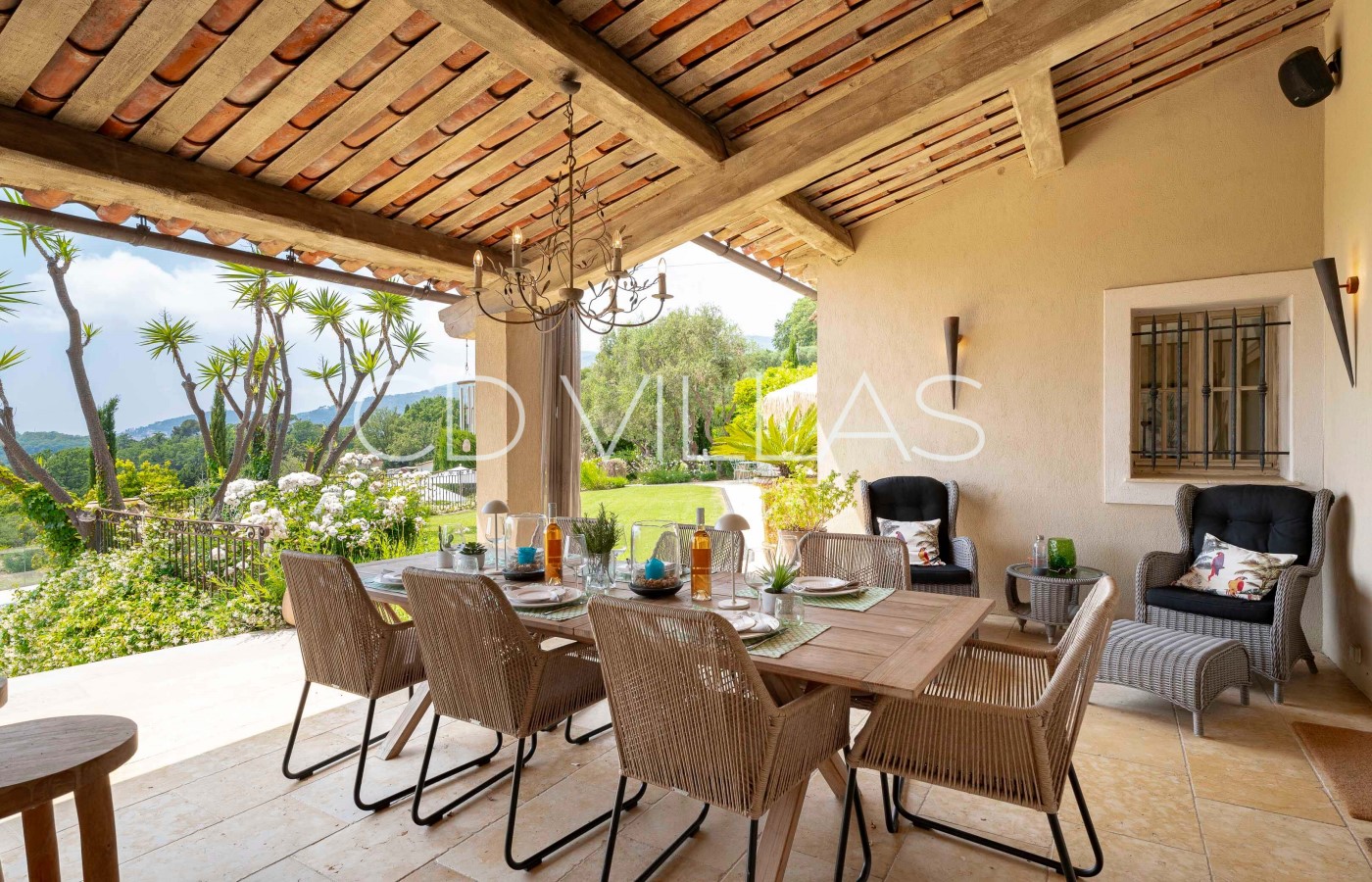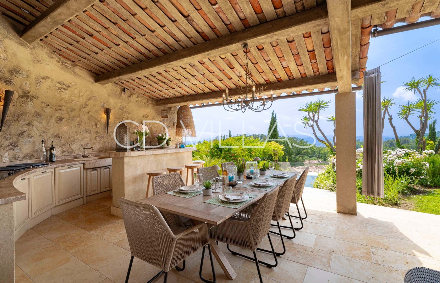The main entry opens to the entry hall and lovely decorated living area, all with French window doors opening to the garden with views. The dining area leads through to the spacious and well-equipped kitchen with breakfast table, opening onto a large outdoor dining terrace, where unforgettable meals can be enjoyed with sweeping views over the natural landscape and out to the sea.