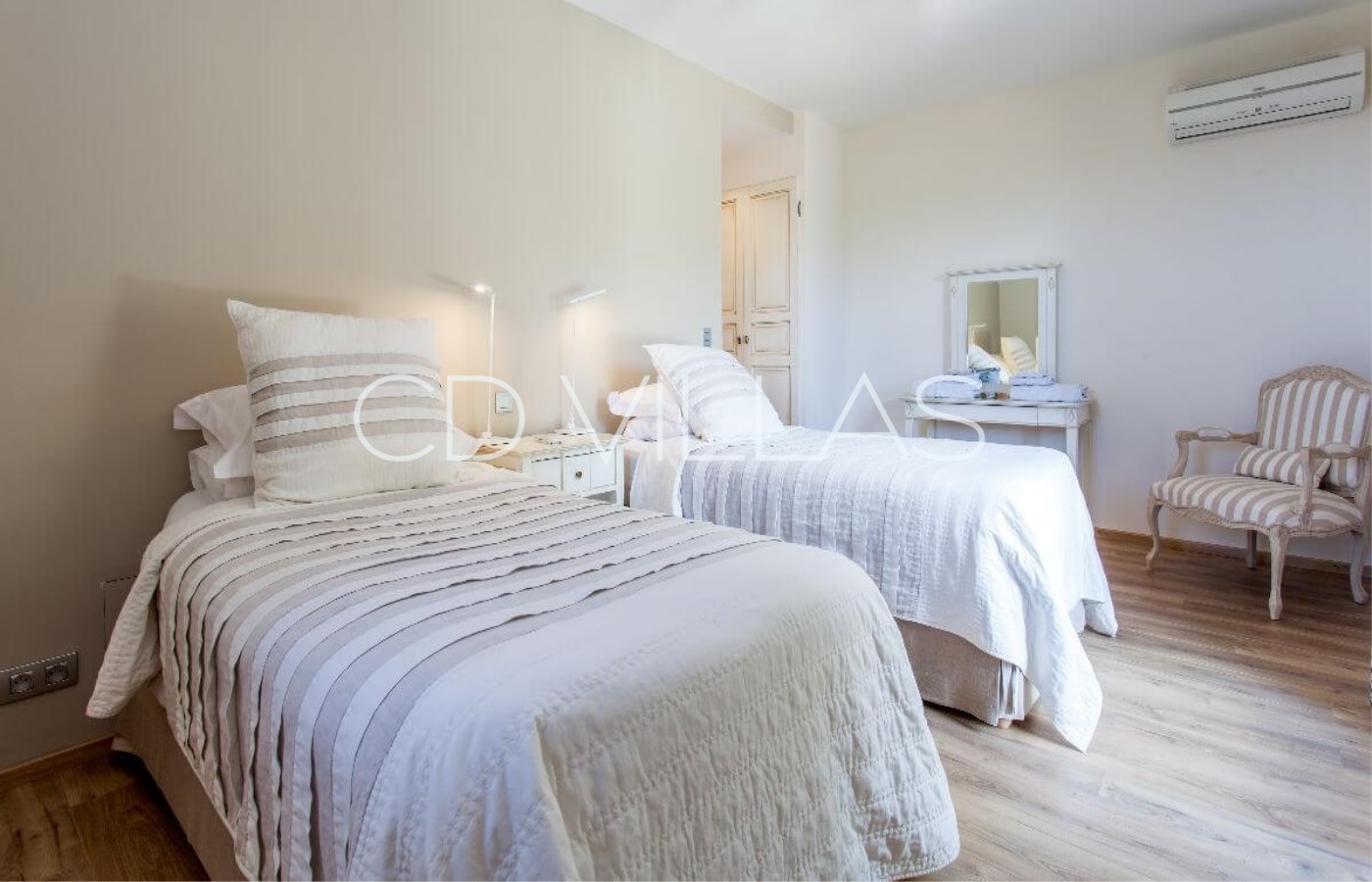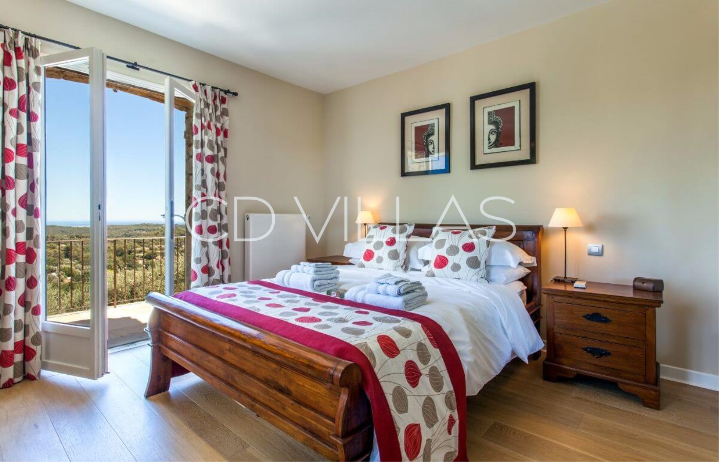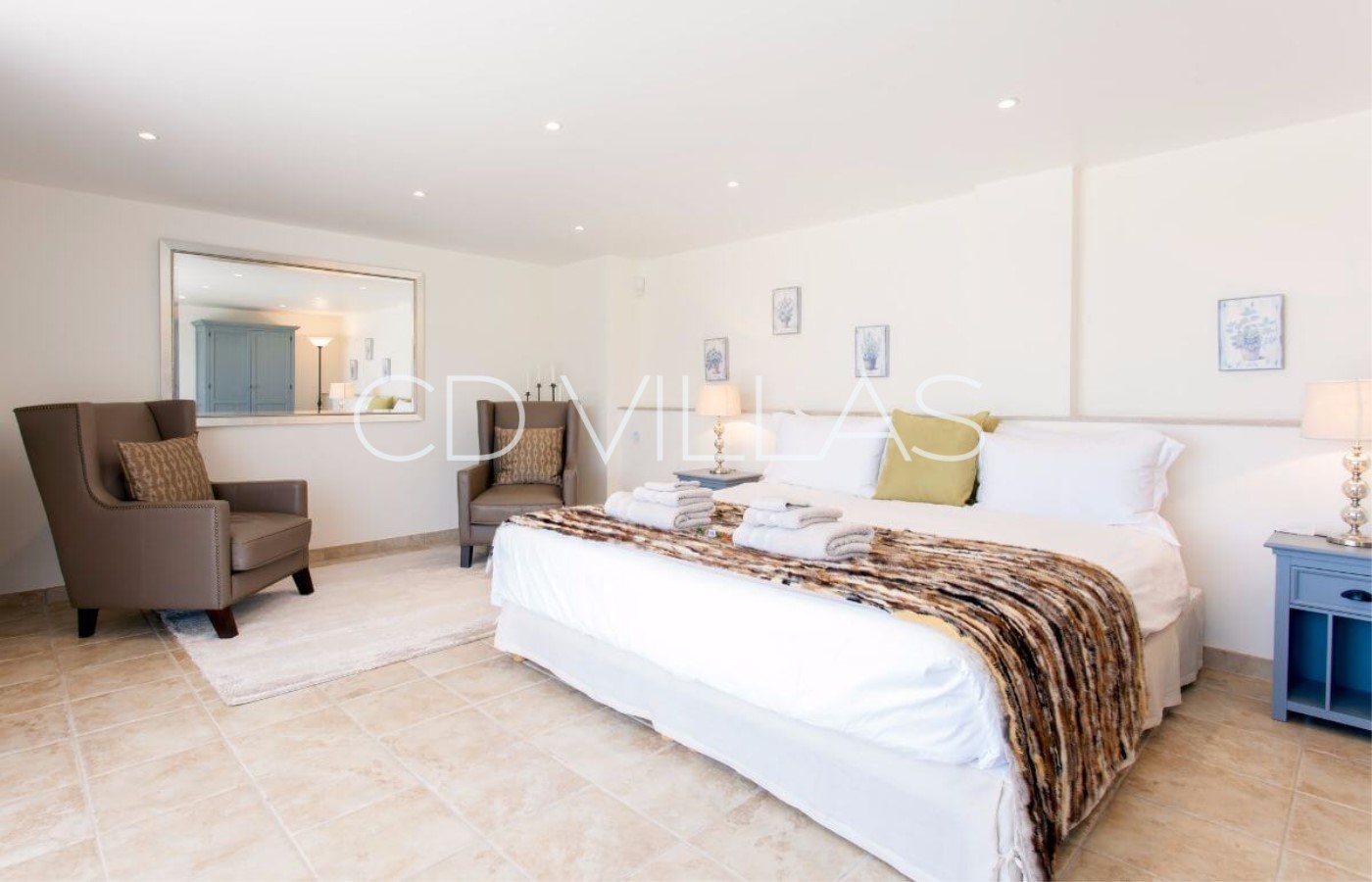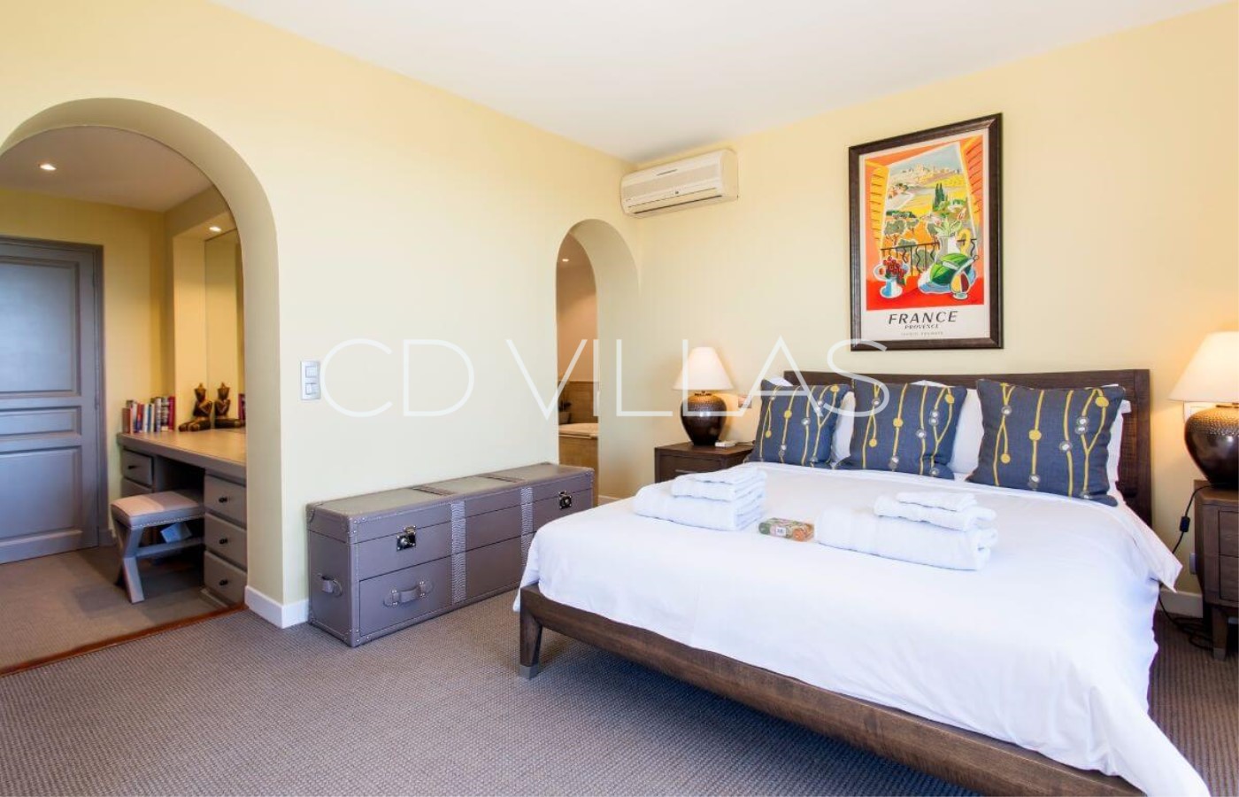 The villa offers five beautifully appointed bedrooms, each with generous double or twin beds and en-suite bathrooms. On the lower ground floor, there is an air-conditioned room with a sofa bed for two, allowing the house to comfortably accommodate up to 12 guests; although this room has no en-suite, there are two guest WCs available within the villa. Additionally, a separate guest house provides two more bedrooms, both with en-suite bathrooms, ideal for extra privacy or extended families.