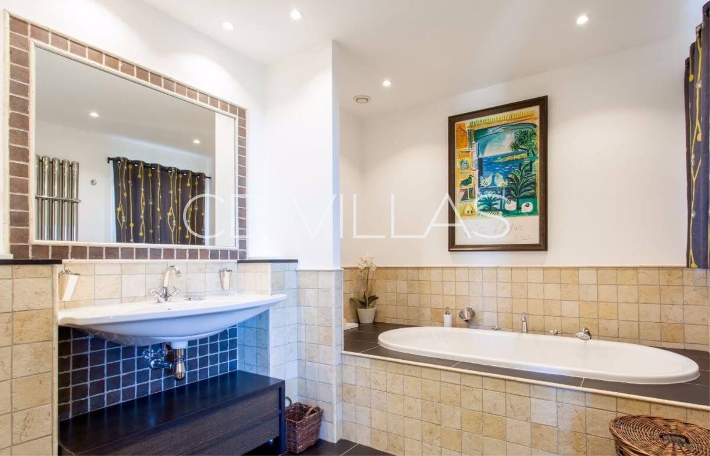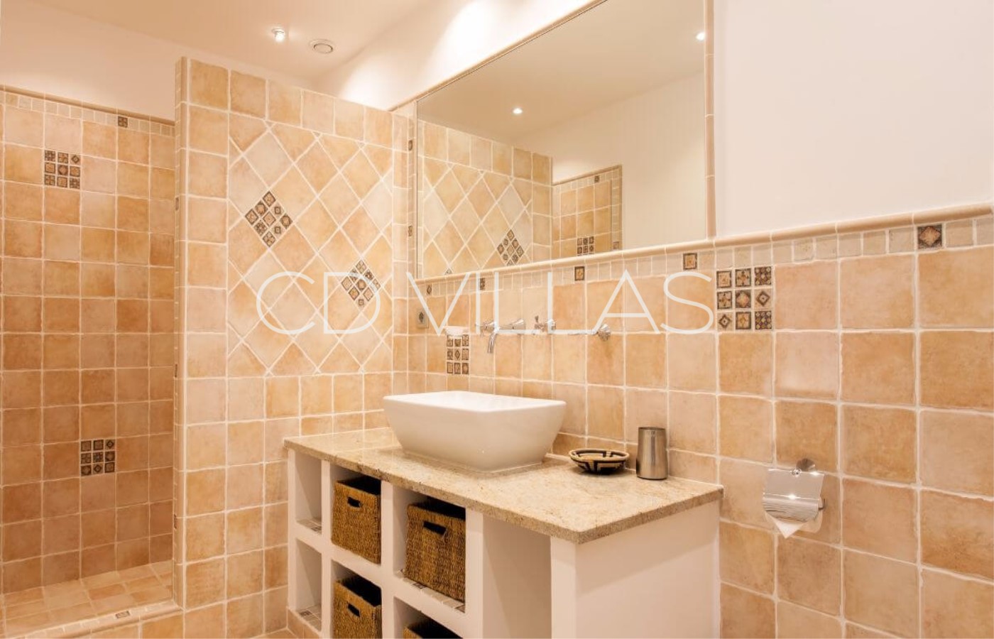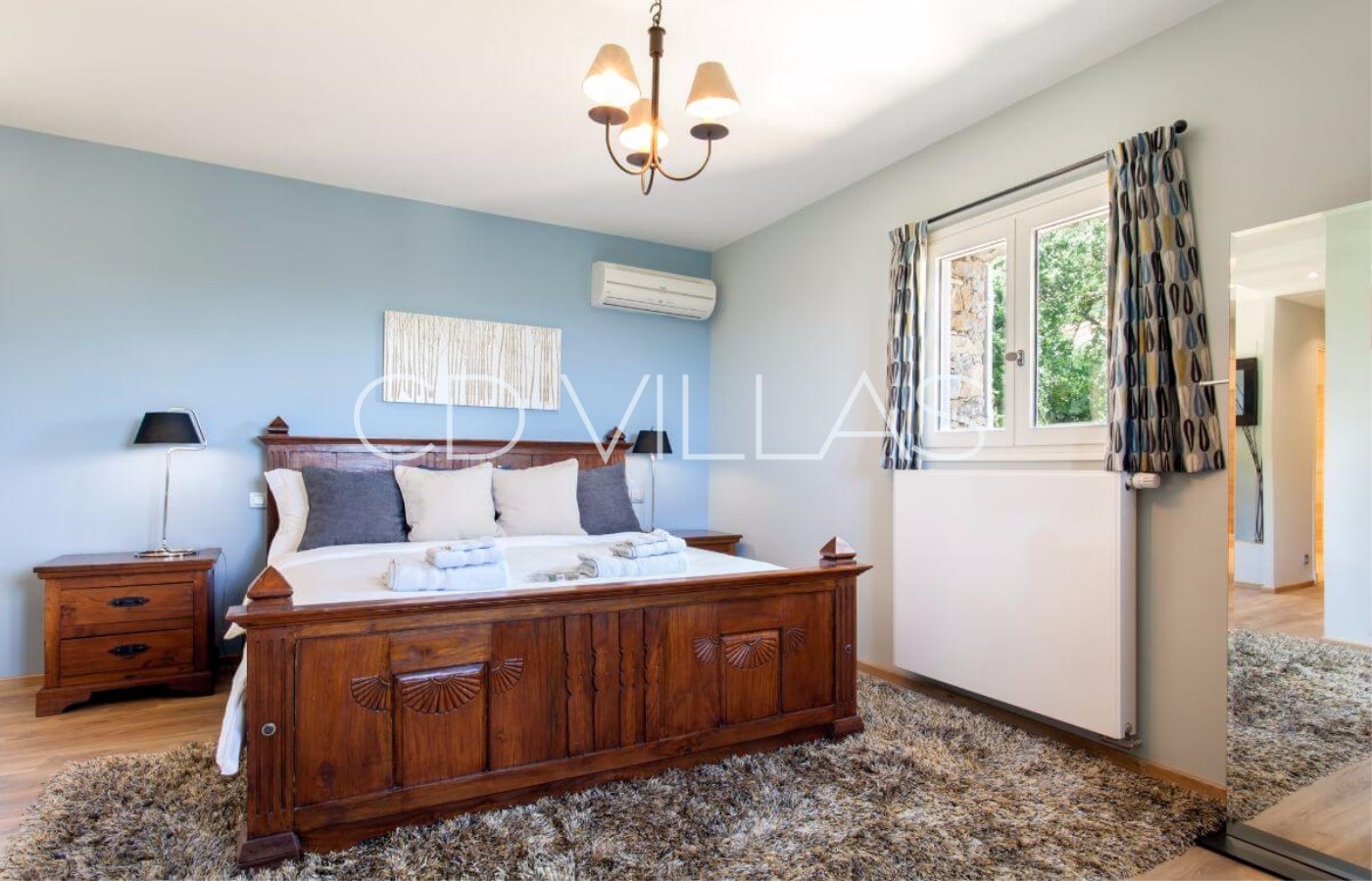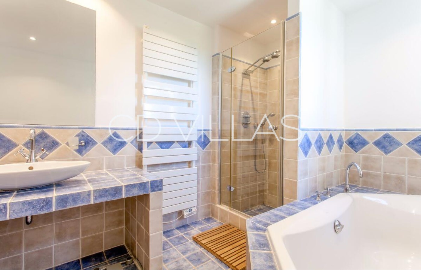 The villa offers five beautifully appointed bedrooms, each with generous double or twin beds and en-suite bathrooms. On the lower ground floor, there is an air-conditioned room with a sofa bed for two, allowing the house to comfortably accommodate up to 12 guests; although this room has no en-suite, there are two guest WCs available within the villa. Additionally, a separate guest house provides two more bedrooms, both with en-suite bathrooms, ideal for extra privacy or extended families.
