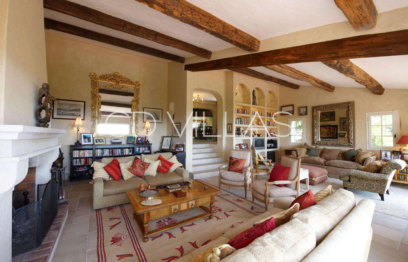Living Room - The sitting room is a large, open-plan space, with one seating area centred around the log fireplace and the other round the television and library. It has a magnificent panoramic view stretching over 60kms of coastline from Eze to La Napoule. The French windows retract so the room opens up onto the sea view terrace which provides an ideal area for entertaining. There is also a Roland electric piano.