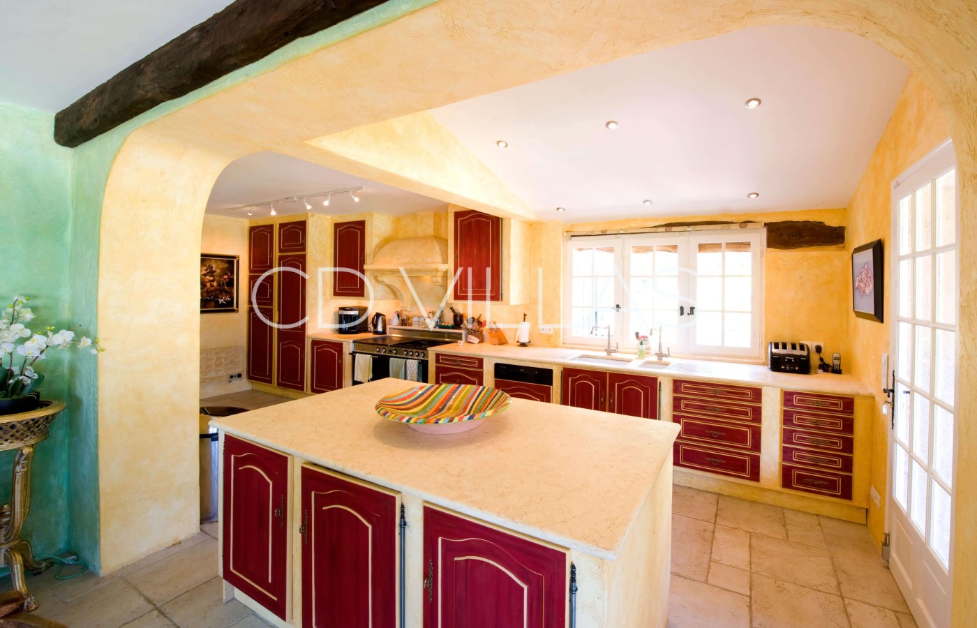 Kitchen - The open-plan Provencale rustic marble kitchen includes a five-burner range and two full-size electric ovens, a fridge, microwave and dishwasher. The large central island incorporates red and white wine chiller cabinets and a commercial ice machine in addition to an American-style fridge-freezer with ice machine. There is also a gas barbecue on the terrace outside the dining room.