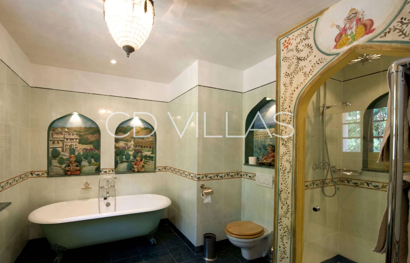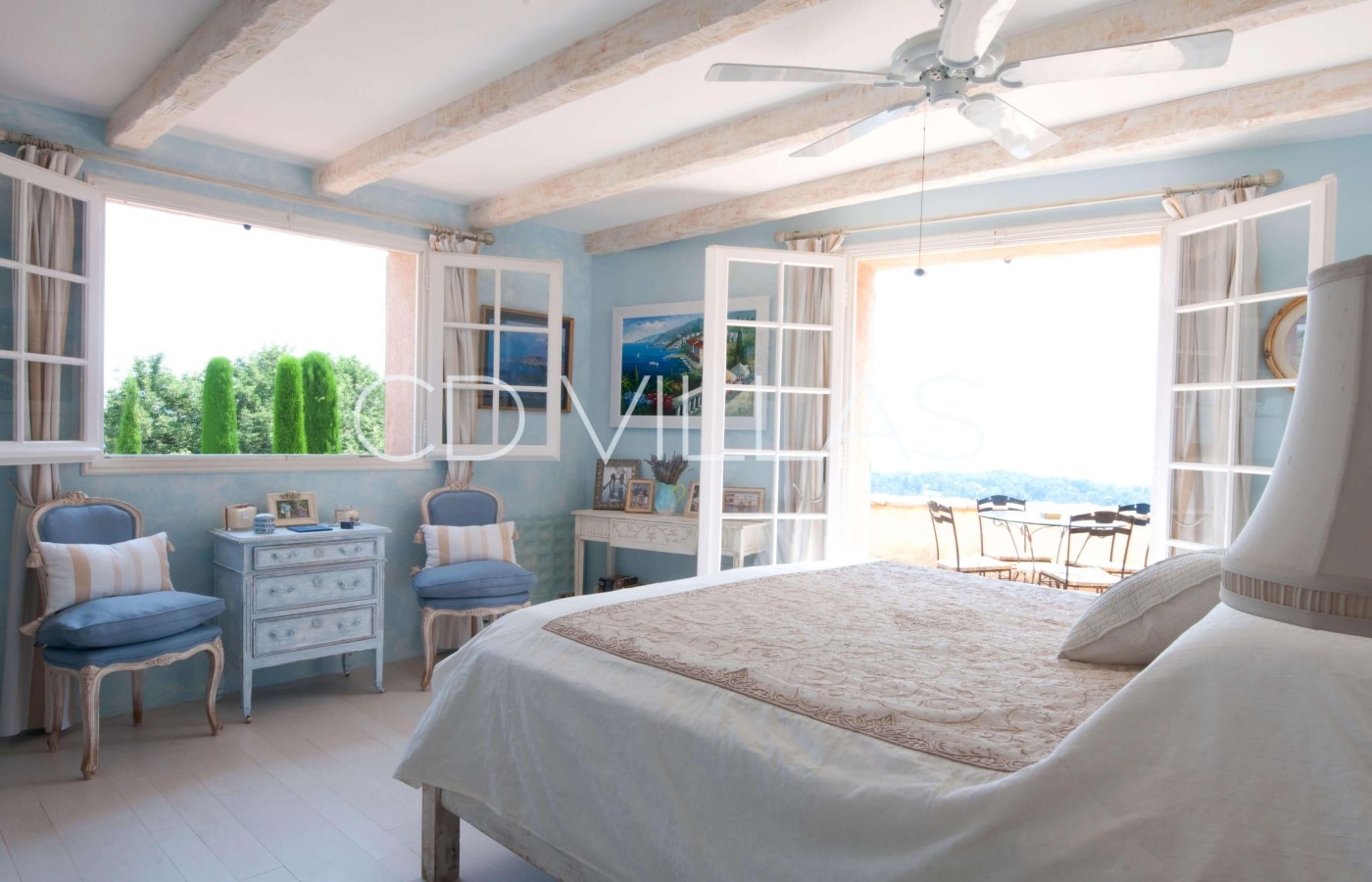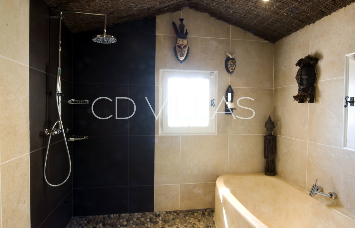 Provence (Master) reflects the blue light of the surrounding countryside and has its own private terrace with stunning views. Morocco features hand-woven North African fabrics, hand carved chairs and brass ornaments, as well as an ornate blue-tiled shower room. Africa is decorated with carved furniture and wooden masks, and features a dramatic wet room with pebbled floor and reed vaulted ceiling. Arizona reflects the bright colours of the Arizona desert scenery and the bathroom has a traditional adobe bath. India features silver and enamel antique doors, ornate carved wood and bone furniture and hand-woven Kashmiri rugs. The traditional Indian marble and tiled bathroom is decorated with murals depicting views of India. Thailand is decorated with Thai artifacts featuring a reed covered ceiling, dark wood and white walls.