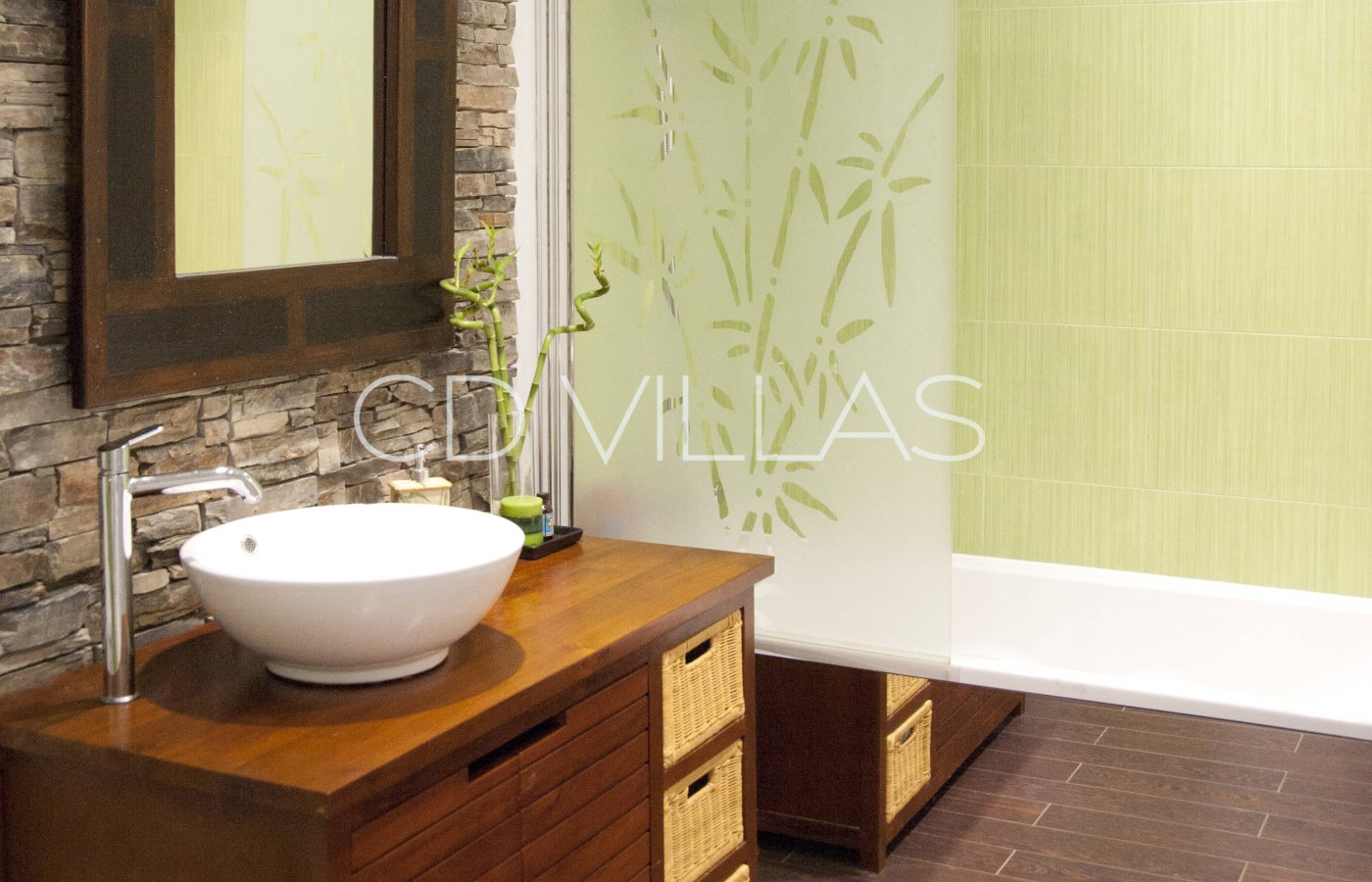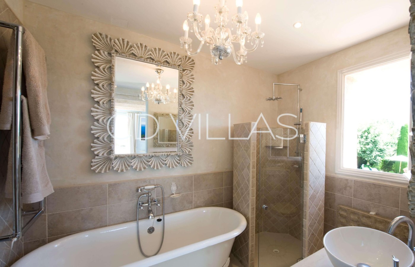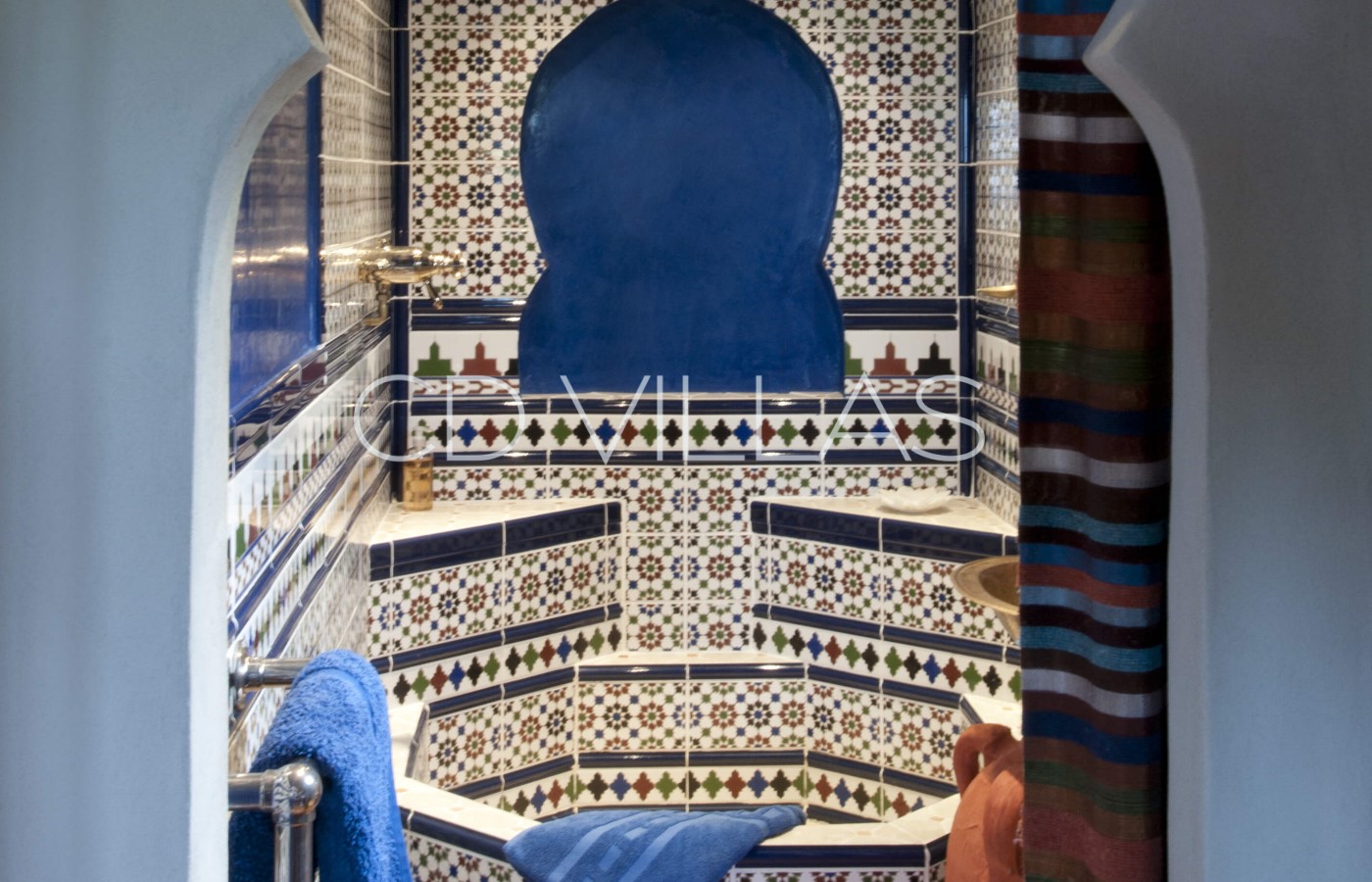 Provence (Master) reflects the blue light of the surrounding countryside and has its own private terrace with stunning views. Morocco features hand-woven North African fabrics, hand carved chairs and brass ornaments, as well as an ornate blue-tiled shower room. Africa is decorated with carved furniture and wooden masks, and features a dramatic wet room with pebbled floor and reed vaulted ceiling. Arizona reflects the bright colours of the Arizona desert scenery and the bathroom has a traditional adobe bath. India features silver and enamel antique doors, ornate carved wood and bone furniture and hand-woven Kashmiri rugs. The traditional Indian marble and tiled bathroom is decorated with murals depicting views of India. Thailand is decorated with Thai artifacts featuring a reed covered ceiling, dark wood and white walls.