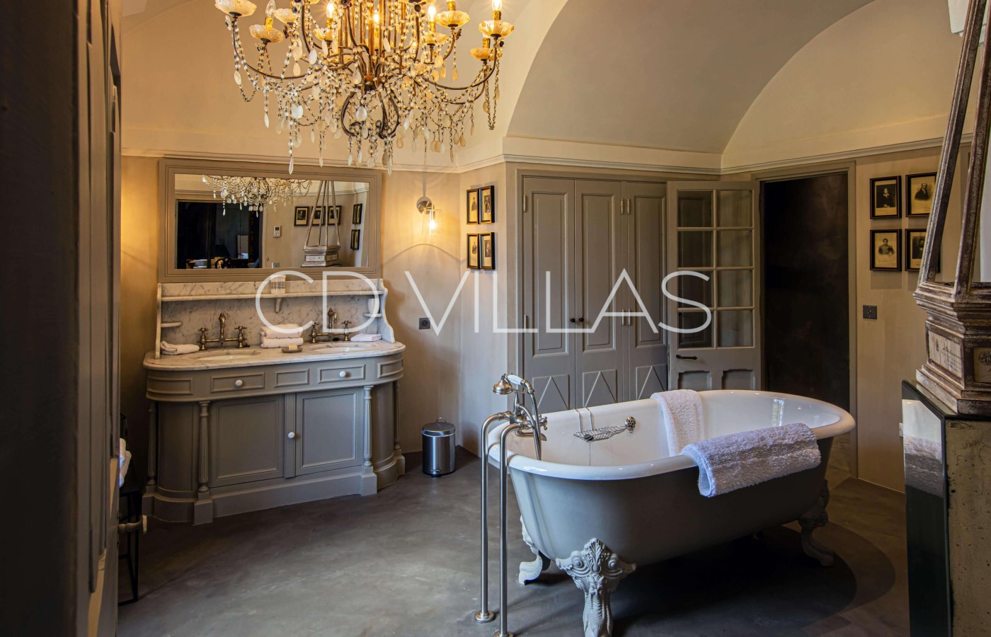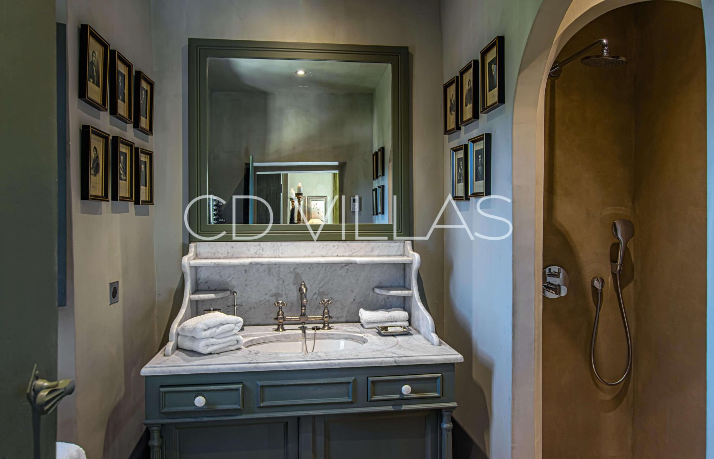 There are 6 stylish bedrooms with ensuite bathrooms on the first floor, all lavishly decorated with velvet soft furnishings, chandeliers, gilded mirrors, and unique artwork. The top floor is taken up by the 100m² master bedroom with a lounge area, walk-in closet and large ensuite bathroom.