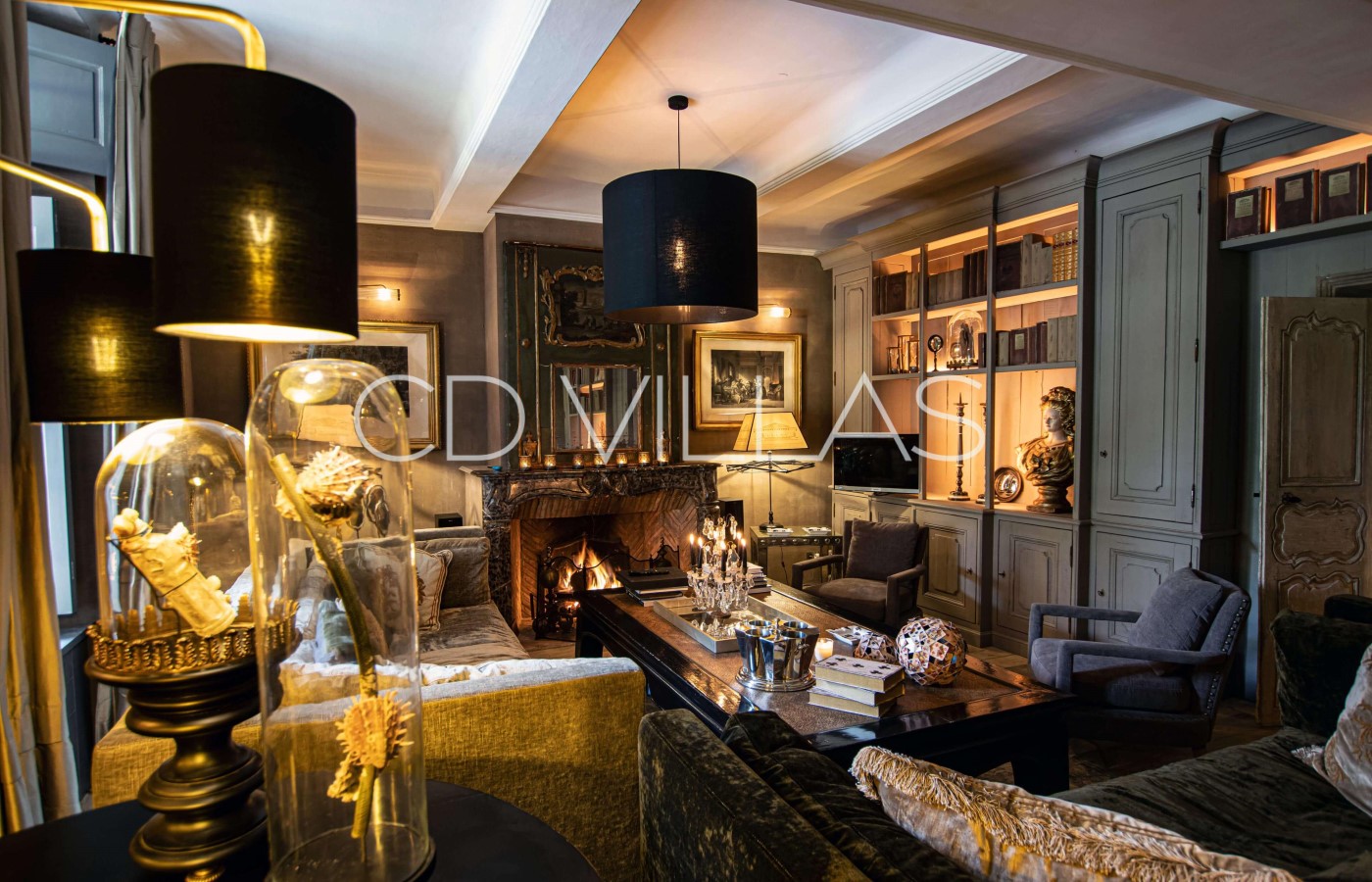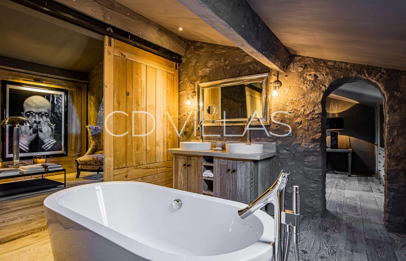 The ground floor houses a luxuriant living room with comfortable sofas, beautiful fireplace and access to the terrace and summer lounge, a large kitchen with state-of-the-art equipment and indoor charcoal BBQ, a sumptuous dining room with a grand fireplace for 12 guests, as well as a high tech cinema room.