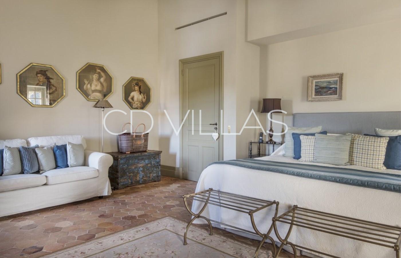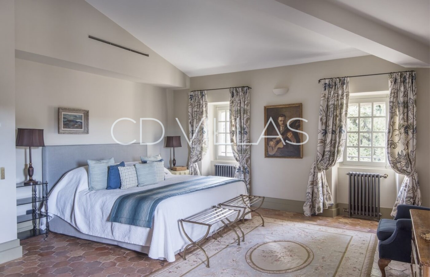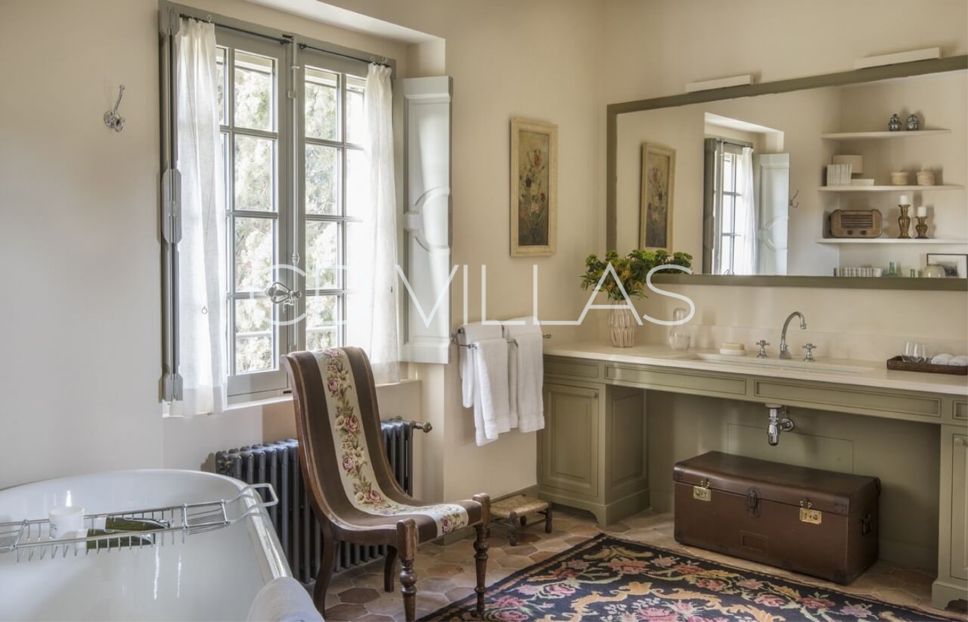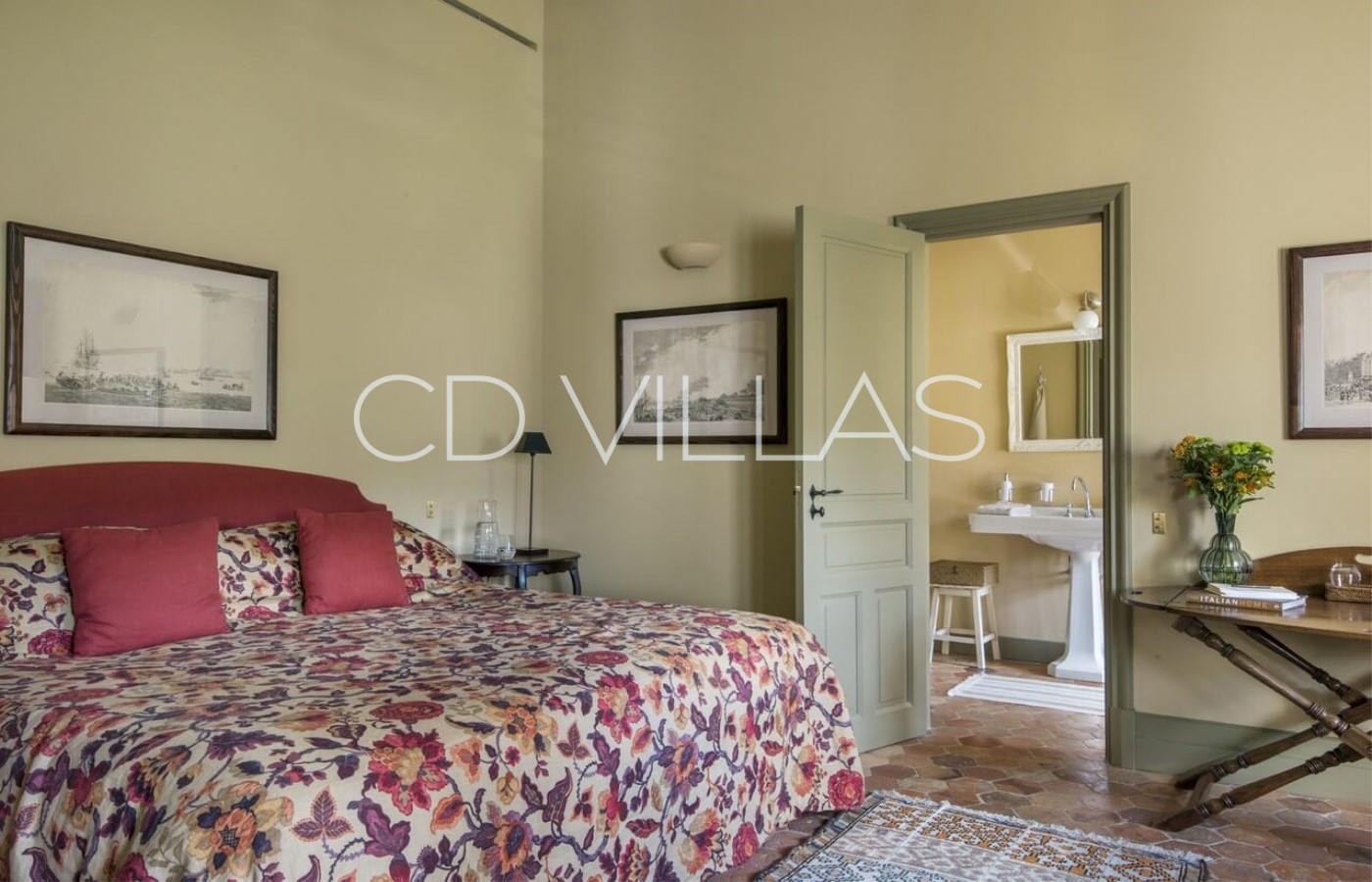 There are 2 bedrooms on the first floor: one 40m² suite with full ensuite bathroom, private terrace with garden views; one bedroom (40m²) with full ensuite bathroom, large fitted wardrobe and view of the fountain