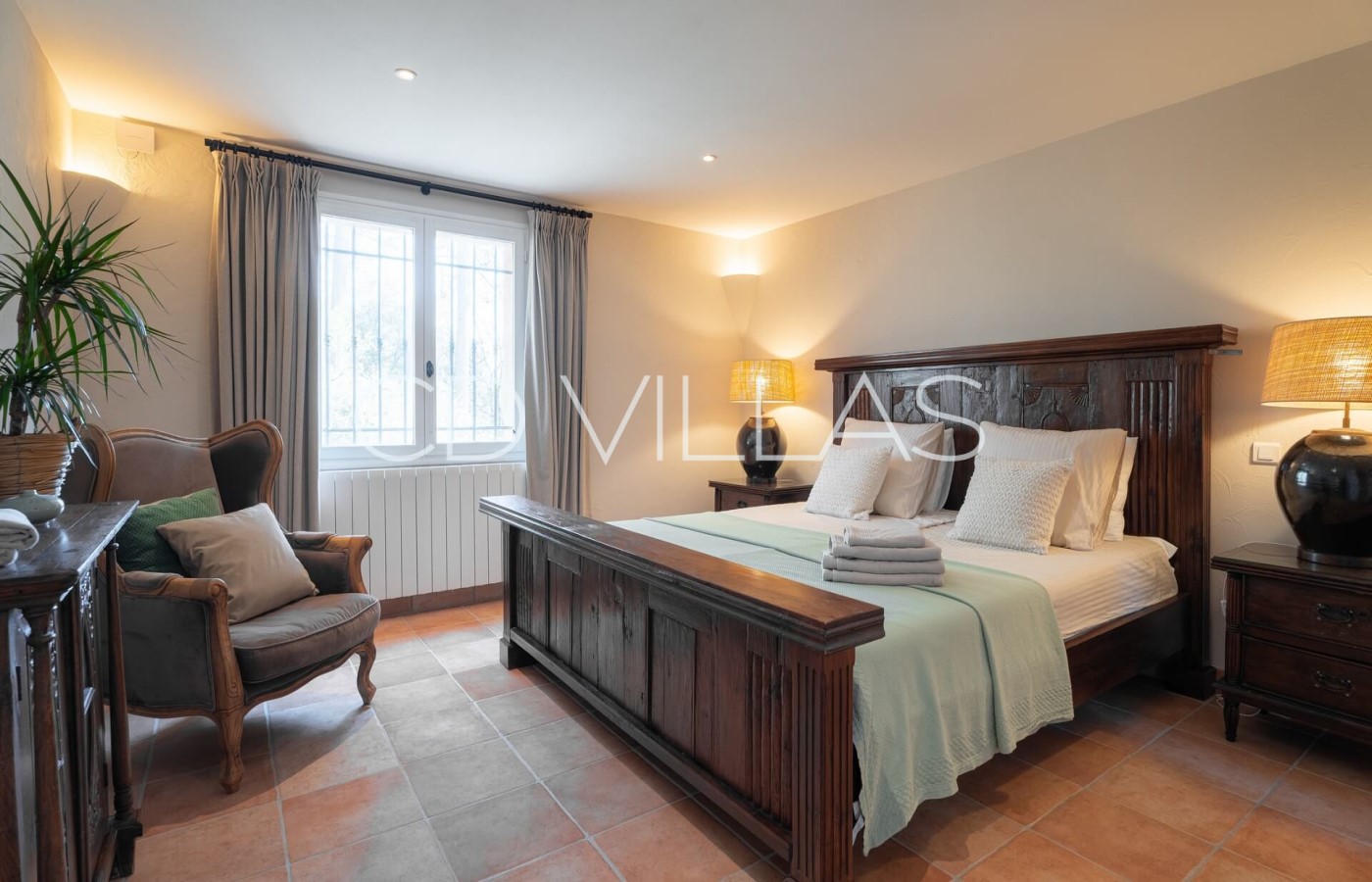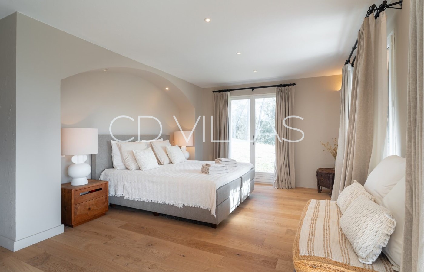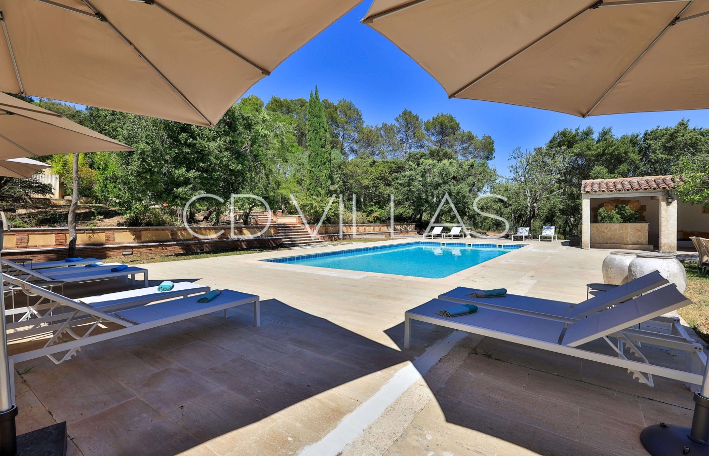 Moving forward to the beautiful outdoor spaces, you will enjoy the large pool (heated at additional cost) with an outdoor shower. The twelve sunbeds will offer relaxing sunbathing moments to each of the guests. The pool house has its own equipped kitchen with dishwasher, fridge, coffee machine…