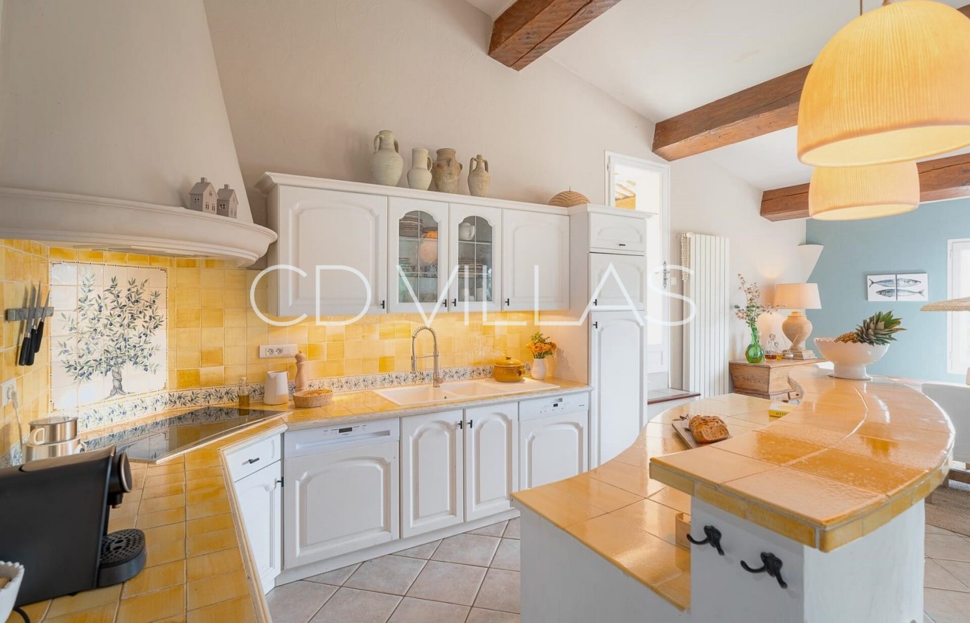 Ground floor offers an all-equipped kitchen adjacent to an outdoor terrace perfect for gatherings around a long table and BBQs.