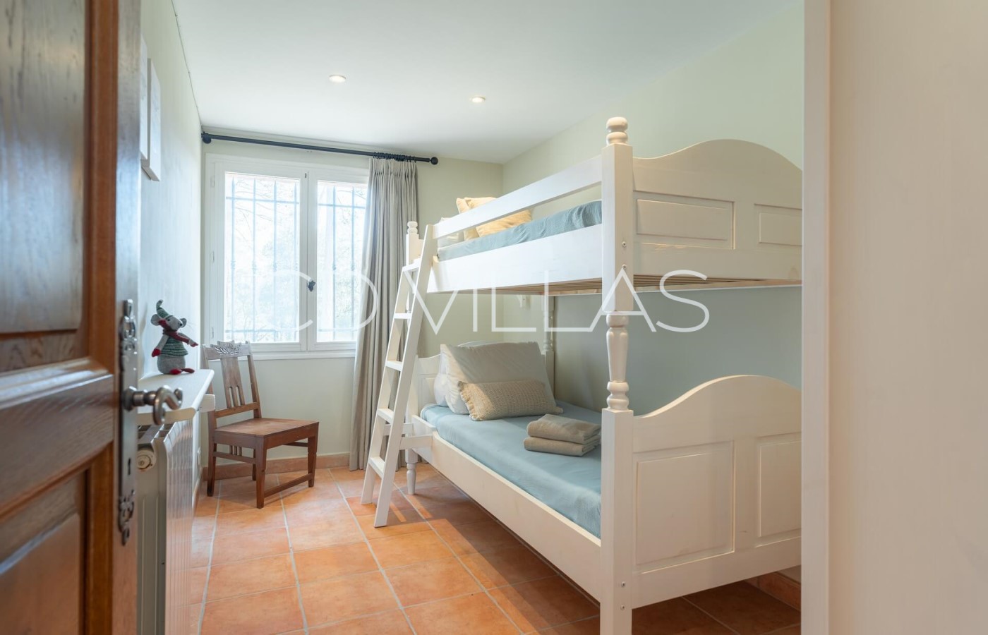On the lowest floor, two bedrooms offer direct access to the outside towards the pool. One with a large double bed, the other with two single beds. Both are sharing a bathroom.