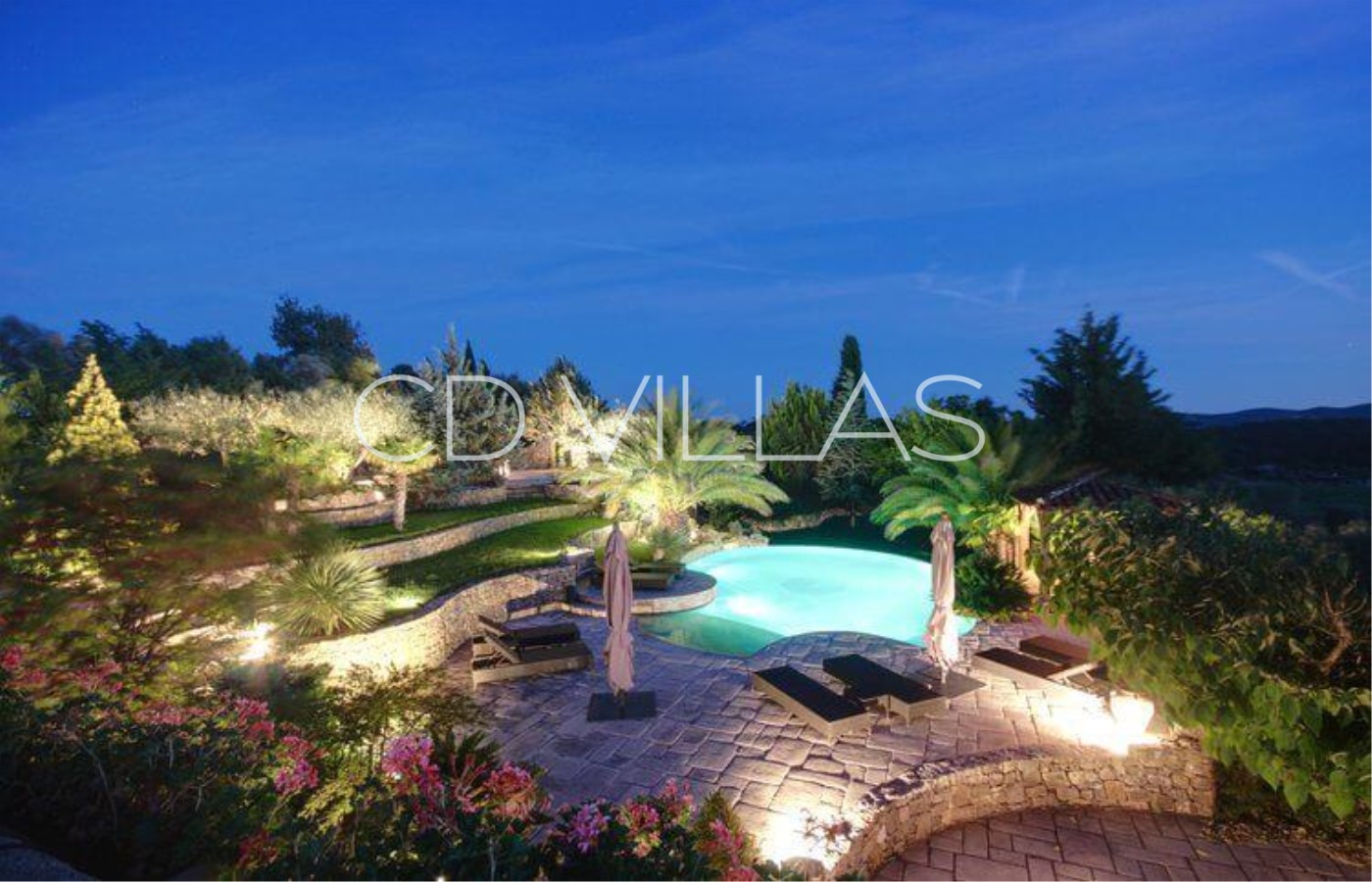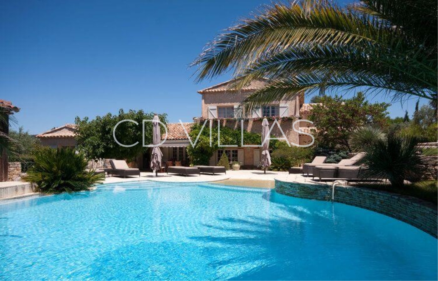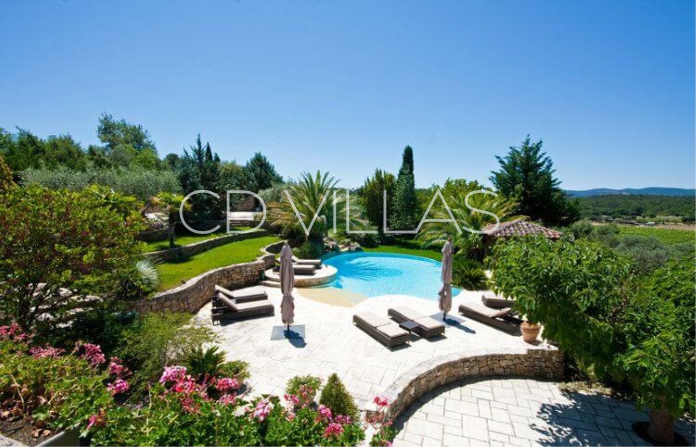 The lavish landscaped garden is terraced, housing a large free form heated pool, gazebo with a daybed to relax away from the heat. On the upper level, there is a large terrace, with mulberry trees, lounge area with a summer kitchen and a water feature filled with waterlilies and fish. A stone archway leads through to the much-used petanque court.