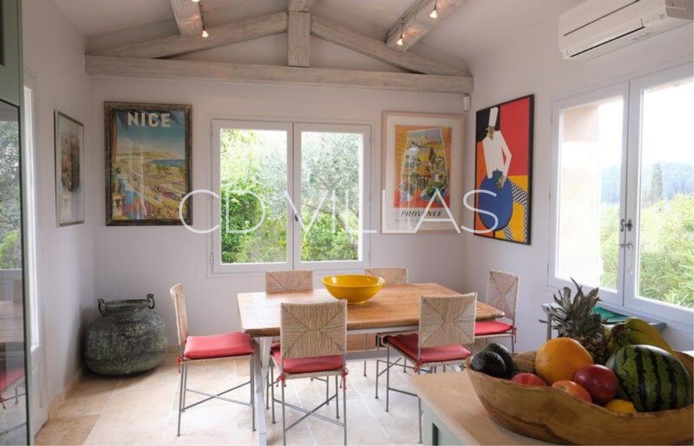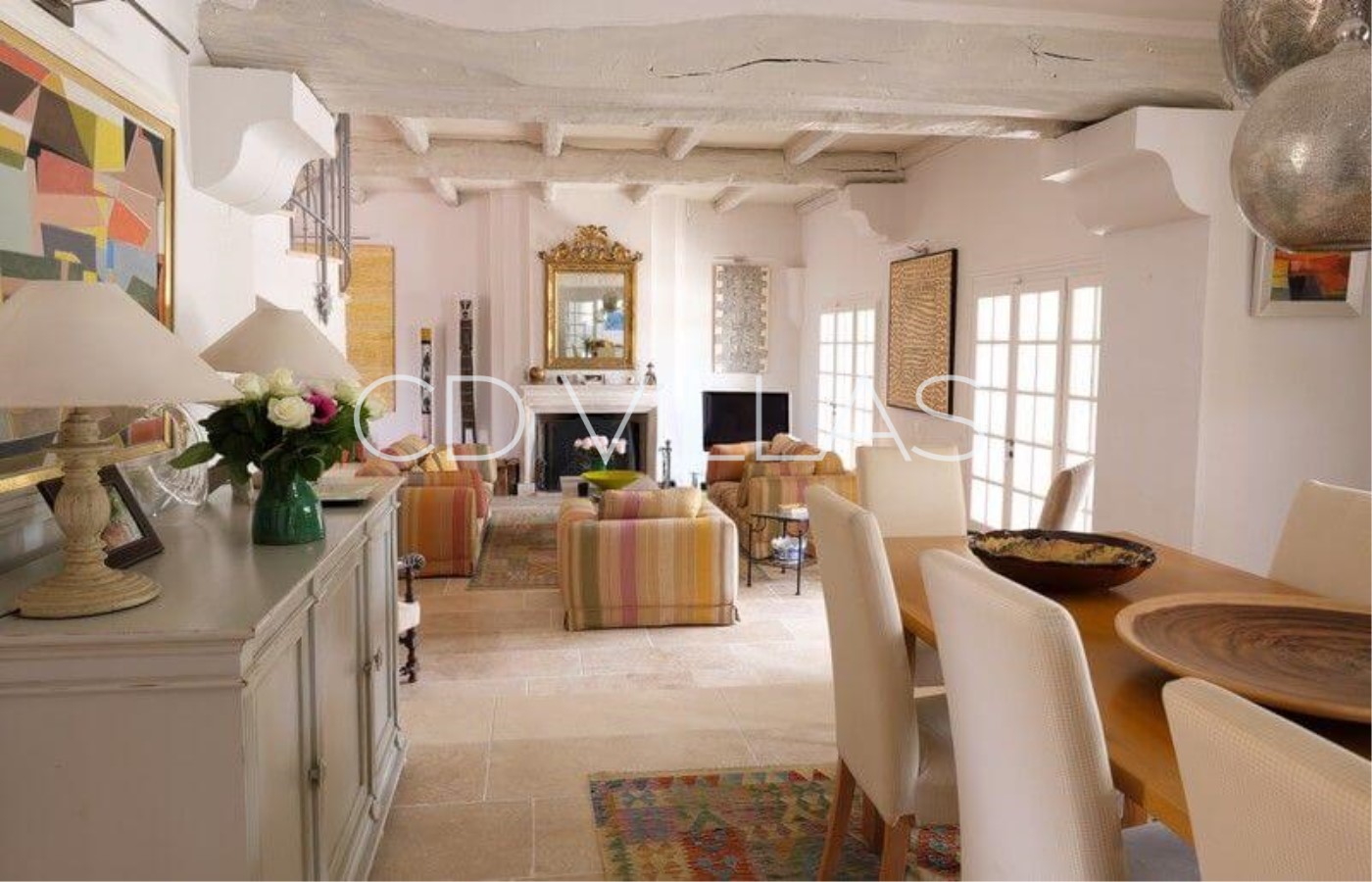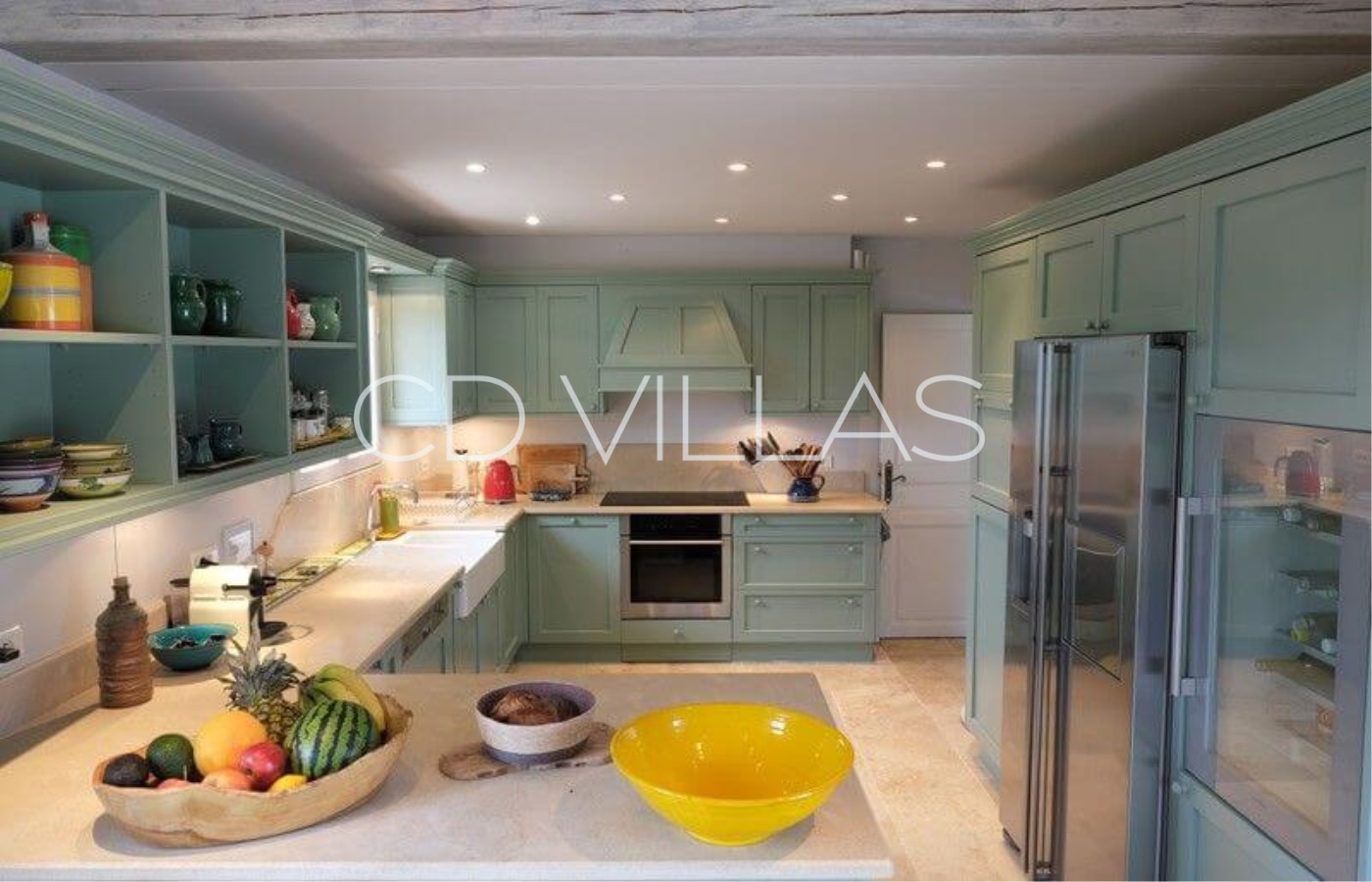 There is a spacious high-beamed living room with an open fireplace, a dining room that seats 8 guests, a study, laundry room with two washing machines and a well-equipped spacious kitchen.The kitchen has a breakfast table for 6 guests. The sitting room, dining room and kitchen open onto the outdoor covered dining area, and then onto the terrace, garden and pool.