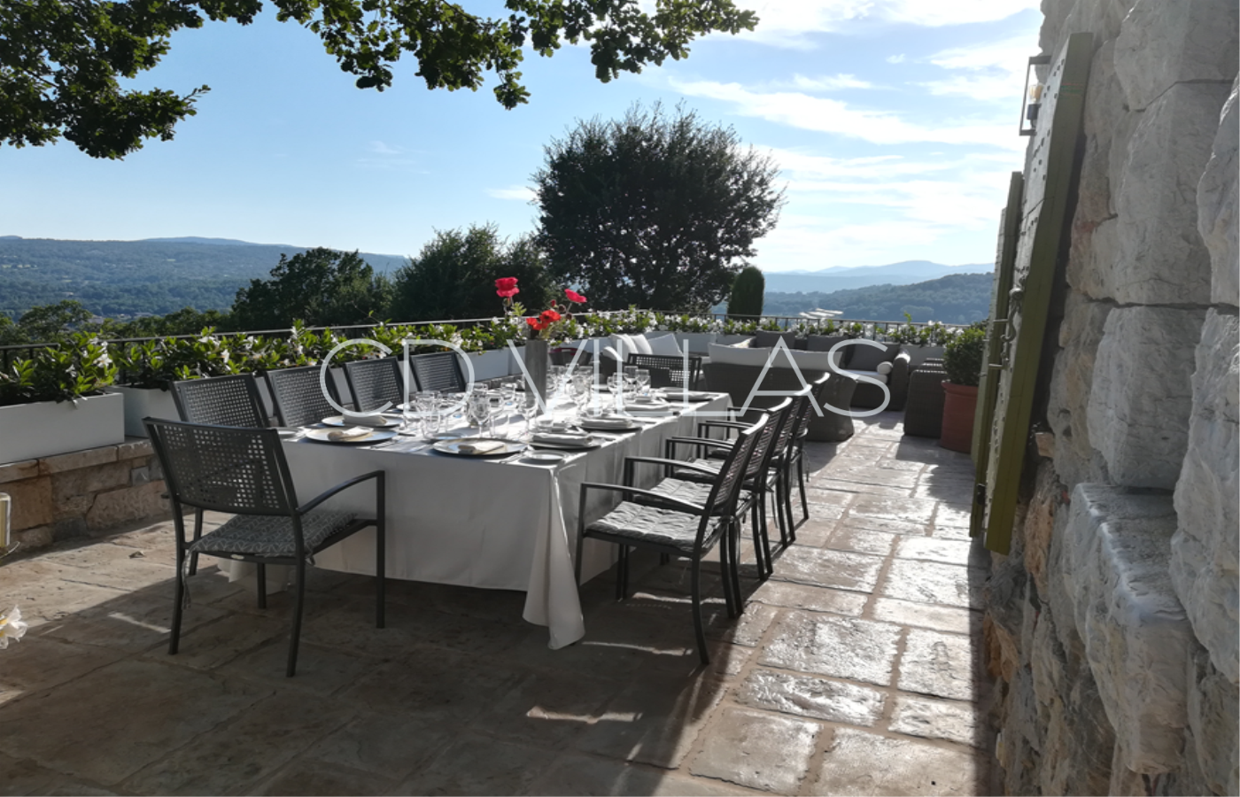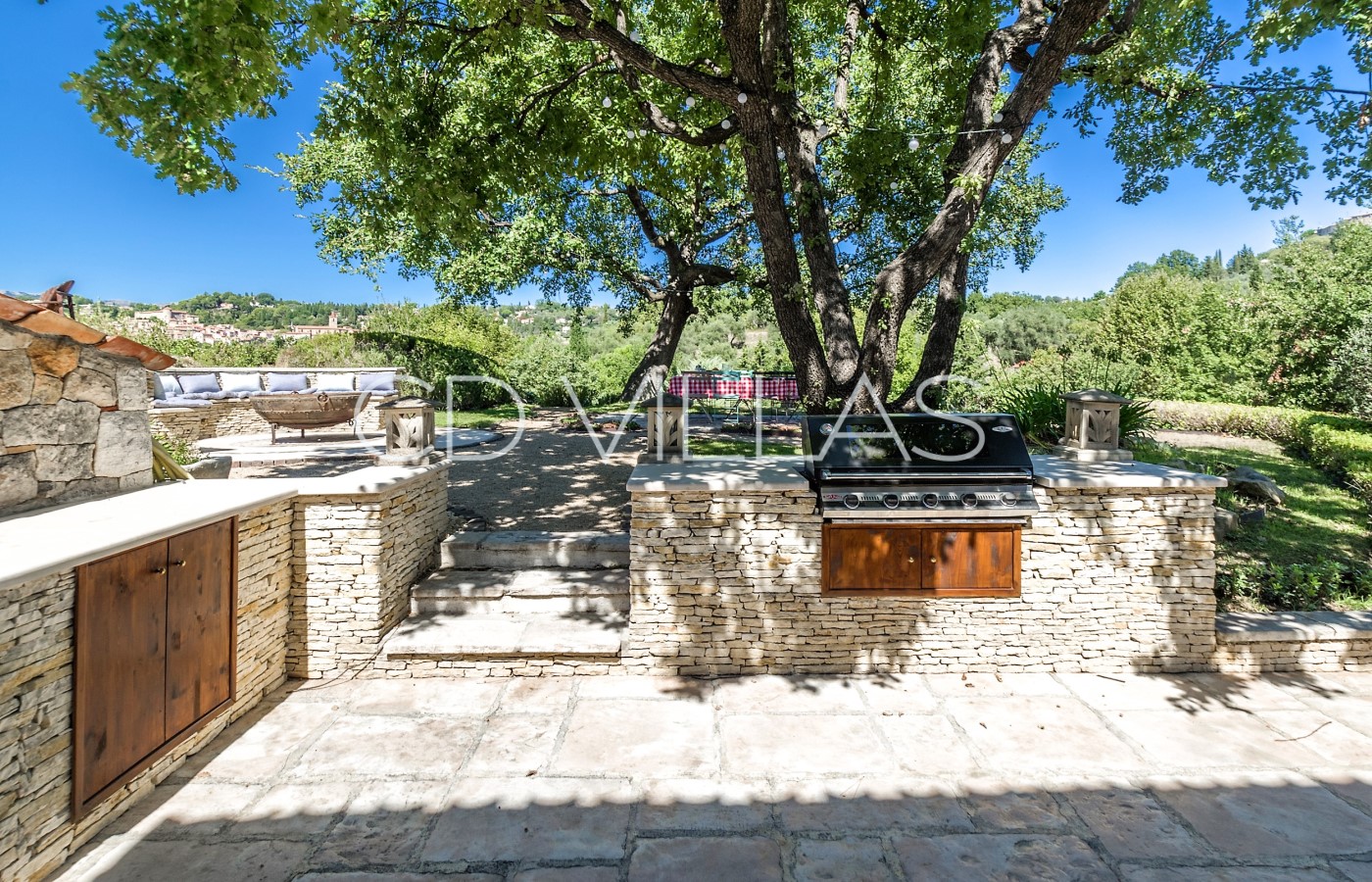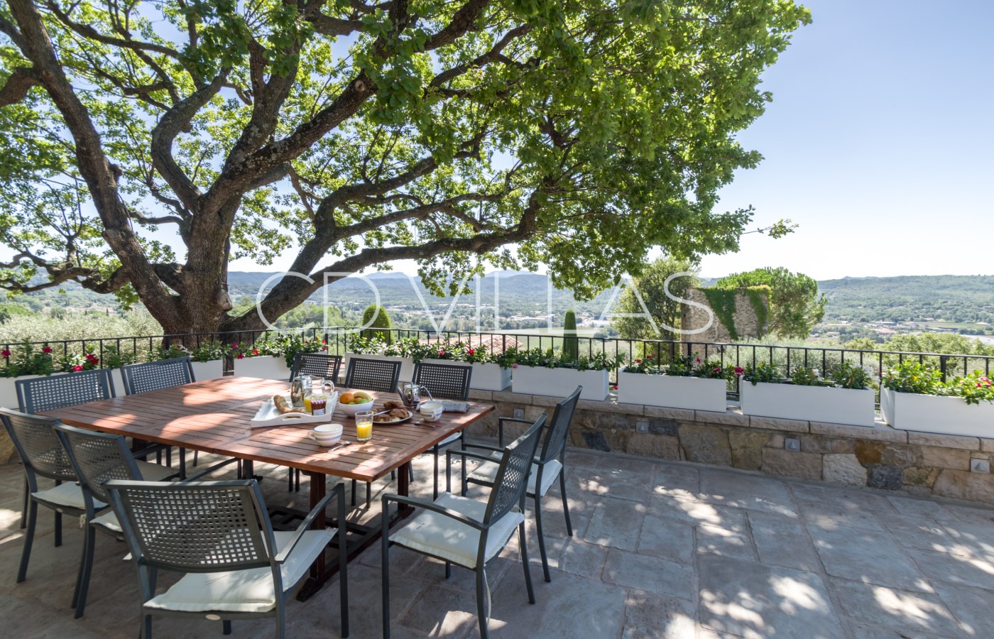 Large south facing terrace is shaded by the oak tree, with lovely views over the valley with exterior dining and relaxing area with sofas and chairs.