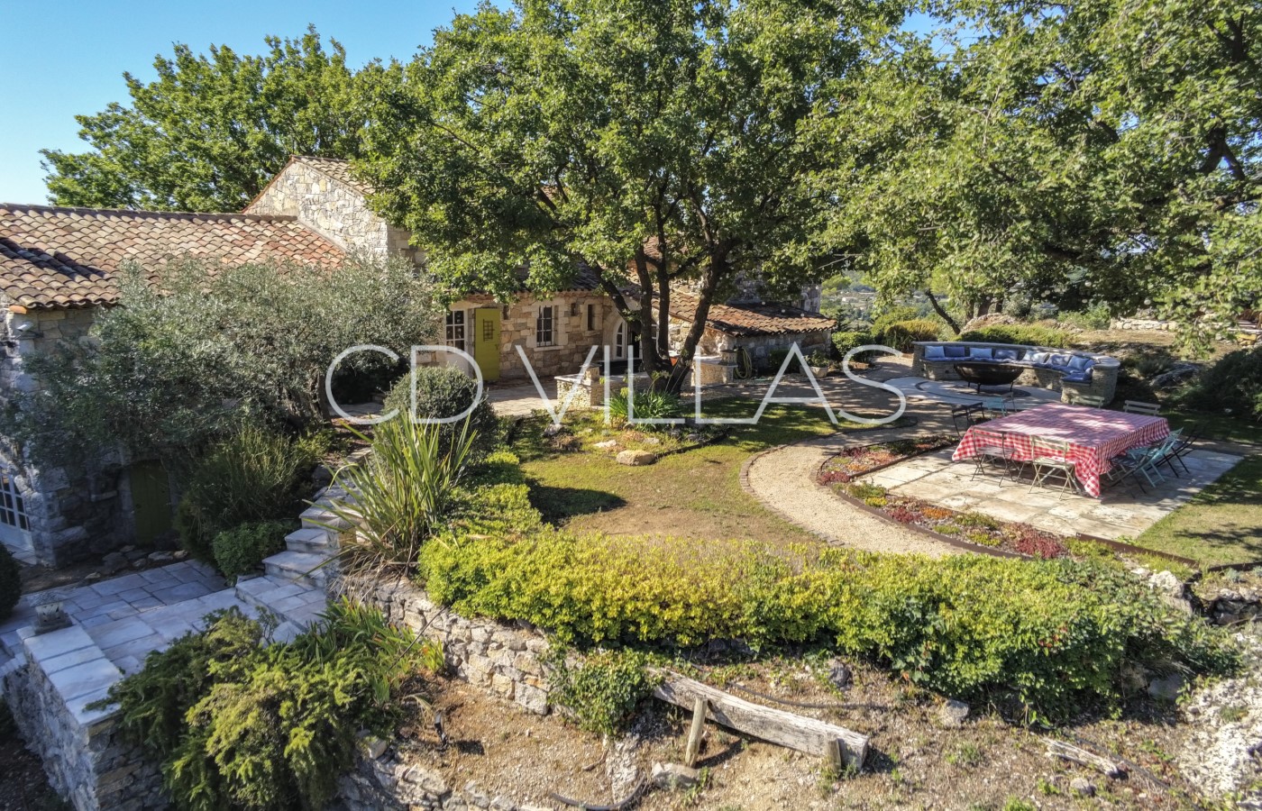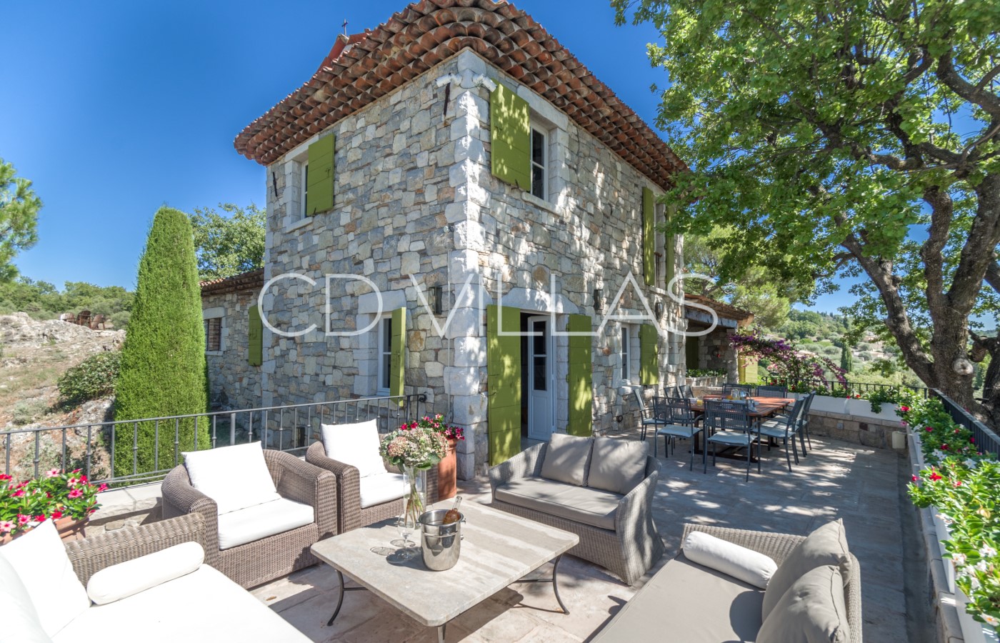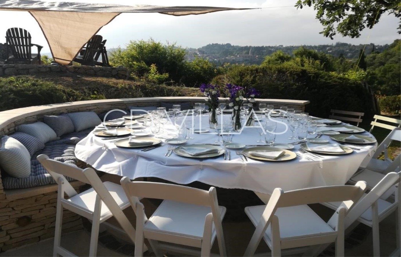 Large south facing terrace is shaded by the oak tree, with lovely views over the valley with exterior dining and relaxing area with sofas and chairs.