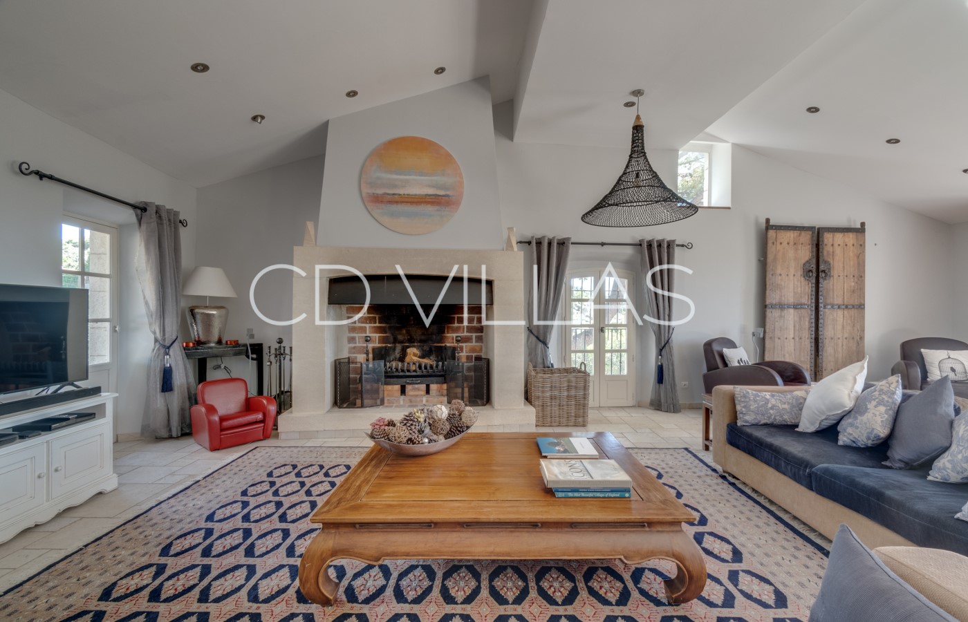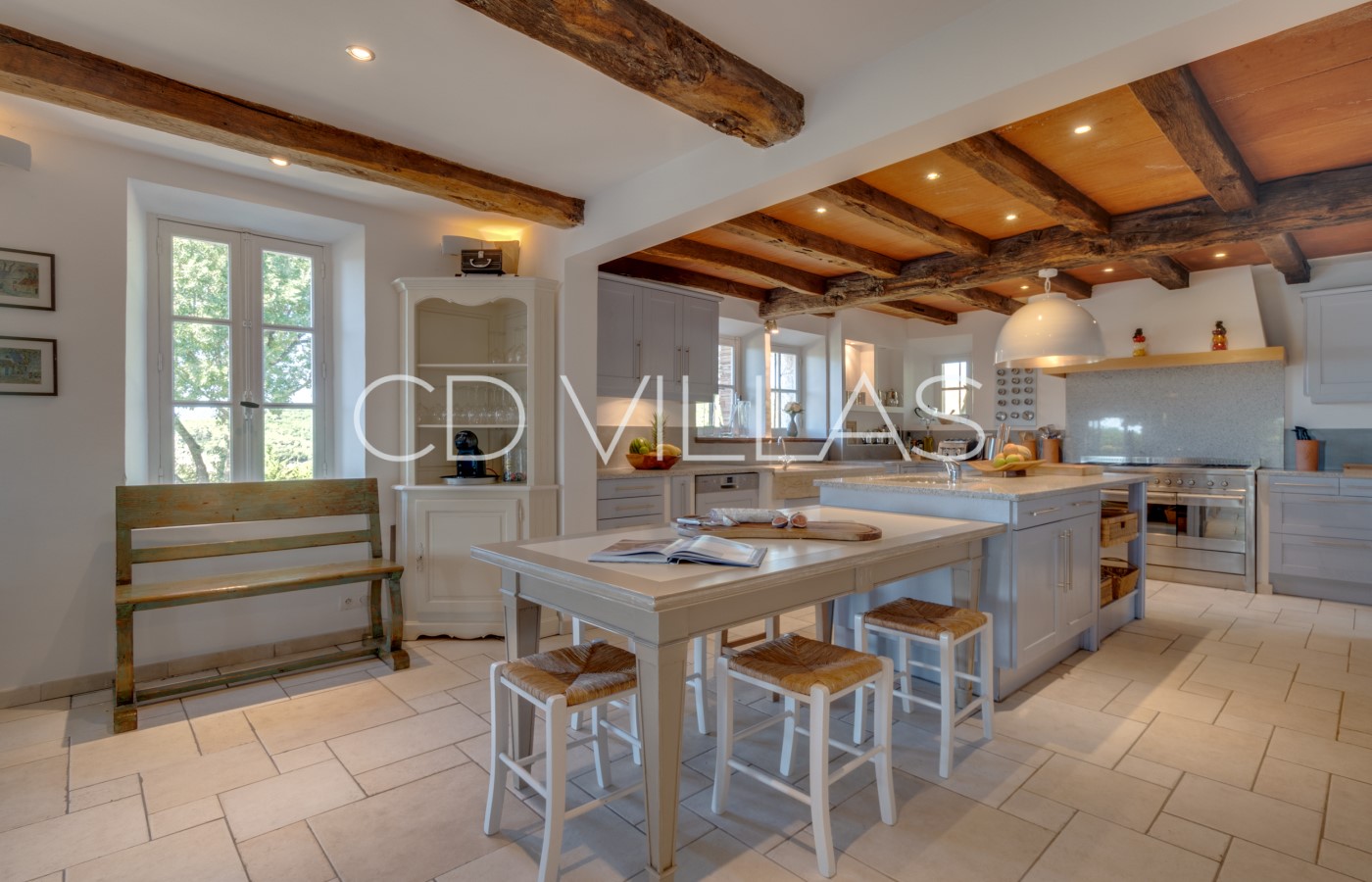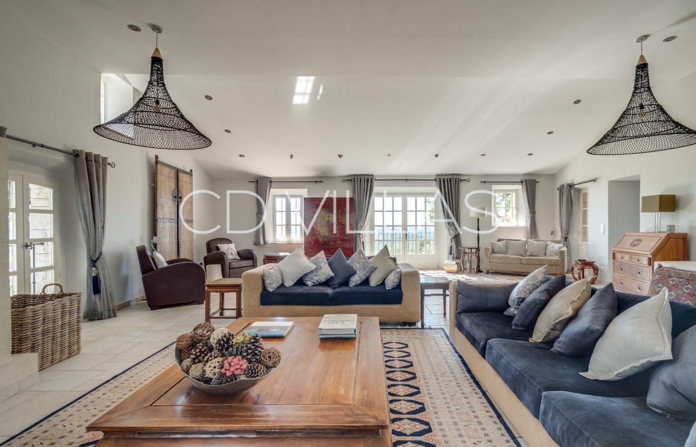 The dining room has an open plan with the kitchen and seats up to 10 adults. French doors open from the dining room directly on to the south facing front terrace for alfresco dining. The living room has several separate areas for relaxing and reading and leads to the back terrace.