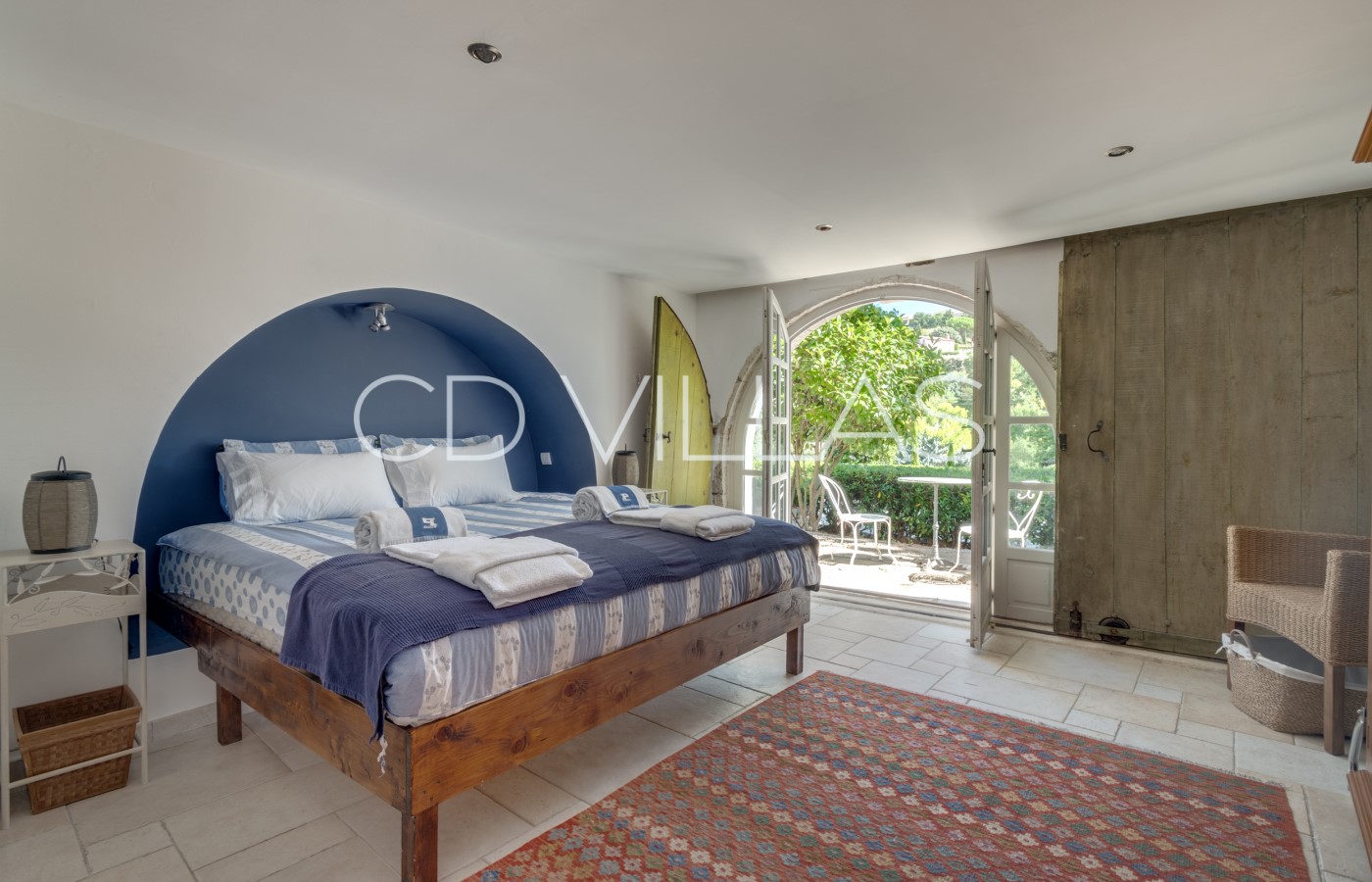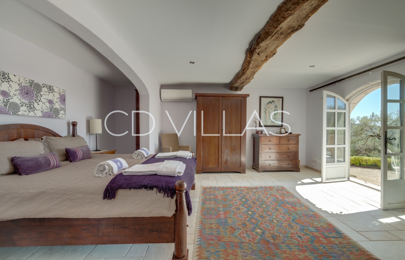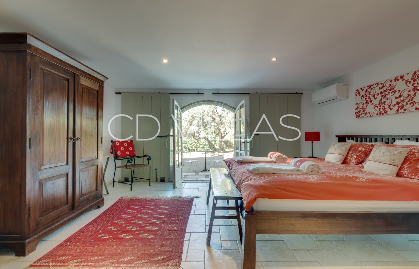 Bedroom 6 - The East Suite covers 22m2 and has a king size bed, air-conditioning, and ensuite bathroom. There is direct access to the garden and an outside sitting area which has morning sunshine, afternoon shade and views toward Montauroux.