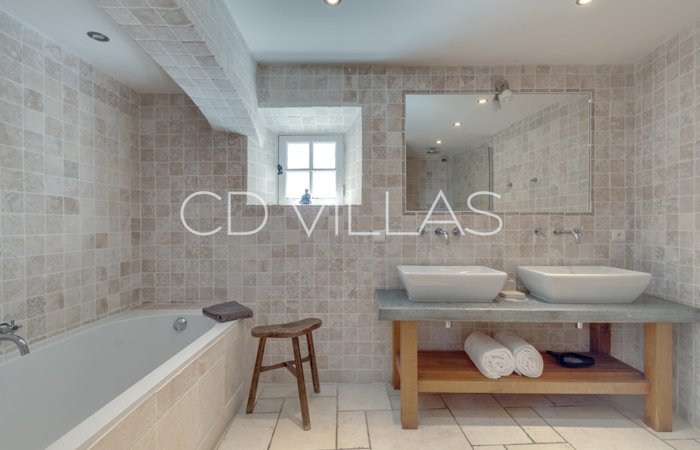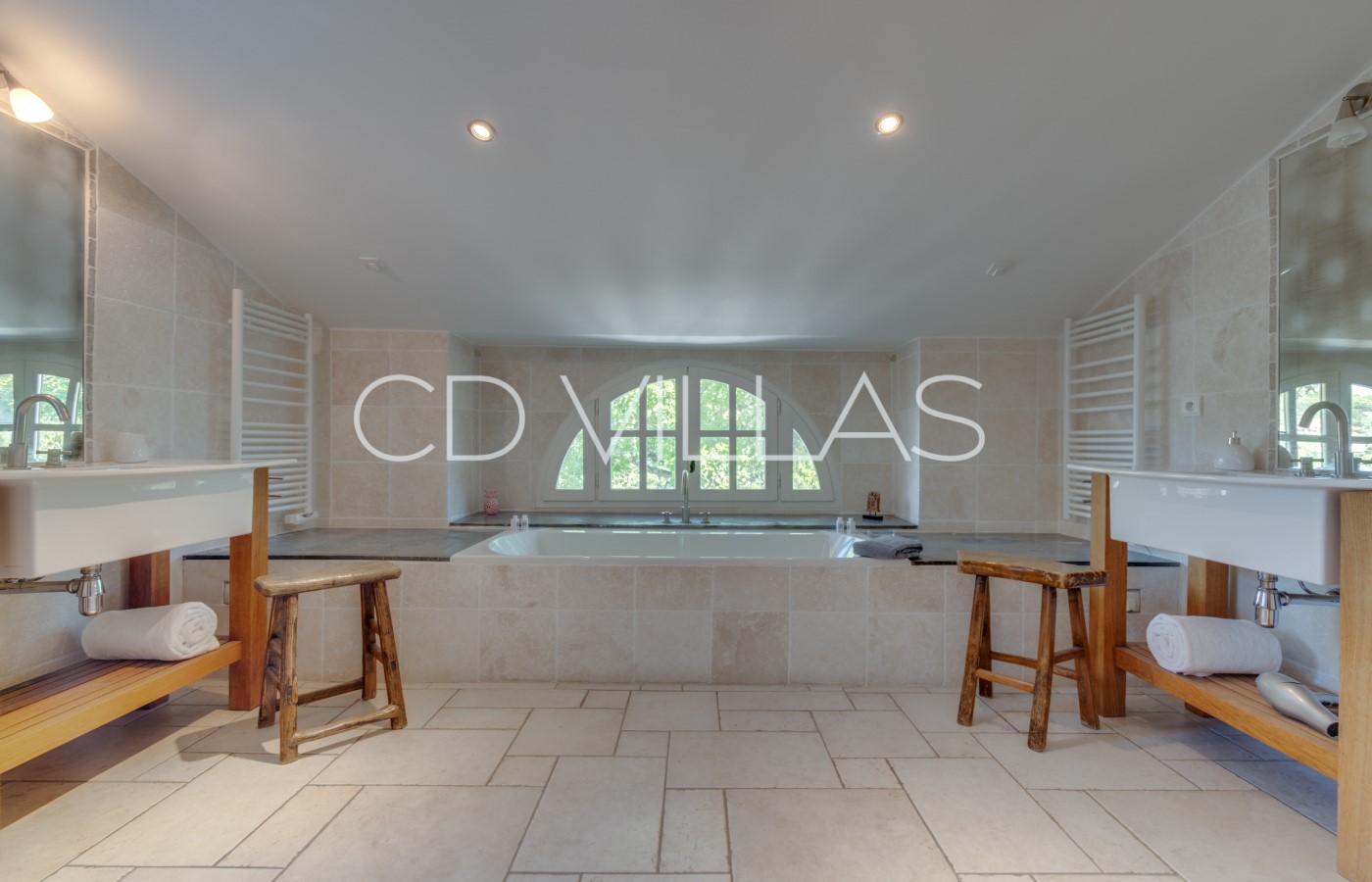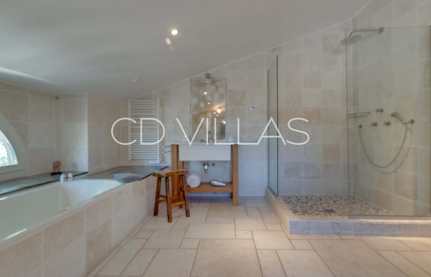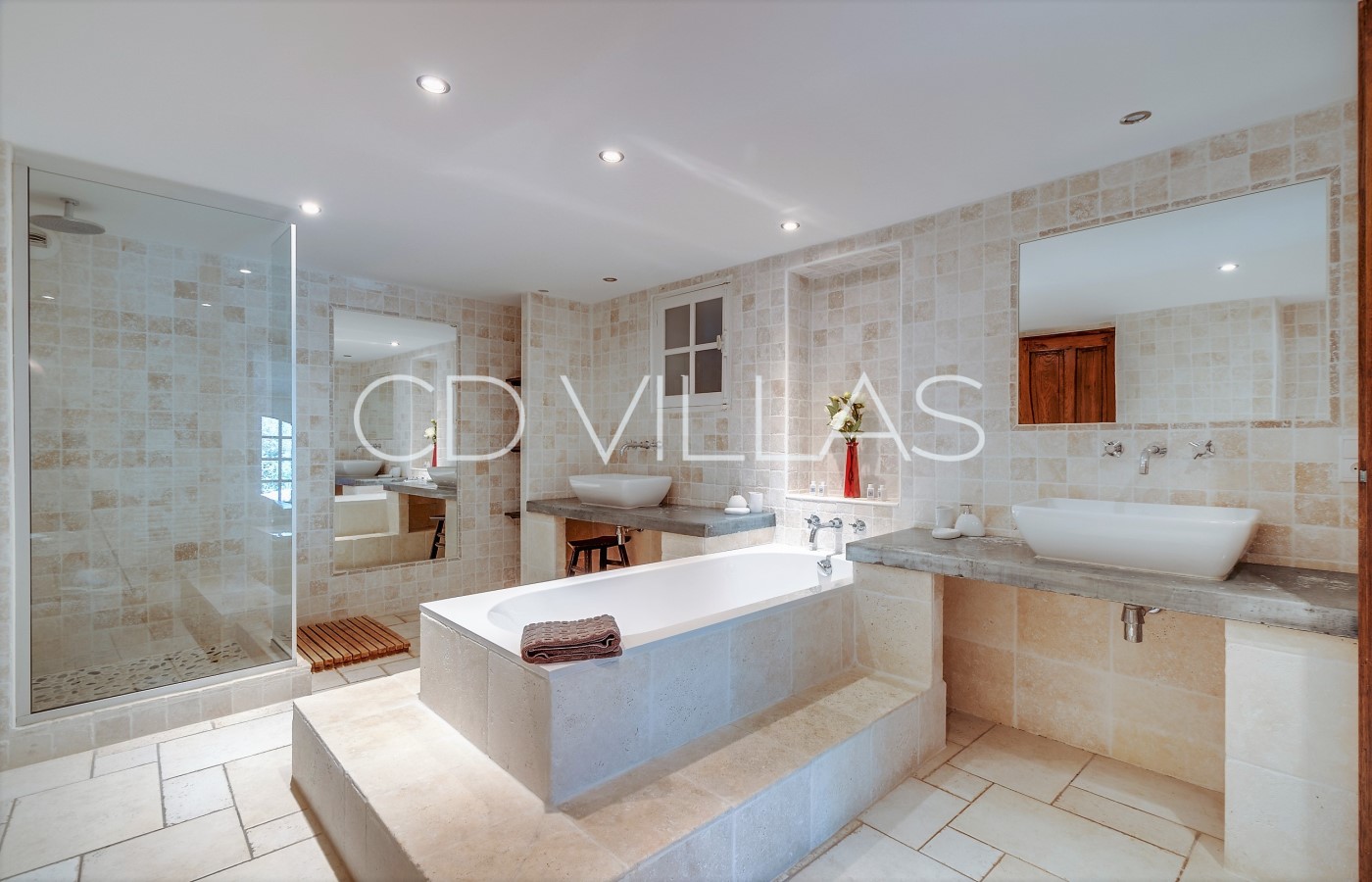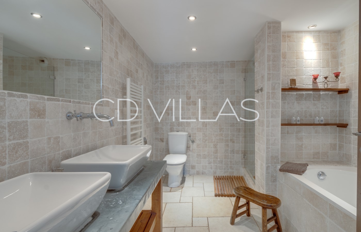 There are 5 double ensuite bedroom suites and an addtional 2 adjoining children's bedrooms. All bedroom suites have king-size beds, air conditioning and underfloor heating, double sinks, extra-deep baths, rainforest showers, individual access to an outdoor terrace with table and chairs, and blackout shutters.