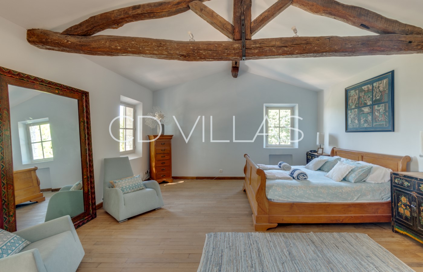 Bedroom 1 - Master Suite with king size bed, air-conditioning, 2 easy chairs, a private sun terrace and glorious views over the nearby hilltop villages of Montauroux and Callian; the valley and distant hills. The children's room is connected to this room and shares a bathroom.