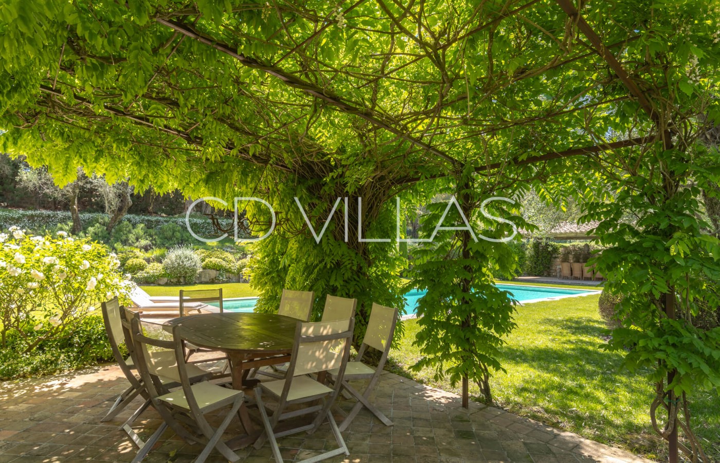 Bedroom 1 - with a double bed (160), A/C and en suite bathroom with bathtub, shower enclosure, 2 sinks and WC. Opens out to the covered dining area and garden