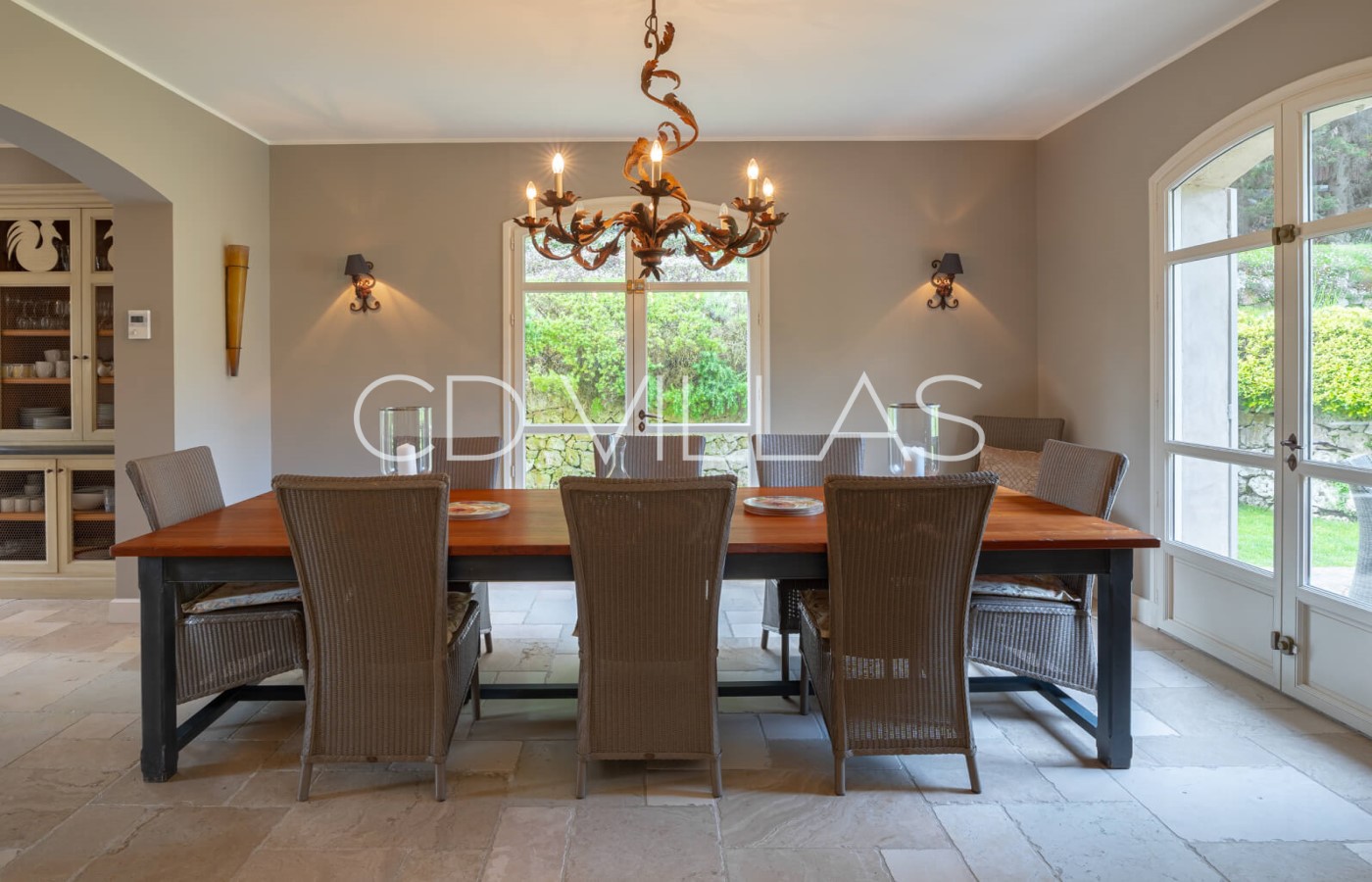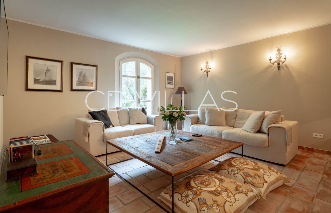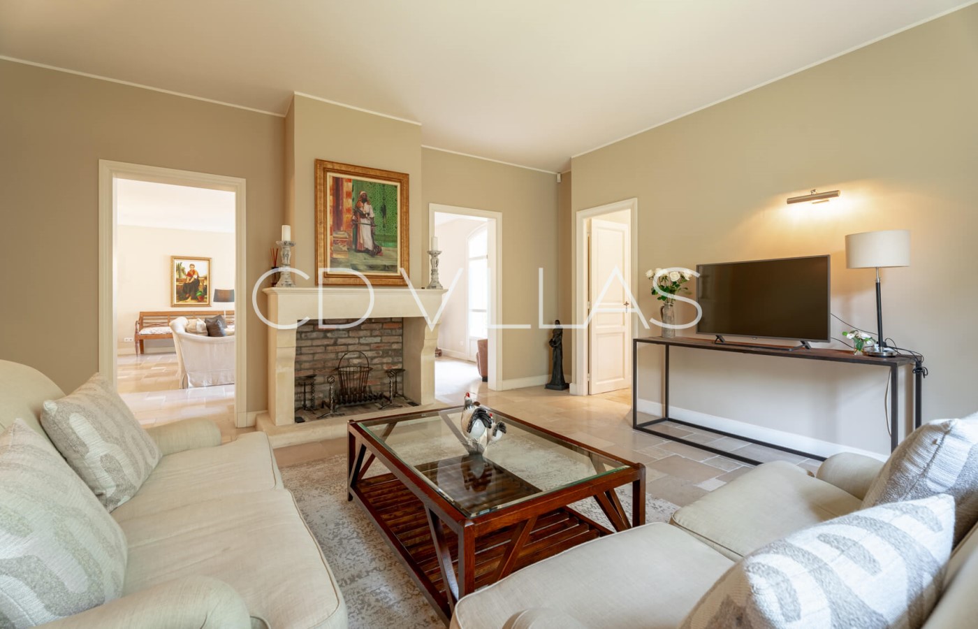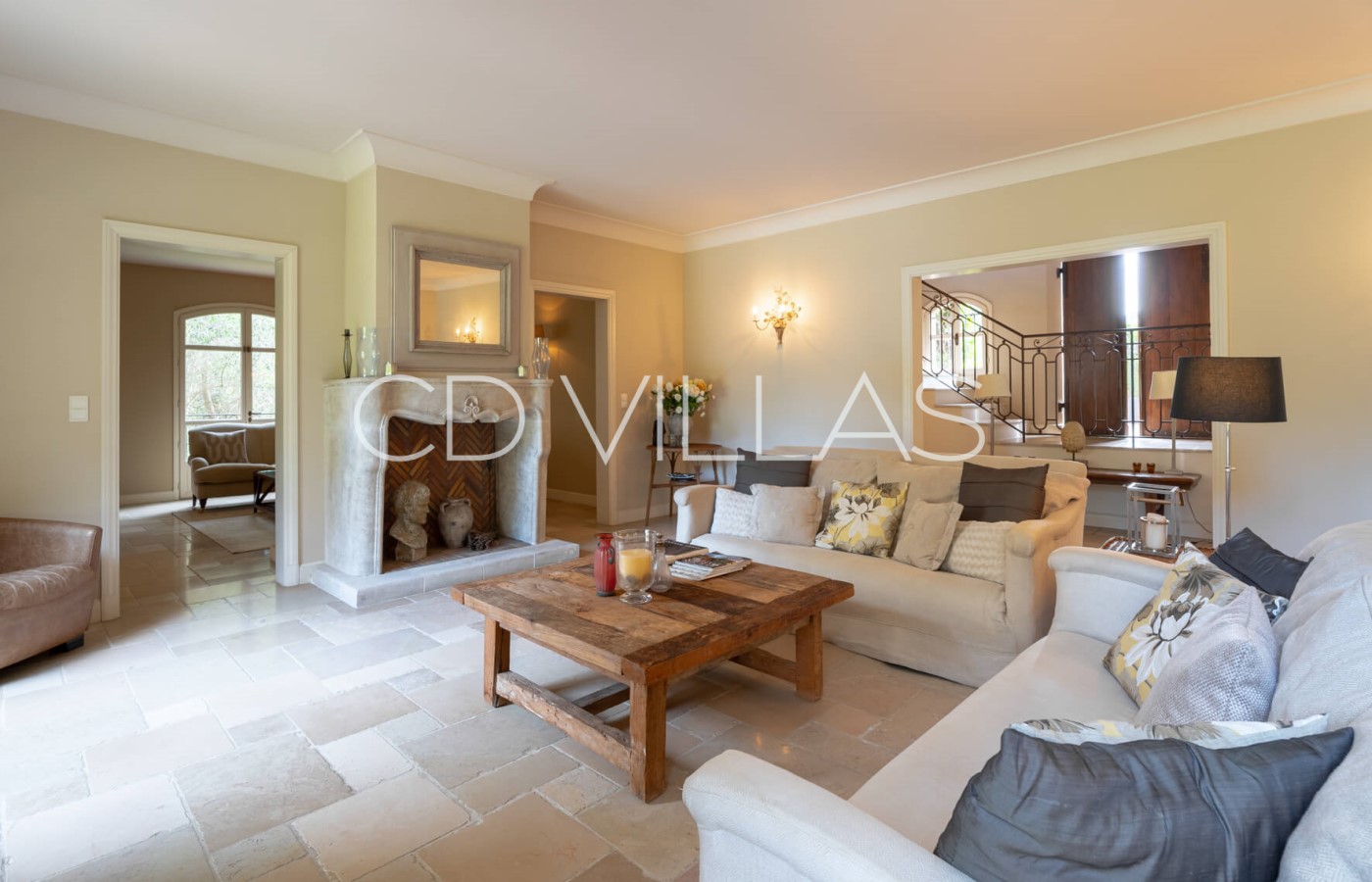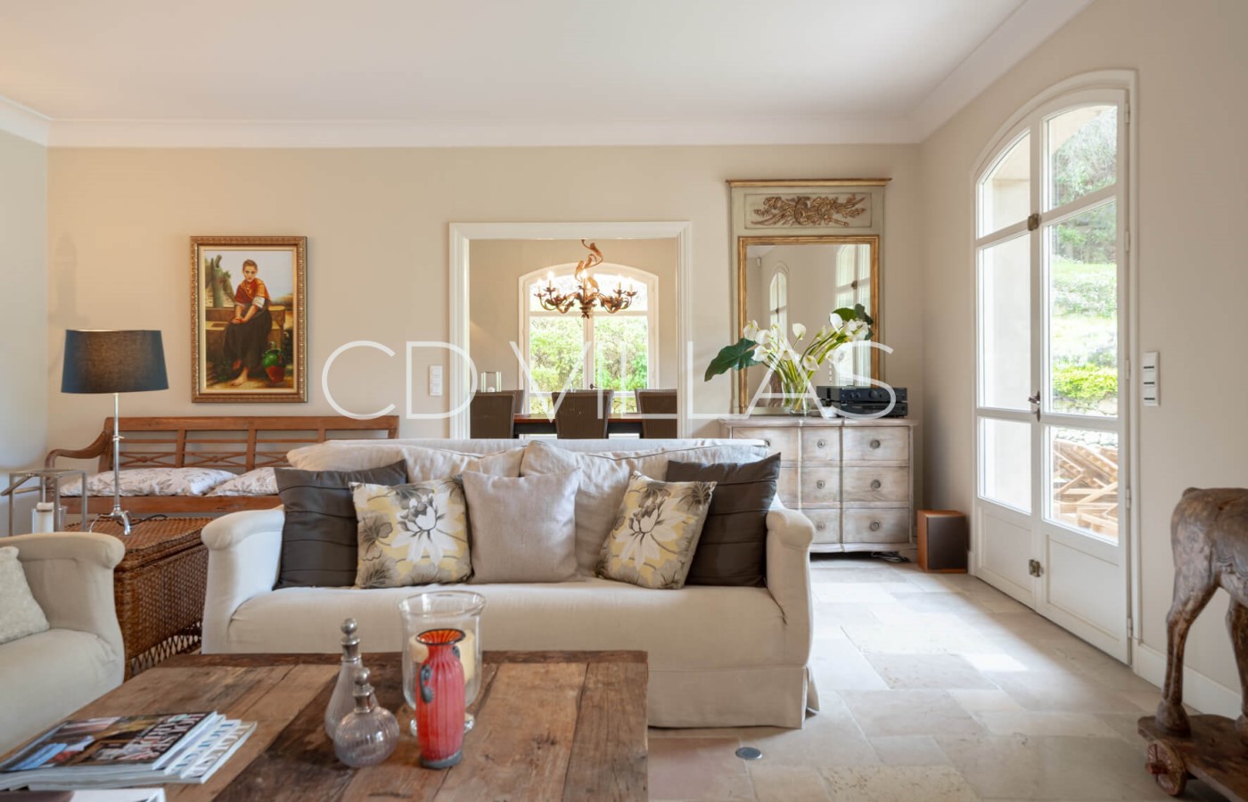 Living-room - bright and spacious living room leading out to the garden and pool area, with central fireplace