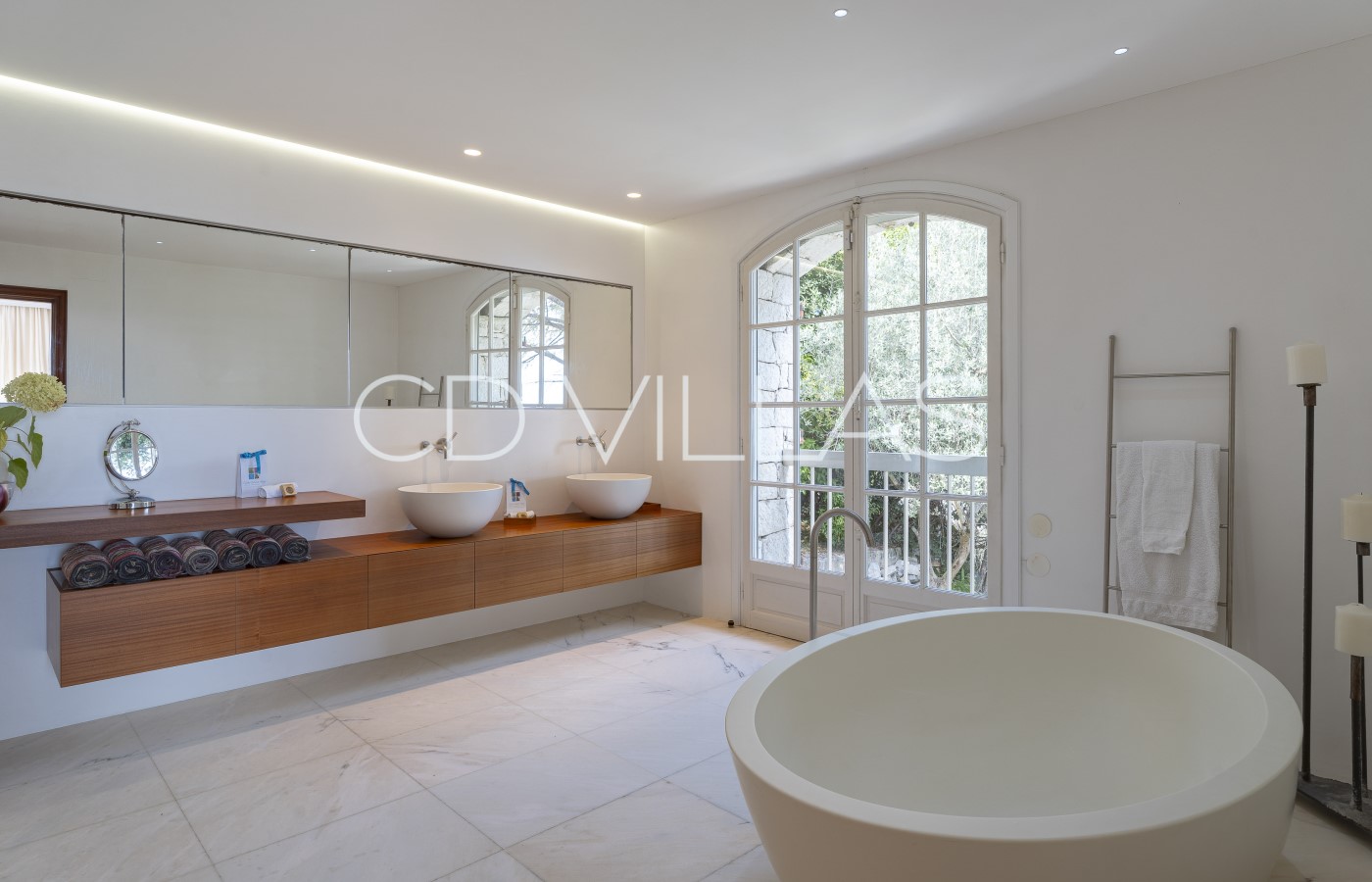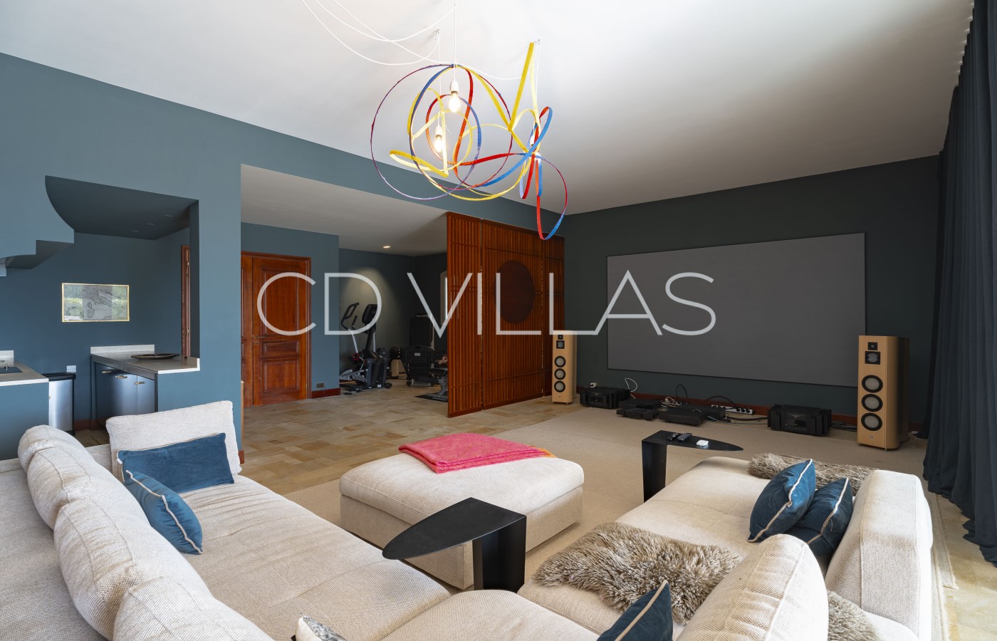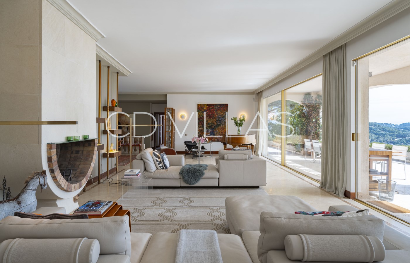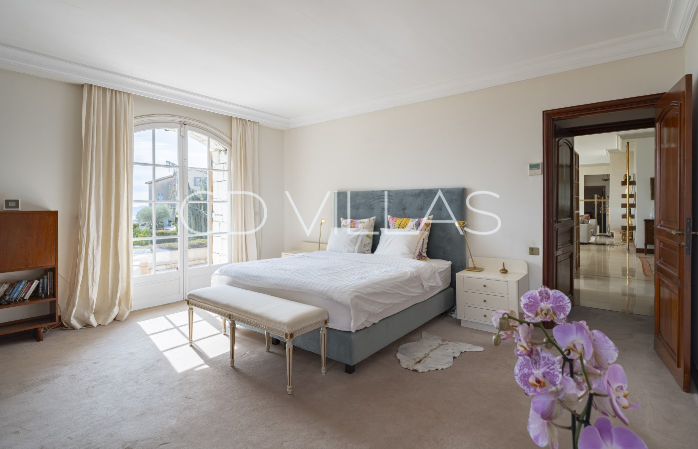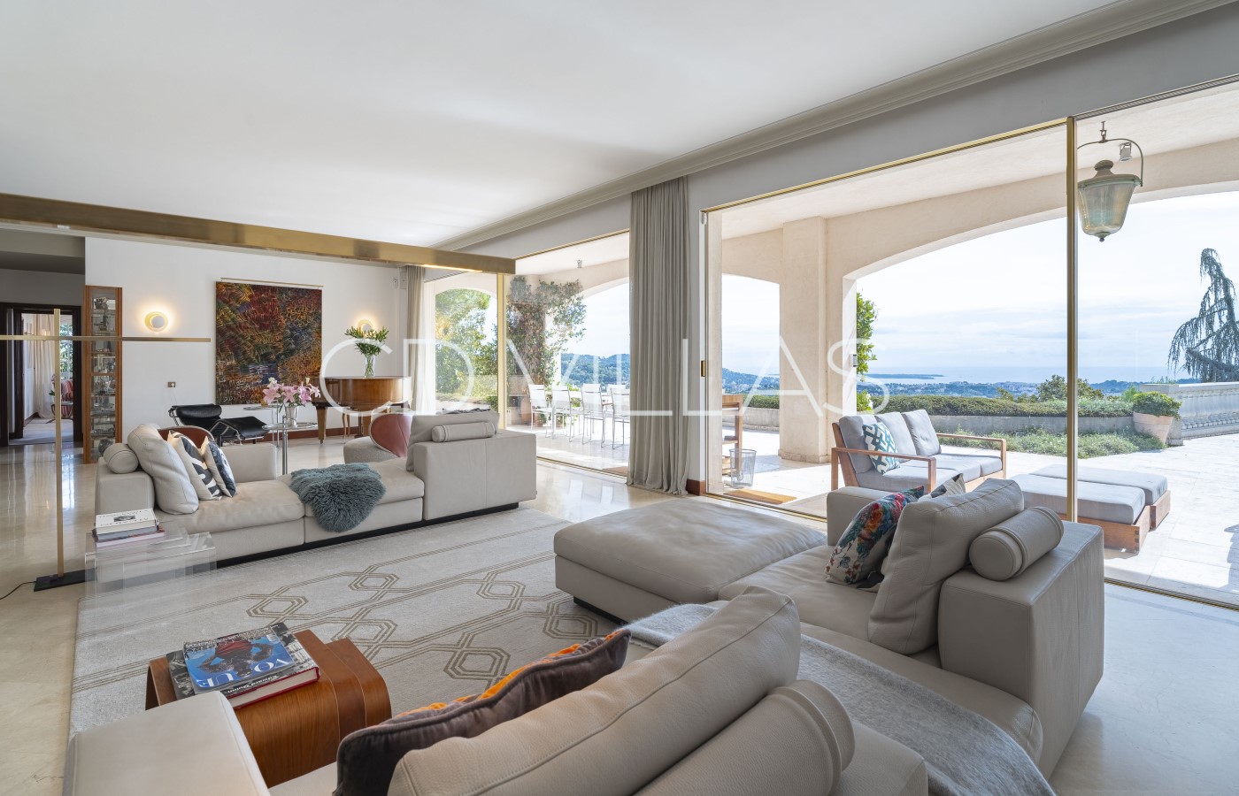 The vast living room measures 100m2 and leads effortlessly onto a large outdoor terrace overlooking the mediterranean sea and the city of Cannes. Guests will enjoy a comfortable seating area and outdoor dining facilities including a 3.5 metre table that can seat up to 12 people with ease. Sun blinds provide shade if necessary. The property offers a large fully equipped kitchen complete with TV, an American refrigerator, wine cooler, both a conventional and steam oven as well as a plate warmer.
