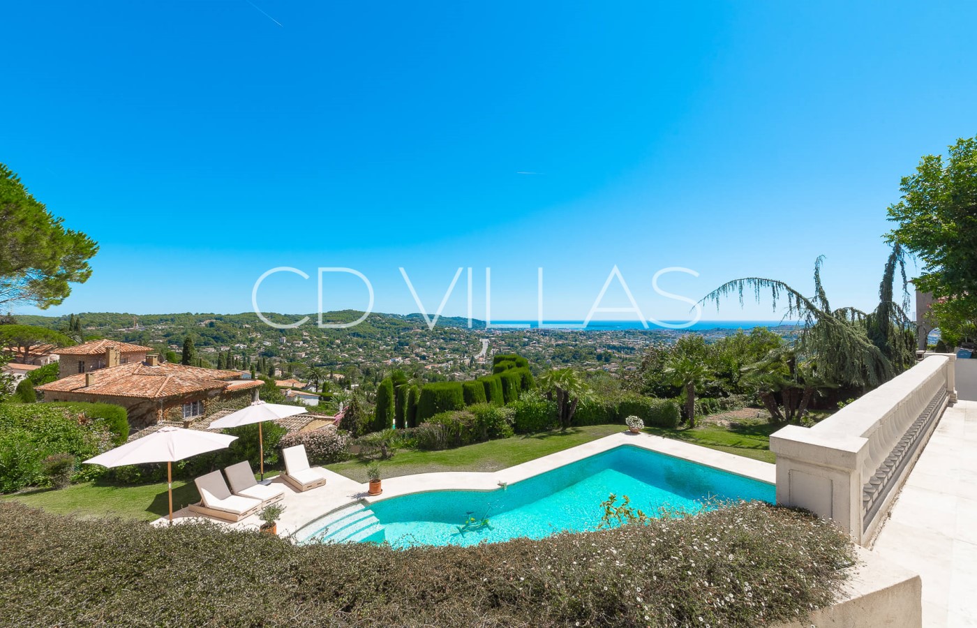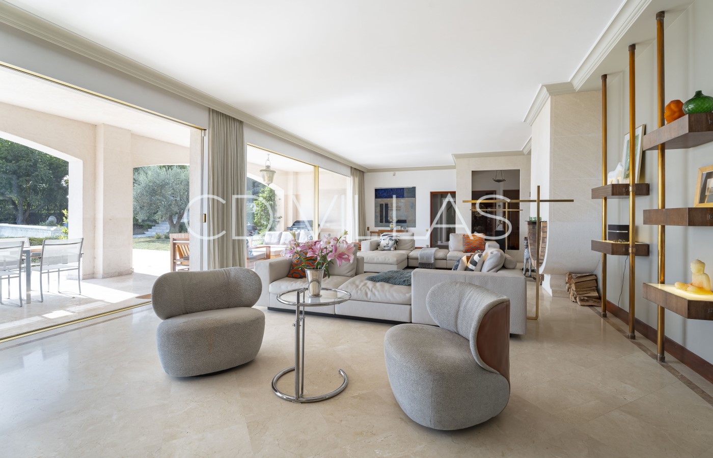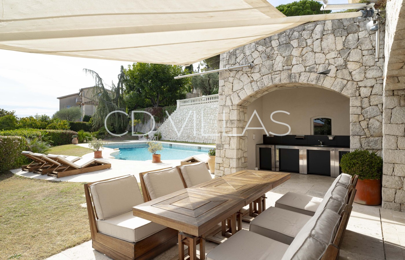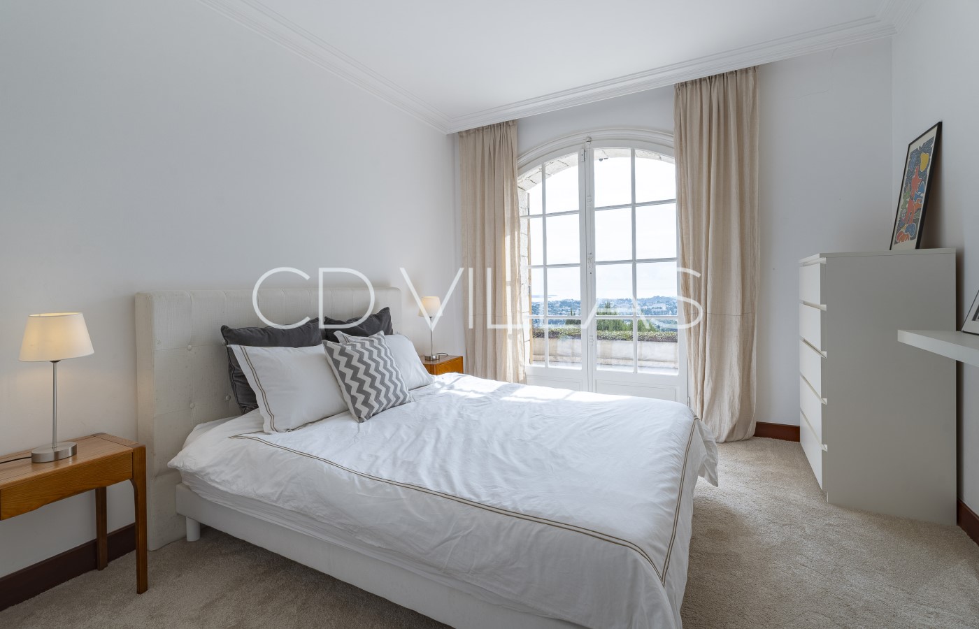 The vast living room measures 100m2 and leads effortlessly onto a large outdoor terrace overlooking the mediterranean sea and the city of Cannes. Guests will enjoy a comfortable seating area and outdoor dining facilities including a 3.5 metre table that can seat up to 12 people with ease. Sun blinds provide shade if necessary. The property offers a large fully equipped kitchen complete with TV, an American refrigerator, wine cooler, both a conventional and steam oven as well as a plate warmer.