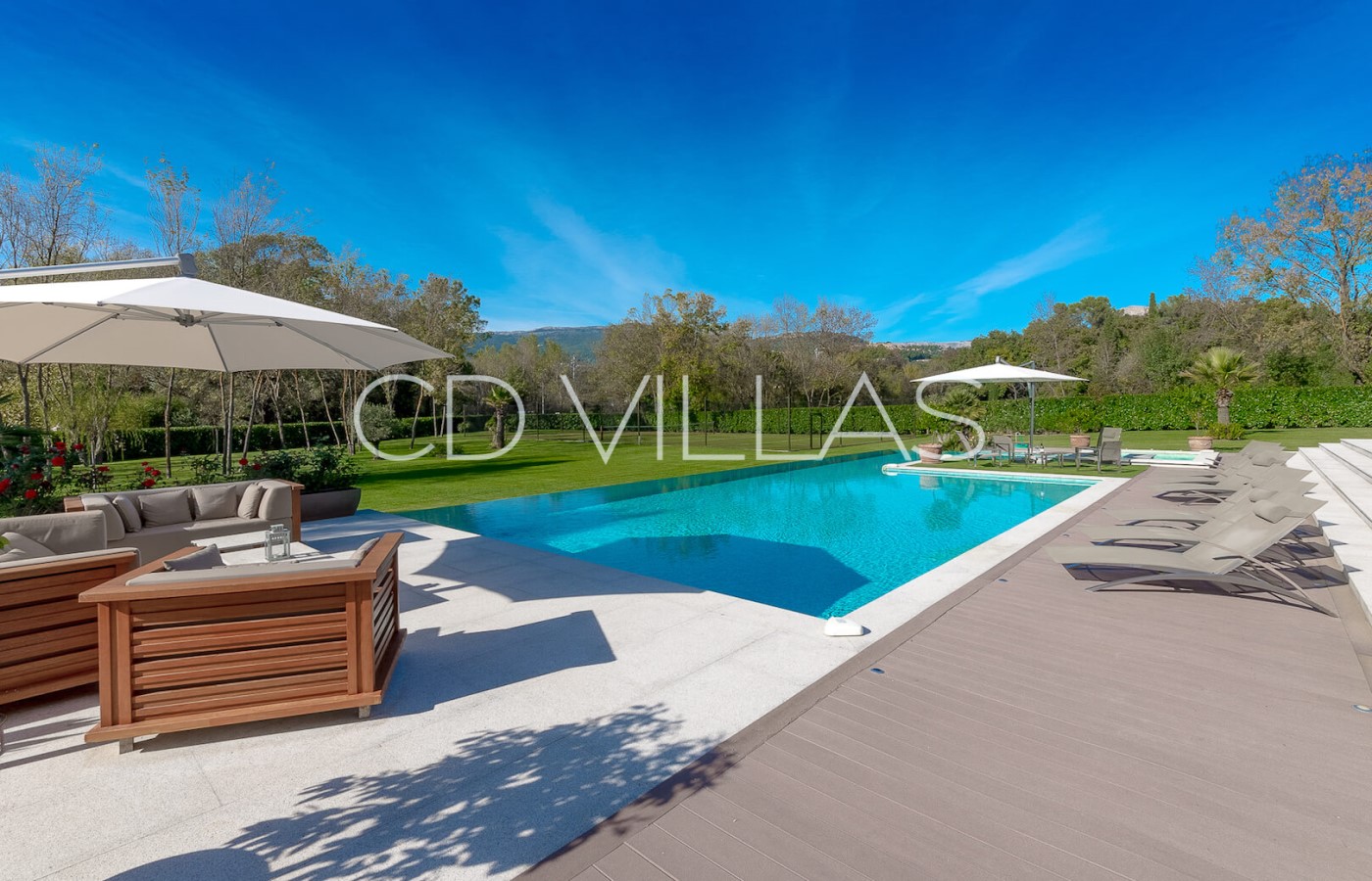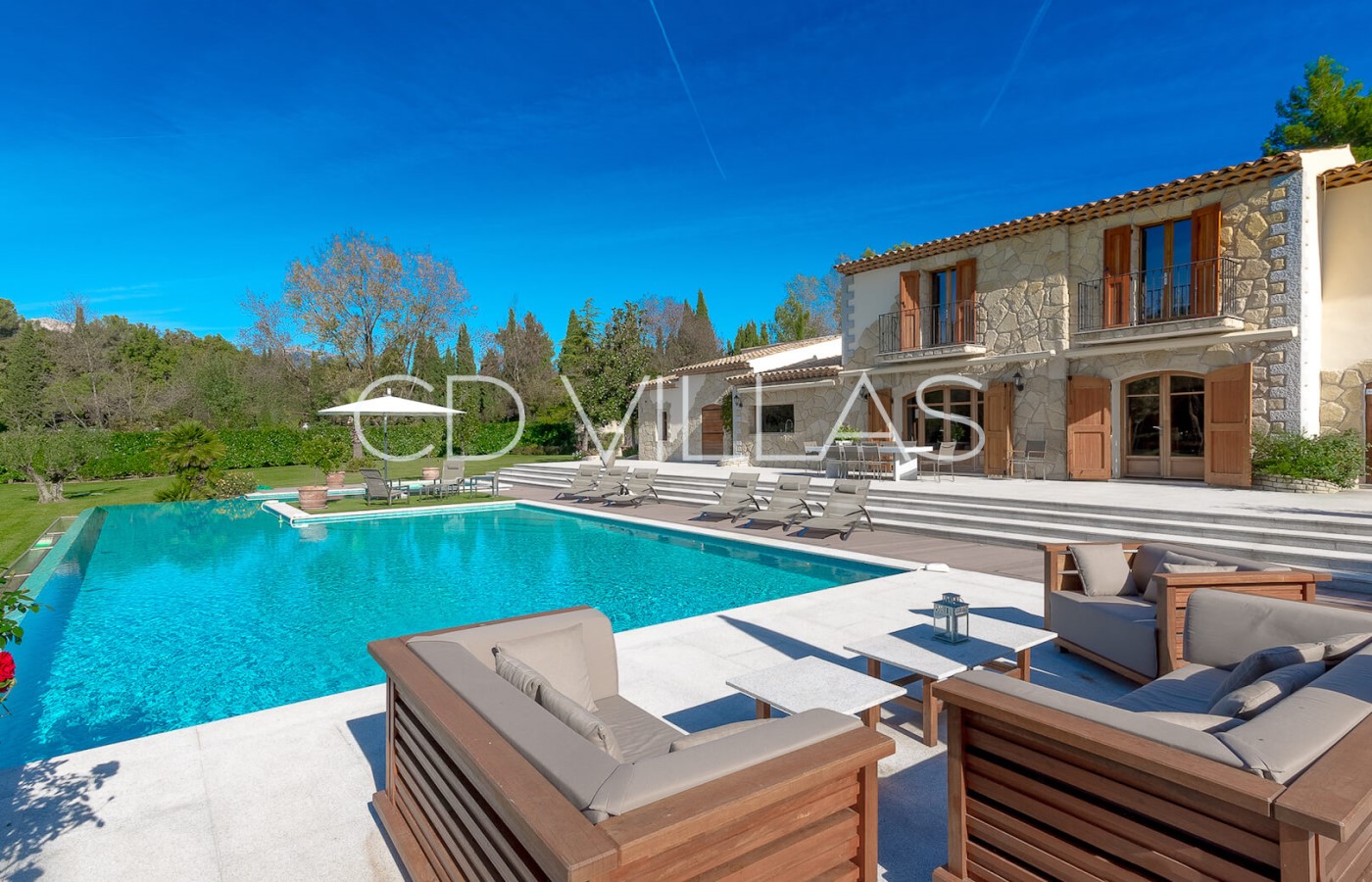 The villa is located in the hills of Chateauneuf, just a few minutes drive from the pretty villages of Valbonne and Mougins, and roughly 30 minutes from the beaches of Cannes. The property is also located just metres from a championship golf course (just 80 meters walking distance from the clubhouse), and moments from a tennis and riding club. Also available for weddings and events.