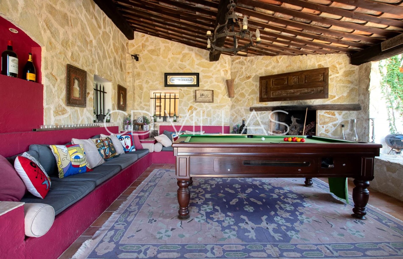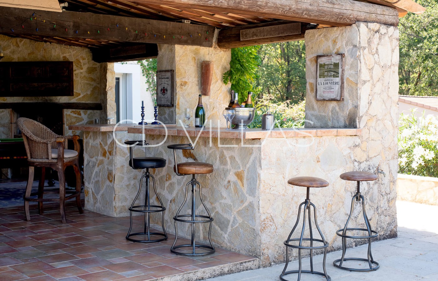 Evenings especially come alive at the villa's substantial outdoor bar. Designed for social gatherings, it has a comforting fireplace for when the nights get chilly, a billiard table for those who are into games and a Bluetooth sound system to create a party atmosphere. The fully equipped bar, with sofas and bar stools, provides the perfect setting for socialising under the stars.