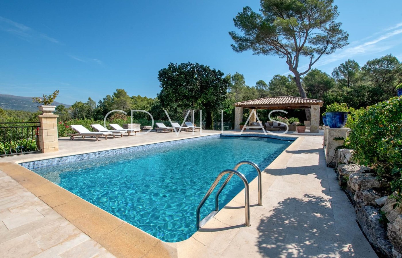 The expansive terraces are perfect for sunbathing, equipped with a dozen teak sun loungers, while the charming pool house provides shaded, comfortable sofa seating. From here, enjoy serene views over the surrounding forest, stretching to the Gorge du Loup and the majestic mountains beyond.