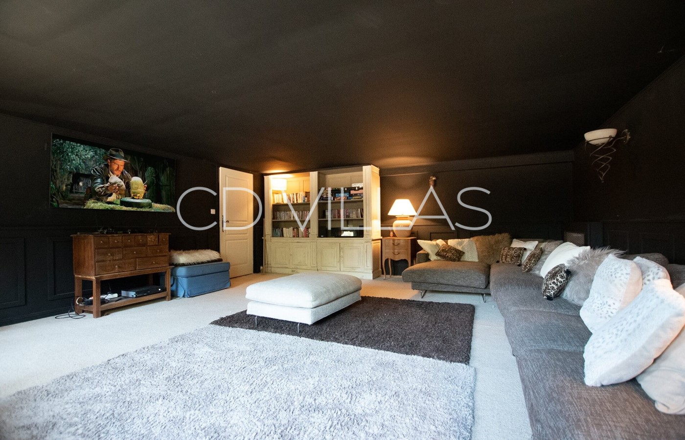 Cinema and Games Room - Downstairs, Villa Aigle offers a spacious and cosy cinema and games room, designed as the perfect hideaway. Generous sofas and cushions create a relaxed lounge atmosphere, accompanied by a separate double sofa bed for added flexibility. The room features a 165cm flat-screen TV, games consoles, and a cupboard stocked with classic board games — ideal for rainy afternoons or for anyone seeking a break from the sunshine. This room also has an ensuite bathroom with shower, sink and toilet. Sofa-bed is only available upon request and at an extra fee; please enquire.