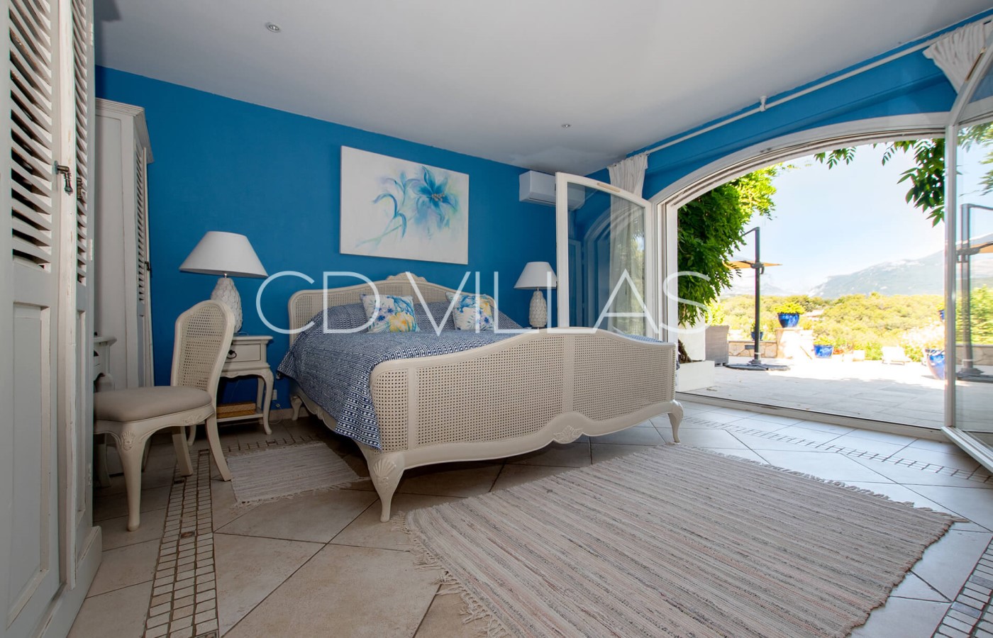 Bedroom 1 - Double bedroom featuring a large bed, lovely views, air conditioning, and an en-suite bathroom with shower. A private door opens directly onto the terrace and pool area.