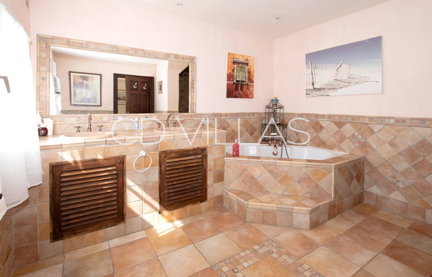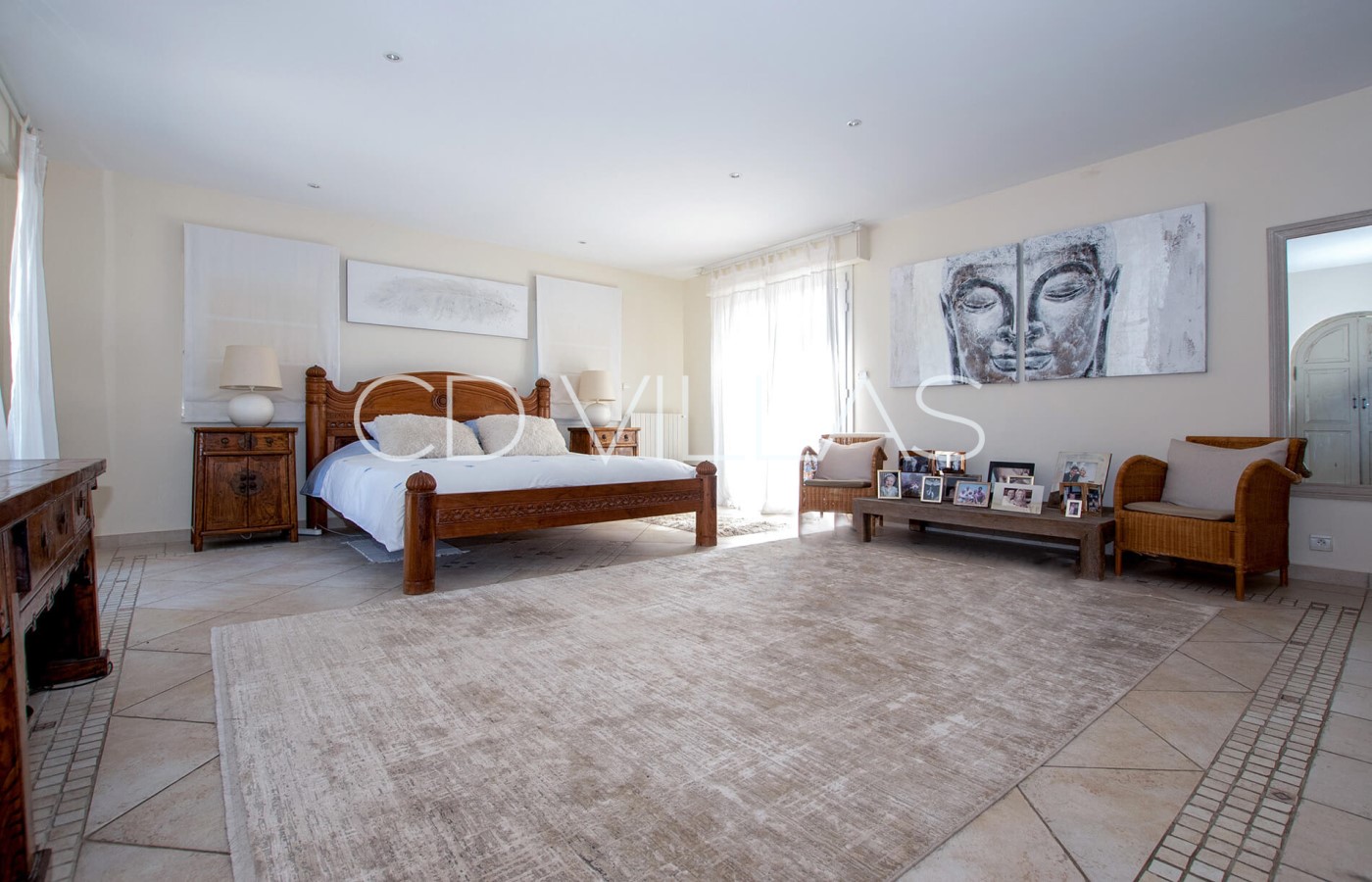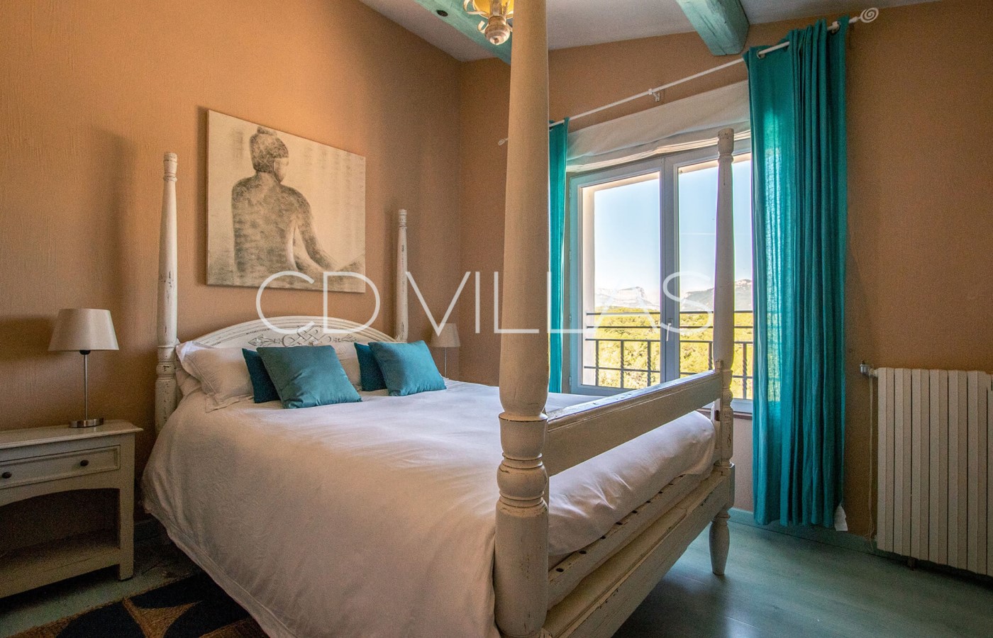 Bedroom 3 - Double bedroom featuring a large bed, lovely views, air conditioning, and an en-suite bathroom with shower, bathtub and double vanity. A private door opens directly onto the terrace and pool area.
