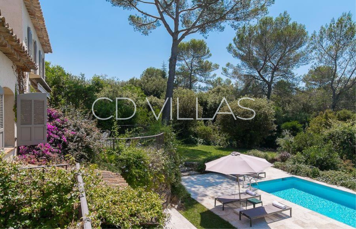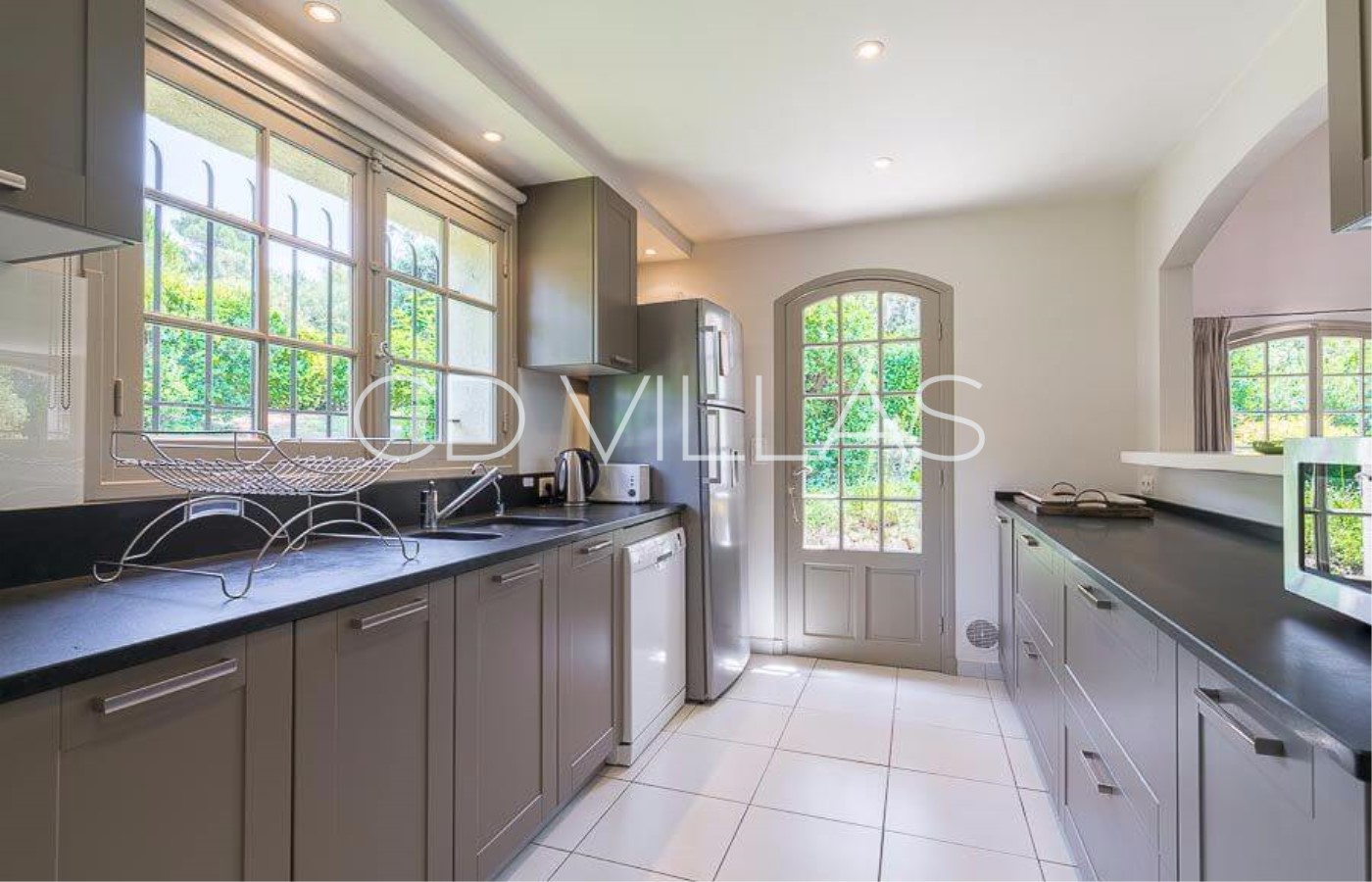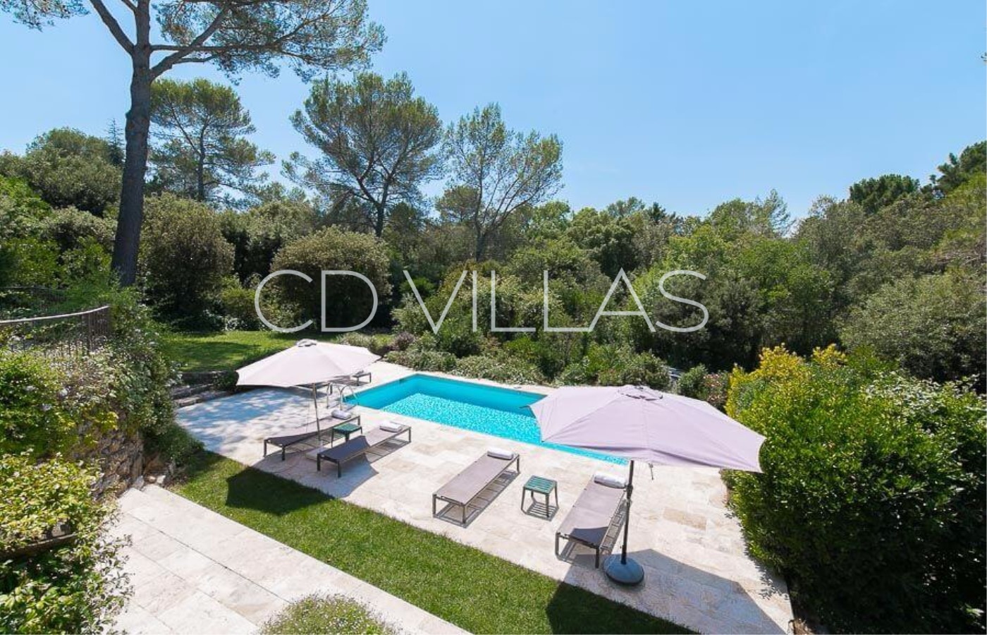 The villa is set within 4,000m2 of south-facing gardens planted with pines, Mediterranean shrubs and flowers with a lawned area near the house. From the living room, French windows open onto a large terrace with coal BBQ and outdoor table and chairs for 8 people. The terrace overlooks the garden and heated swimming pool (10mx5m) surrounded by plenty of sun loungers and parasols. In the distance is the forested national park with the hills of the Cote d'Azur rising in the background. There is also a ping pong table. At the bottom of the garden is a gate which, after a 5 minute walk, leads you to a supermarket and boulangerie. It also opens onto the national park, great for jogging and long walks. It is a 10 minute drive into the village of Valbonne.