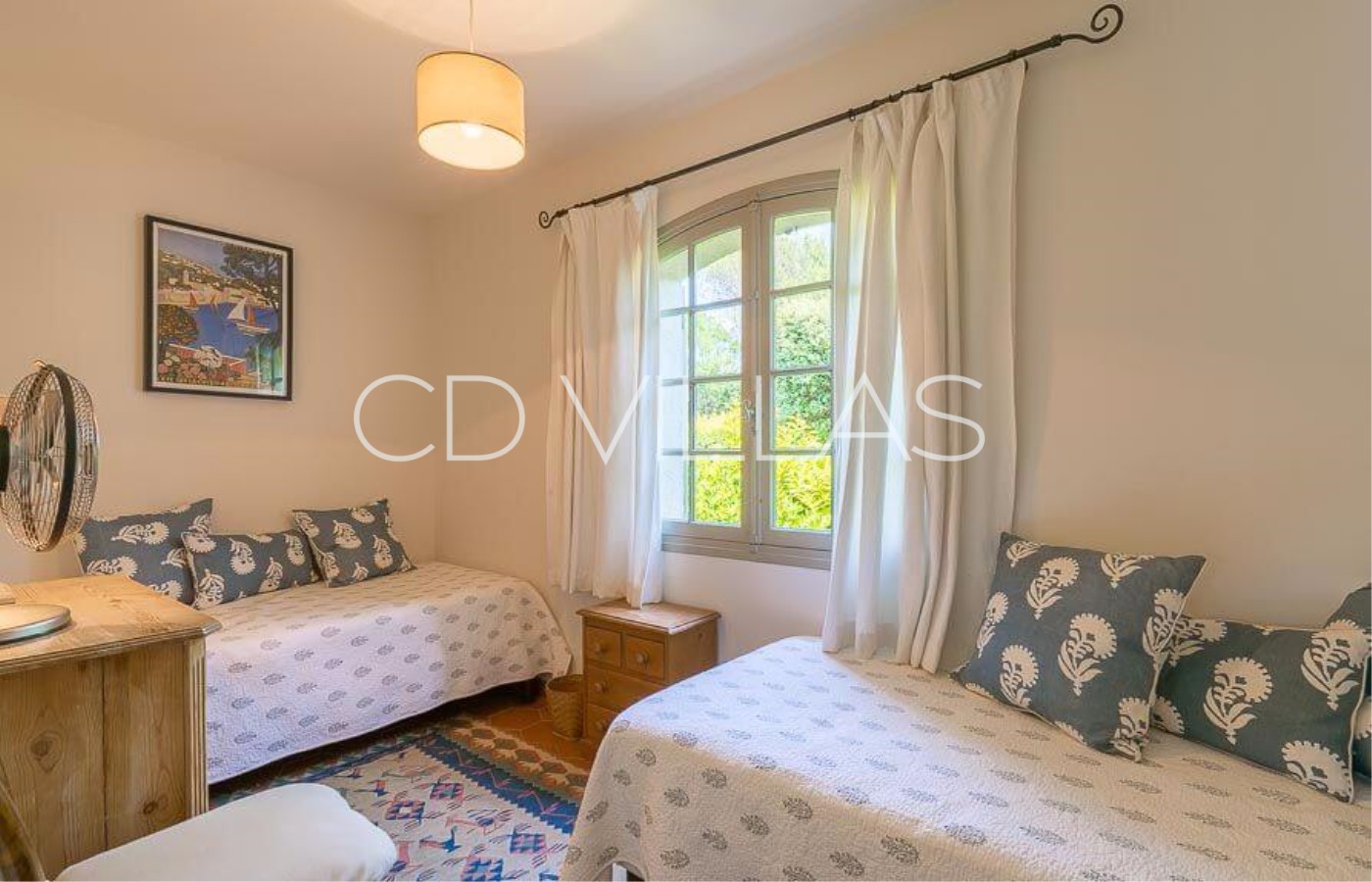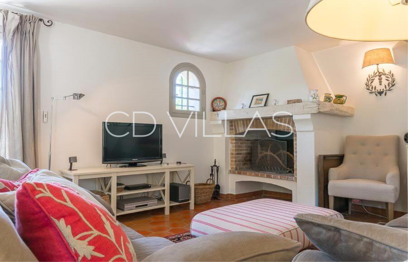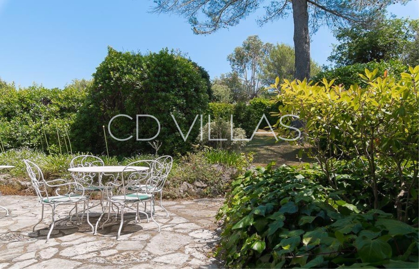 The villa is set within 4,000m2 of south-facing gardens planted with pines, Mediterranean shrubs and flowers with a lawned area near the house. From the living room, French windows open onto a large terrace with coal BBQ and outdoor table and chairs for 8 people. The terrace overlooks the garden and heated swimming pool (10mx5m) surrounded by plenty of sun loungers and parasols. In the distance is the forested national park with the hills of the Cote d'Azur rising in the background. There is also a ping pong table. At the bottom of the garden is a gate which, after a 5 minute walk, leads you to a supermarket and boulangerie. It also opens onto the national park, great for jogging and long walks. It is a 10 minute drive into the village of Valbonne.
