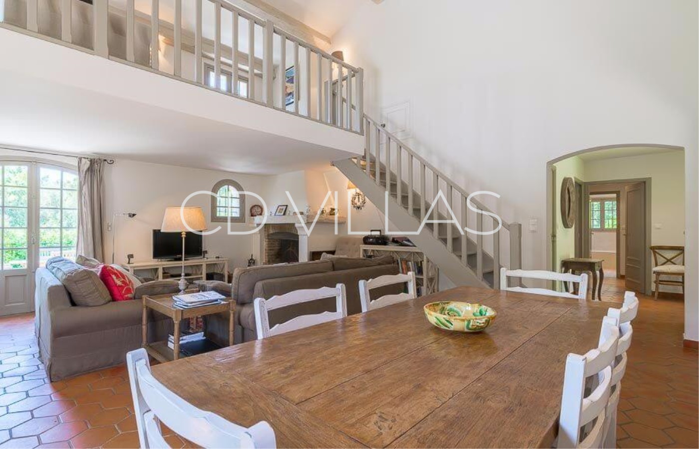 Living / Dining Room - Light and comfortable double-height room with mezzanine office. Comfortable seating, TV, fireplace and triple set of French doors opening onto the outside terrace, garden and outdoor dining area for 8 people. Indoors, there is also a dining table and chairs for 6 people.