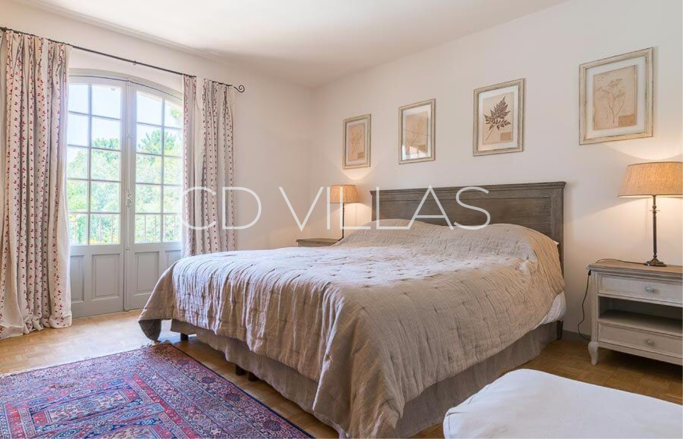 Bedroom 1 - Master bedroom with large double bed with French doors opening onto a juliette balcony with views over the garden and swimming pool. Ensuite bathroom with bath and in-bath shower.