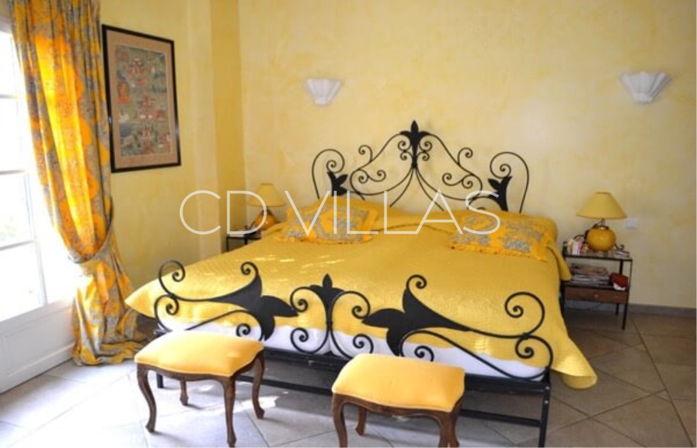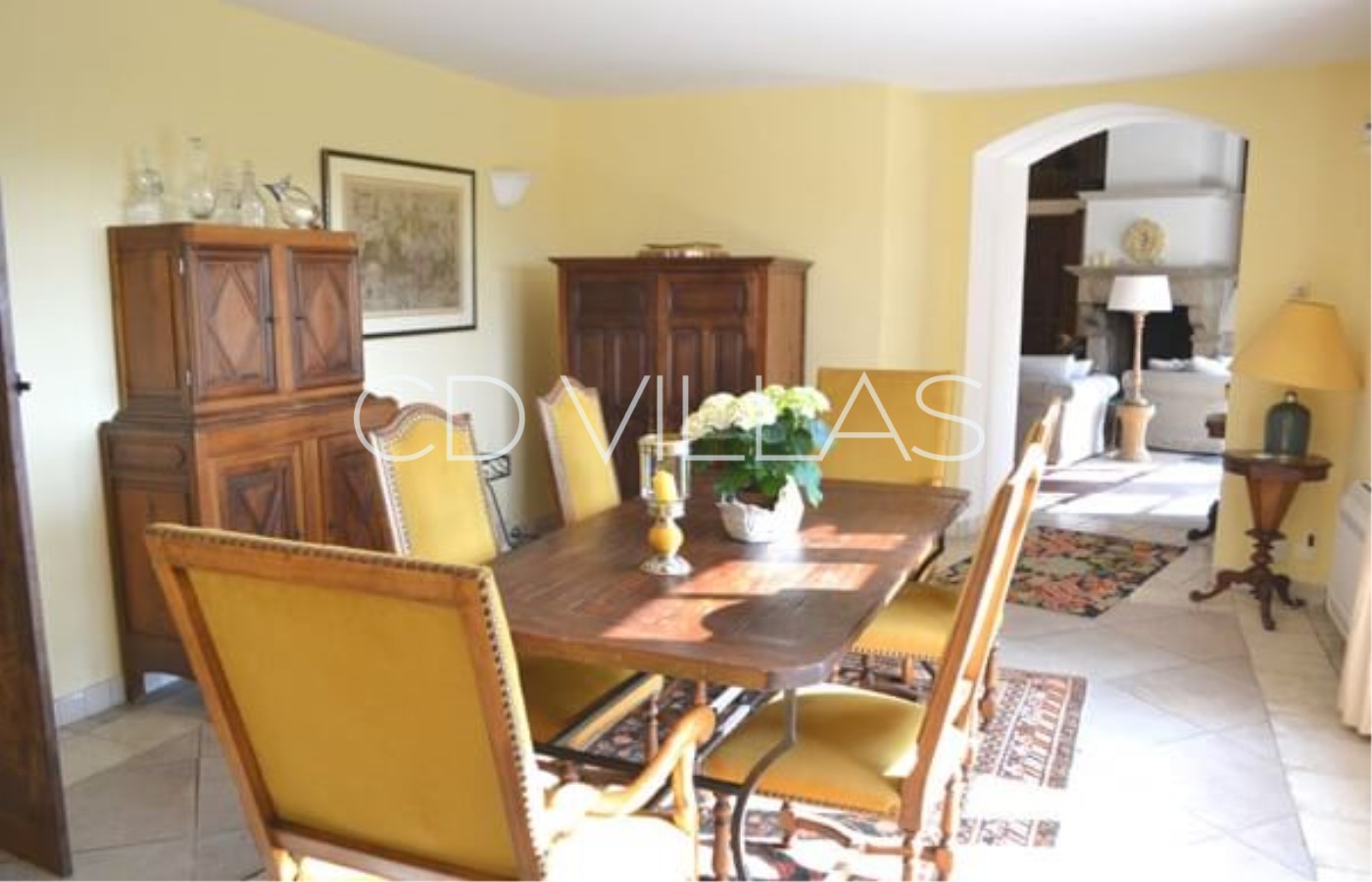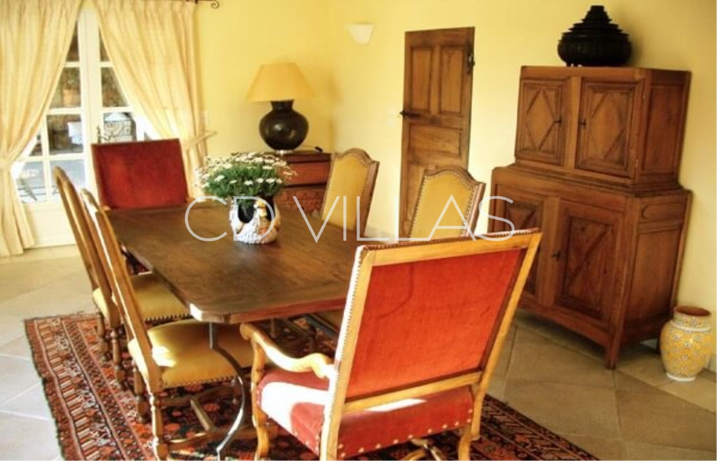 The villa is light and spacious, with views over the village and hills. The living room has high ceilings and an original Louis XIII fireplace from a French chateau, stone floor tiles, antique furniture, and an open dining room. All four double bedrooms have en suite bathrooms, two bedrooms are located on the first floor and two on the garden level. All rooms have reversible air-conditioning.