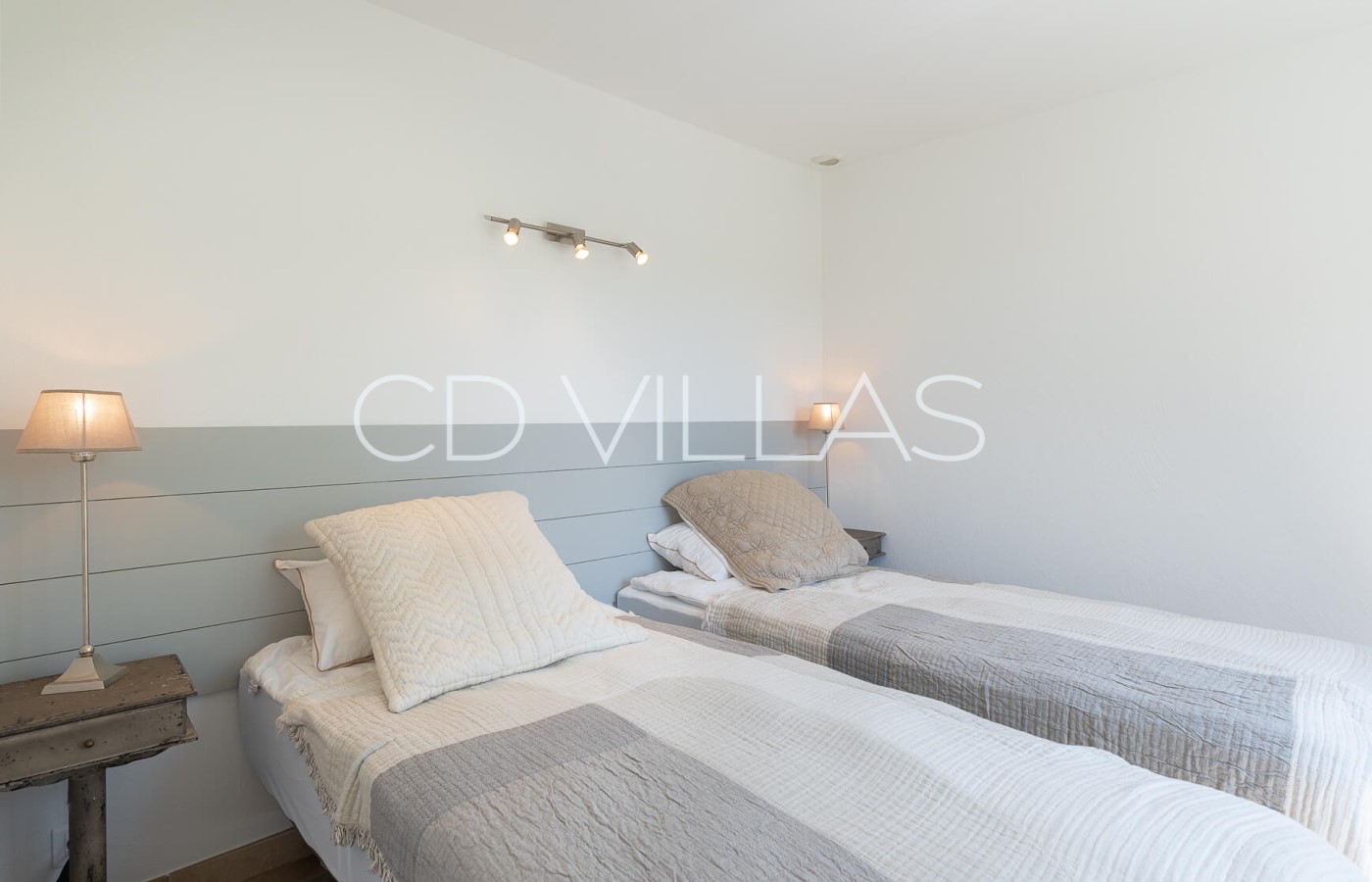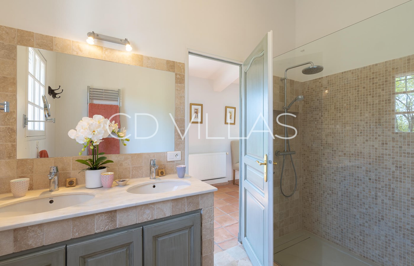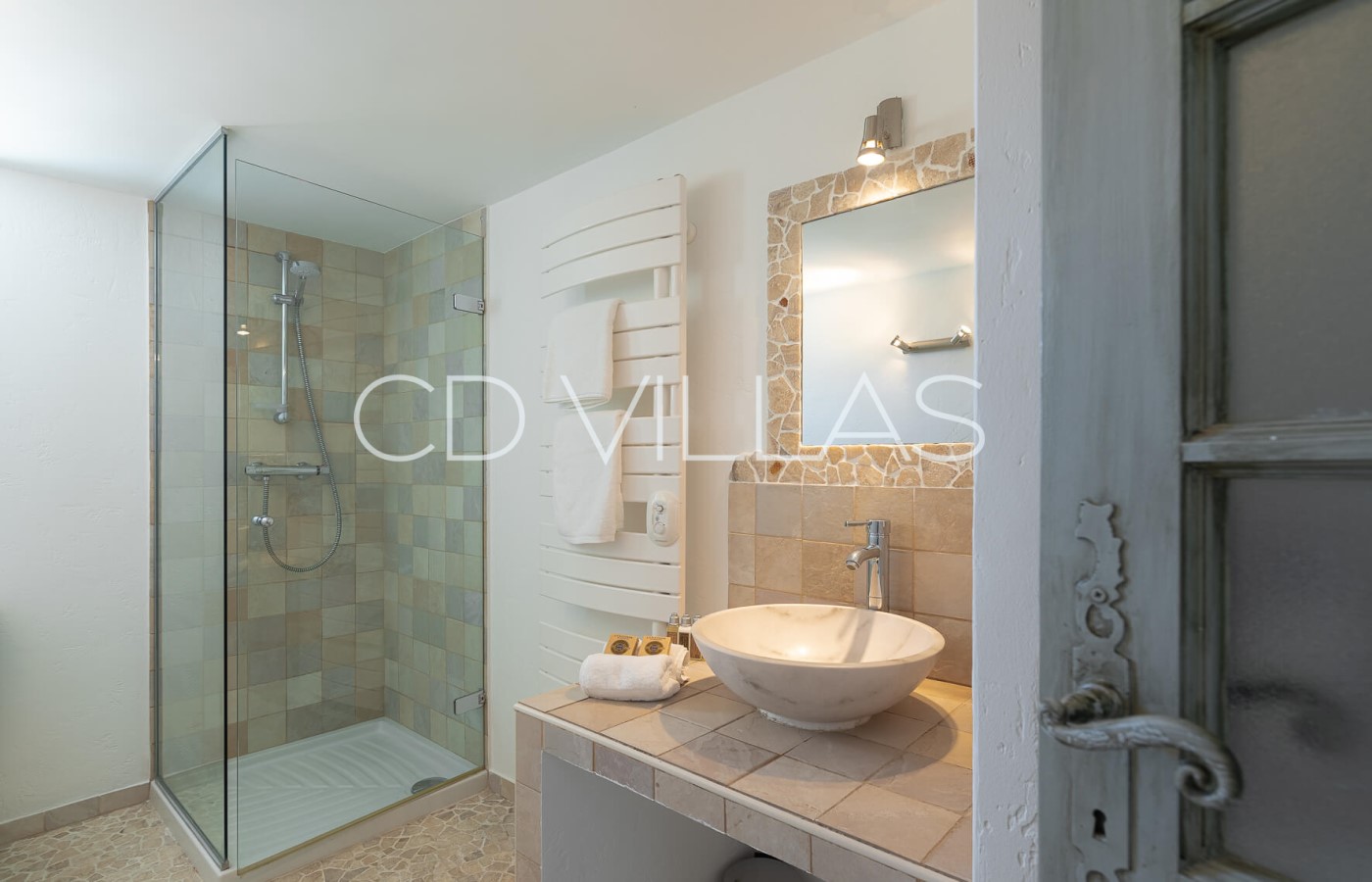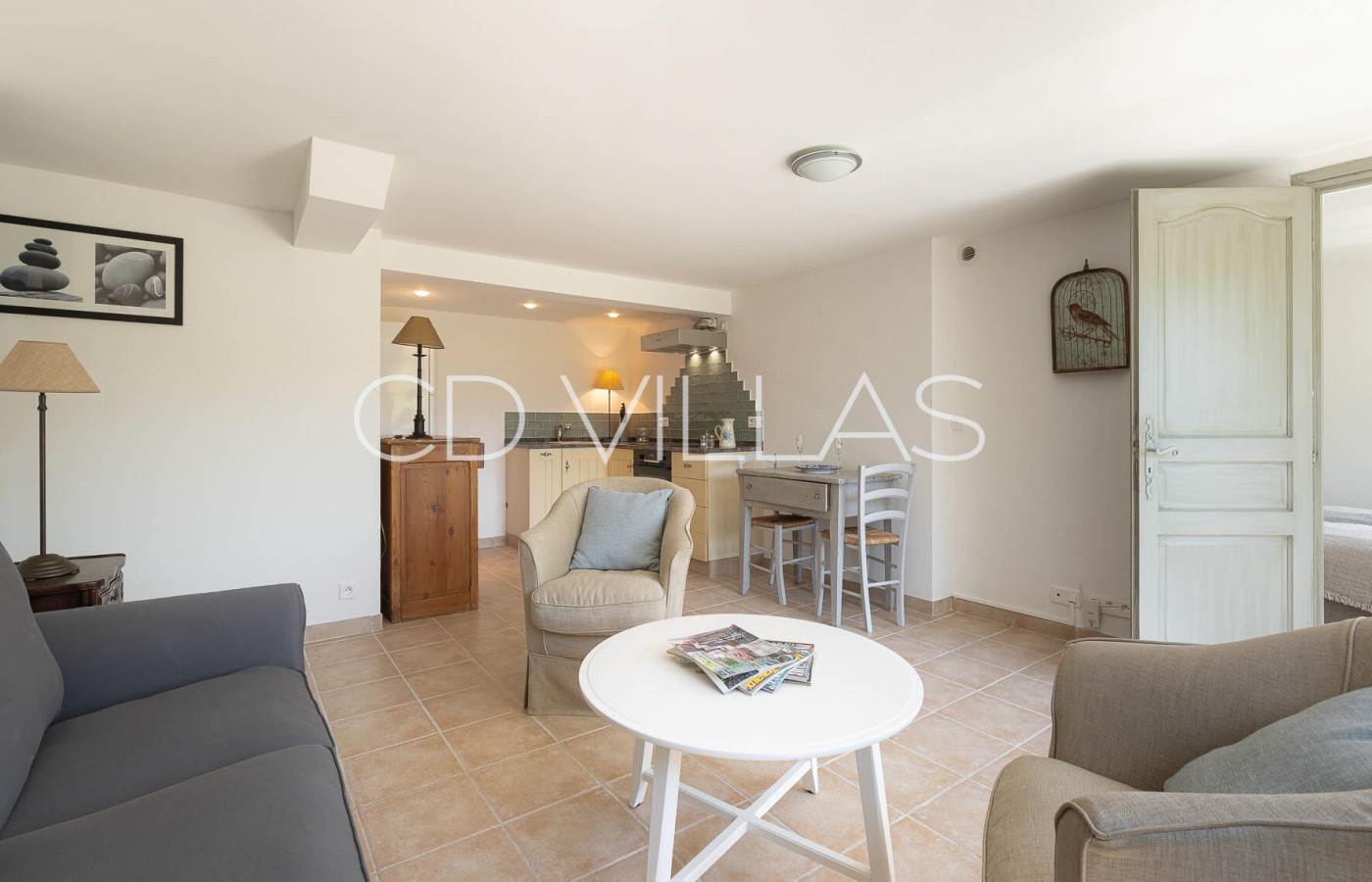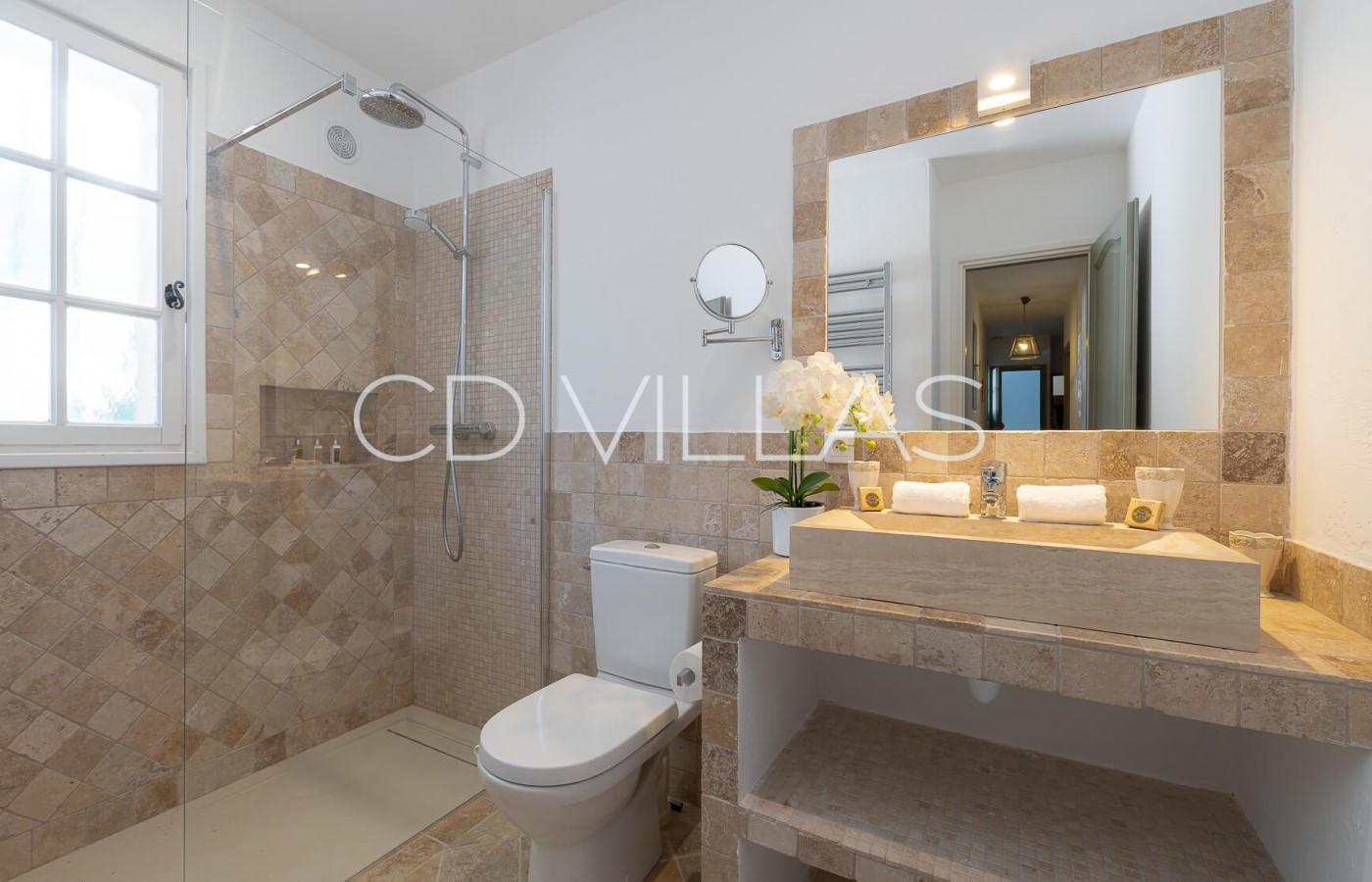 The ground floor offers 3 more double bedrooms and 2 shower rooms. A complete apartment with TV den is available on the garden level of the villa. This area of the house is complete with a living and open plan kitchen, a double bedroom and bathroom. Door lead onto the garden.