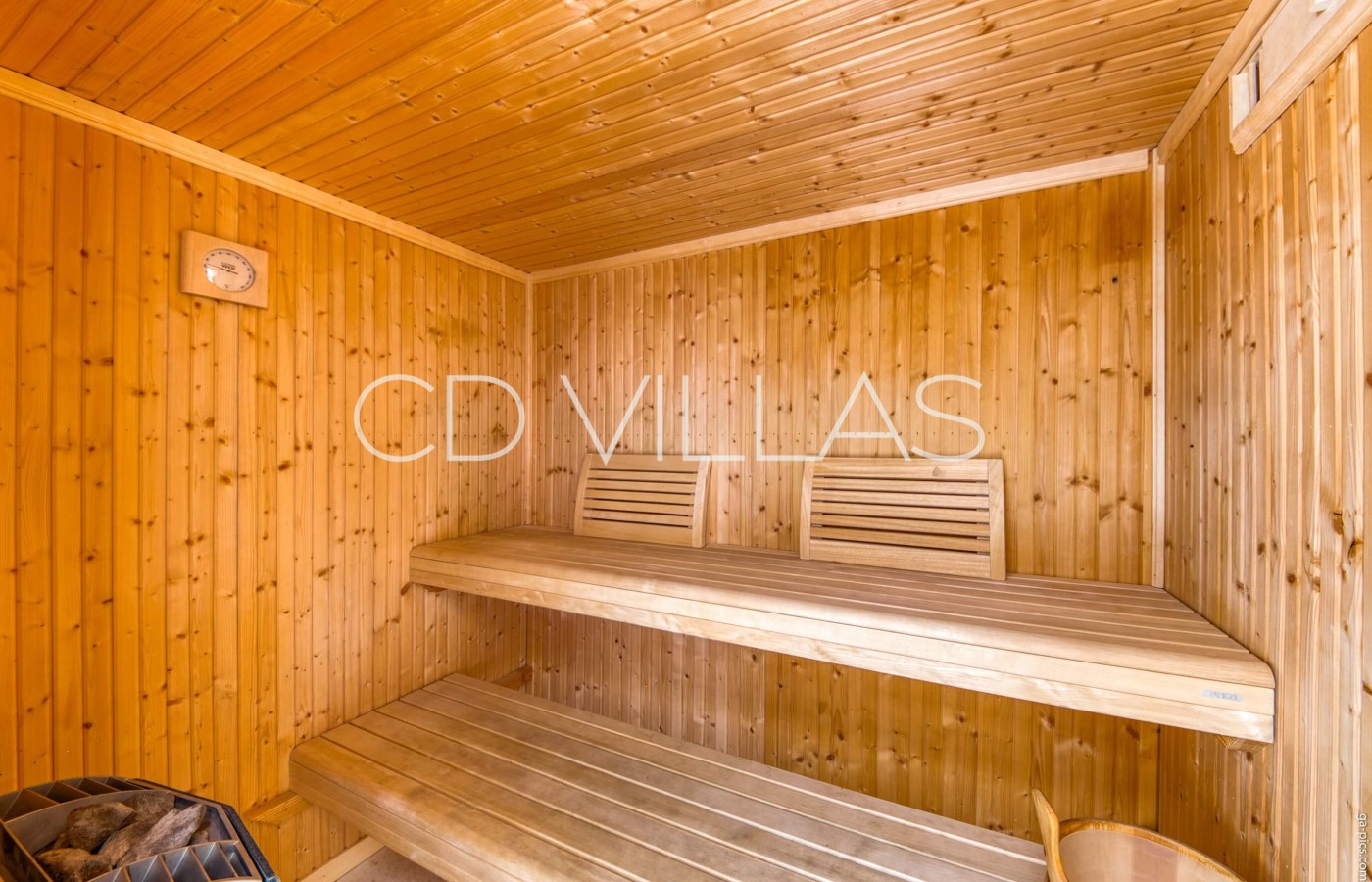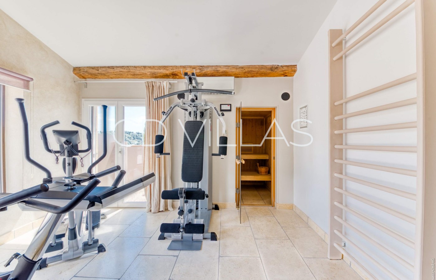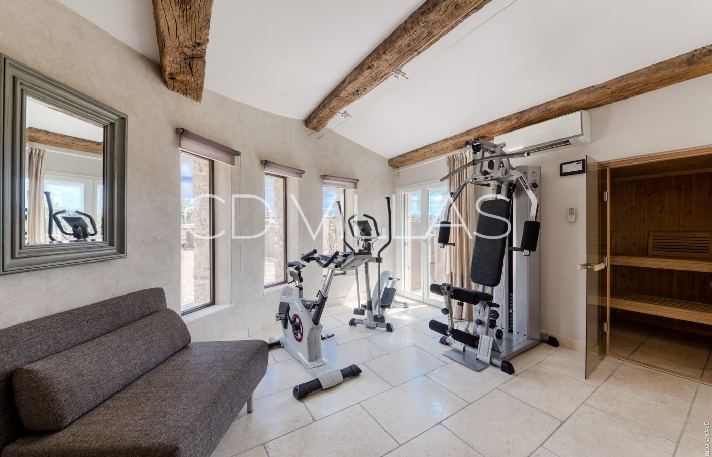 On the entrance level there is a spacious open plan living / dining room opening on to the terrace, a Provencal style kitchen and the master bedroom with en-suite bathroom, home gym and sauna. On this level there is also the dining terrace with BBQ overlooking the gardens and pool.