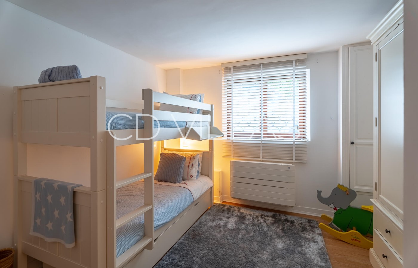 Stairs lead down to the garden level where a further 3 bedrooms and 2 shower rooms can be found. One bedroom has a set of bunkbeds and is therefor more suitable for children. Three of the 4 bedrooms are air-conditioned.