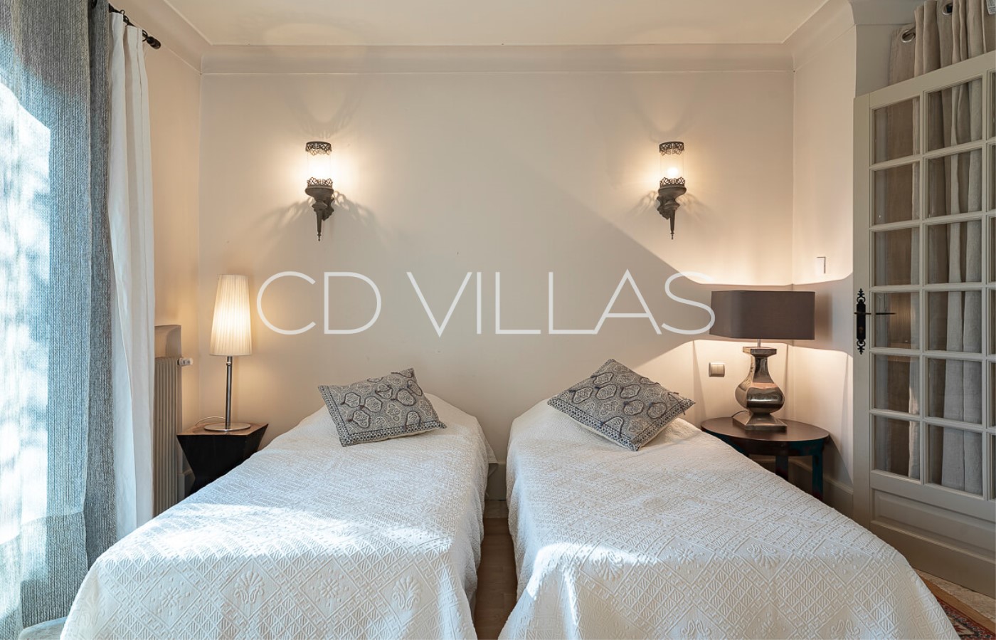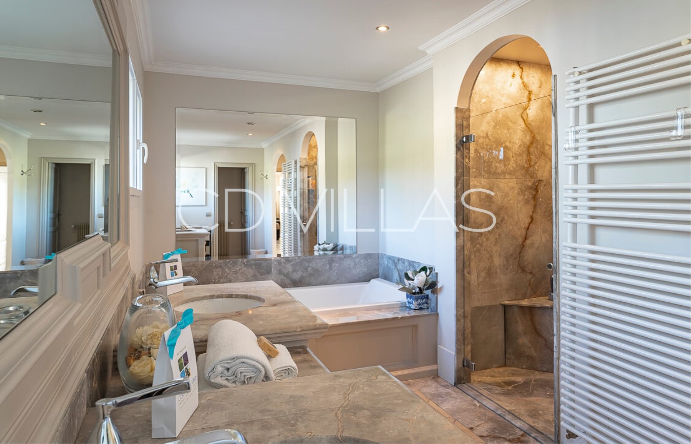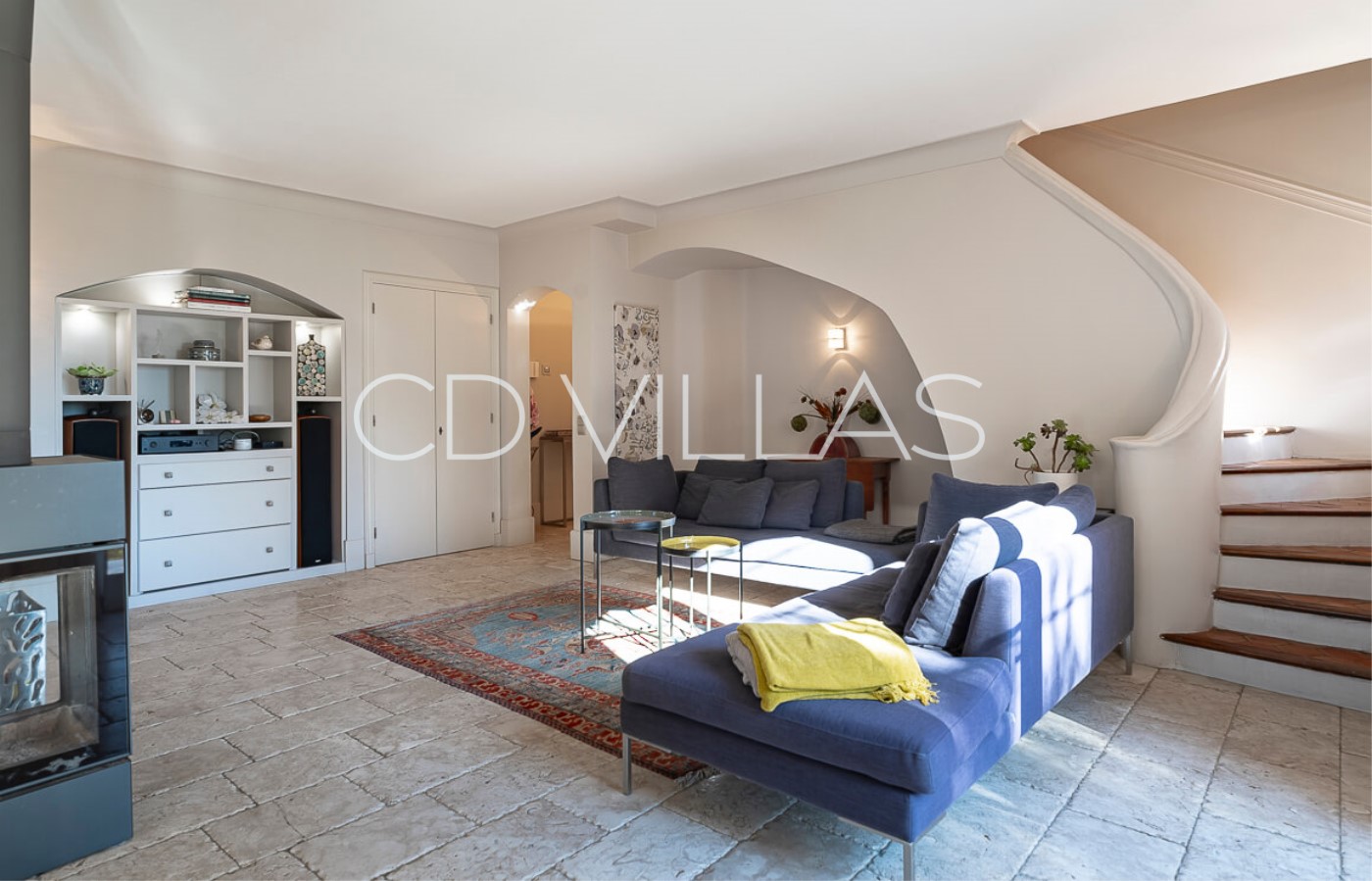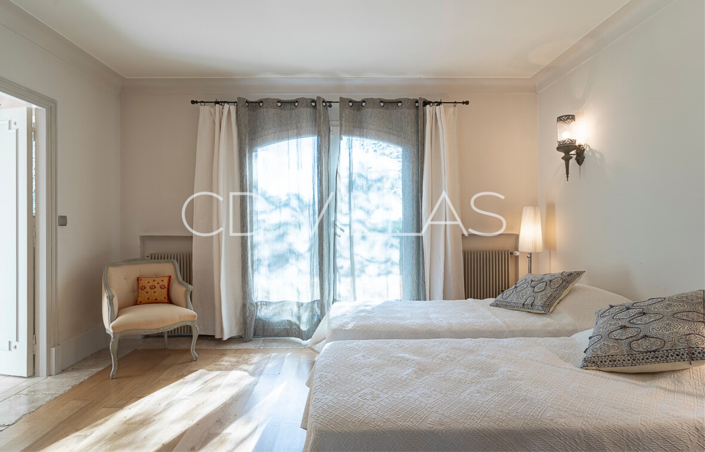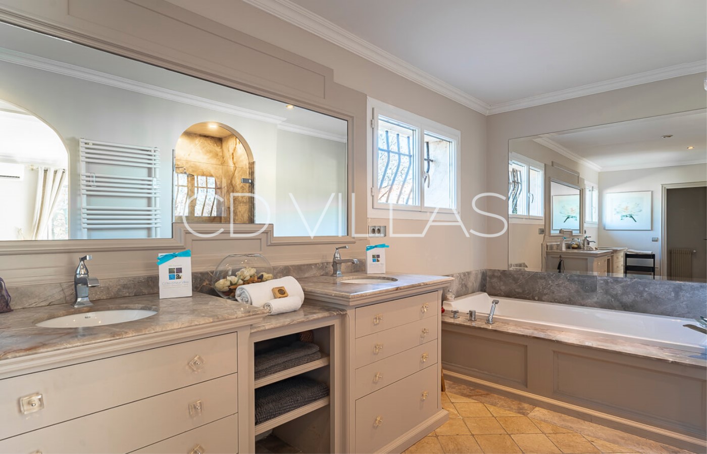 The villa offers 290m2 of living space and is finished to a high standard throughout. There are 2 bedrooms on the ground floor, both opening up to the garden. There are 2 living rooms (air-conditioned), a fully equipped American-style kitchen, a gym and a sauna.