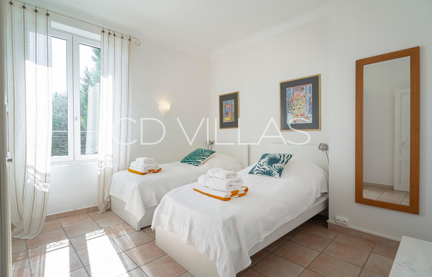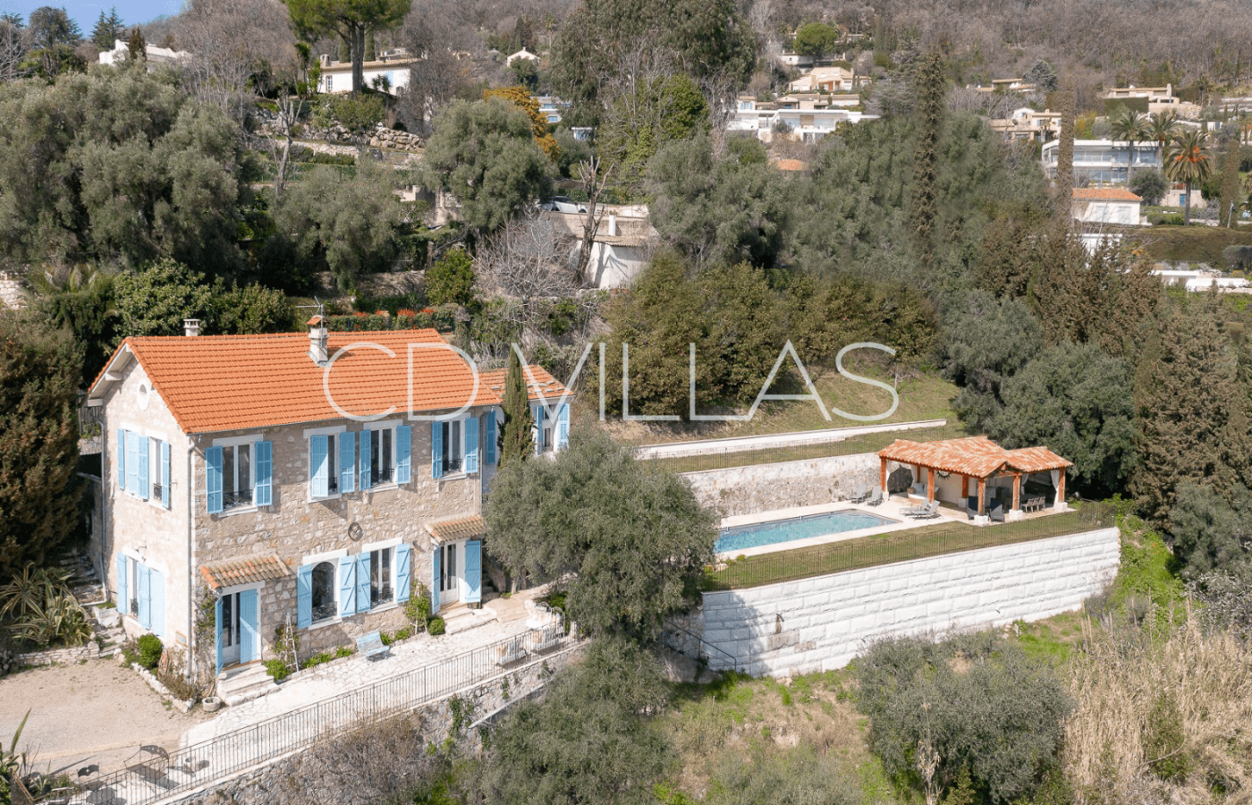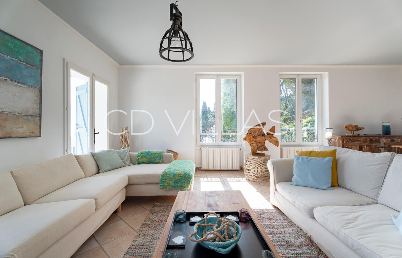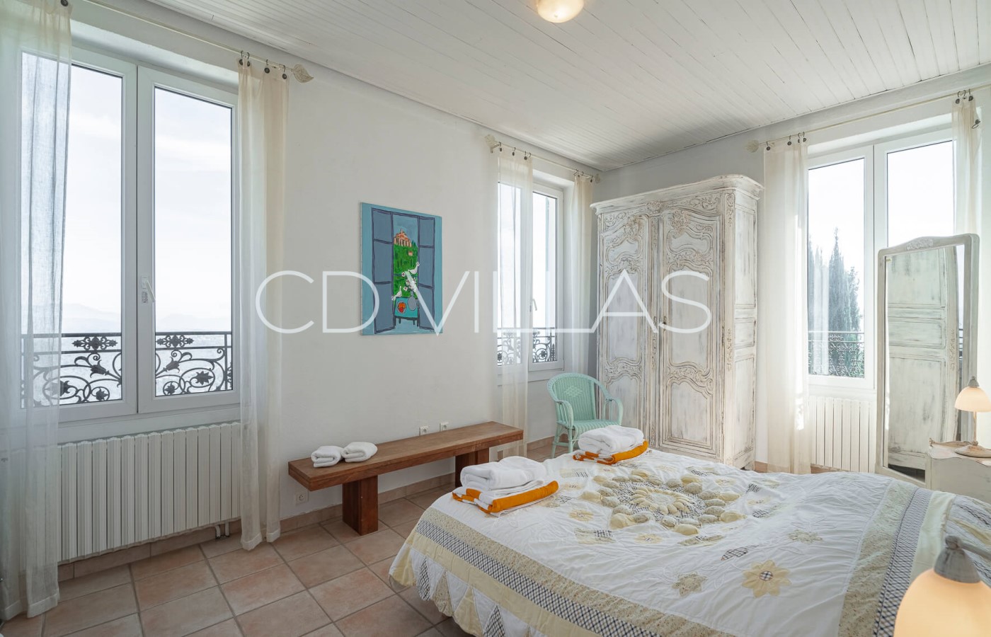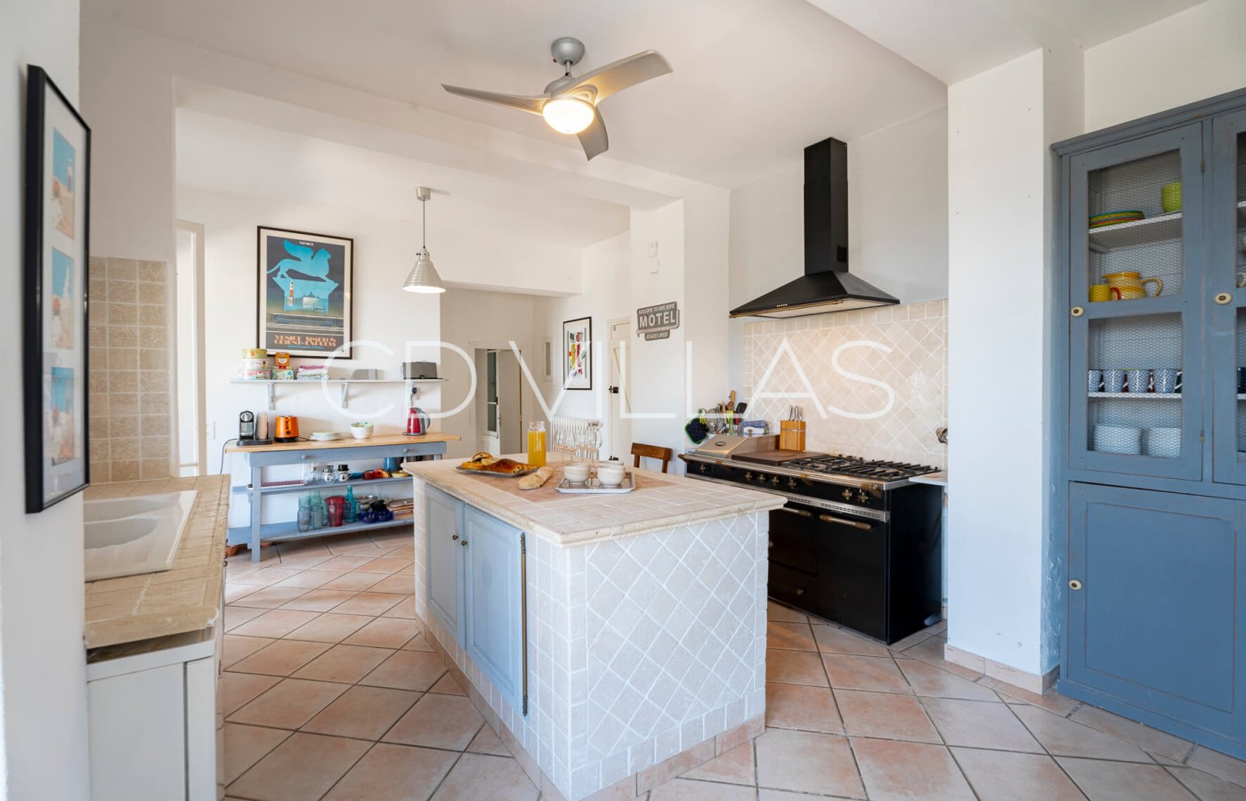 The villa, previously the main house of a flower farm, has been charmingly renovated in keeping with its traditional features, beautiful iron baulestrades and wooden shutters. The entrance hall leads into the light, spacious, double-aspect and high-ceilinged living and dining room with firelplace. Decorated with Mediterranean art in a holiday beach-theme with windows framing the gorgeous views which follow the changes in light across the Riviera. French doors open onto the main terrace leading to the garden and swimming pool.