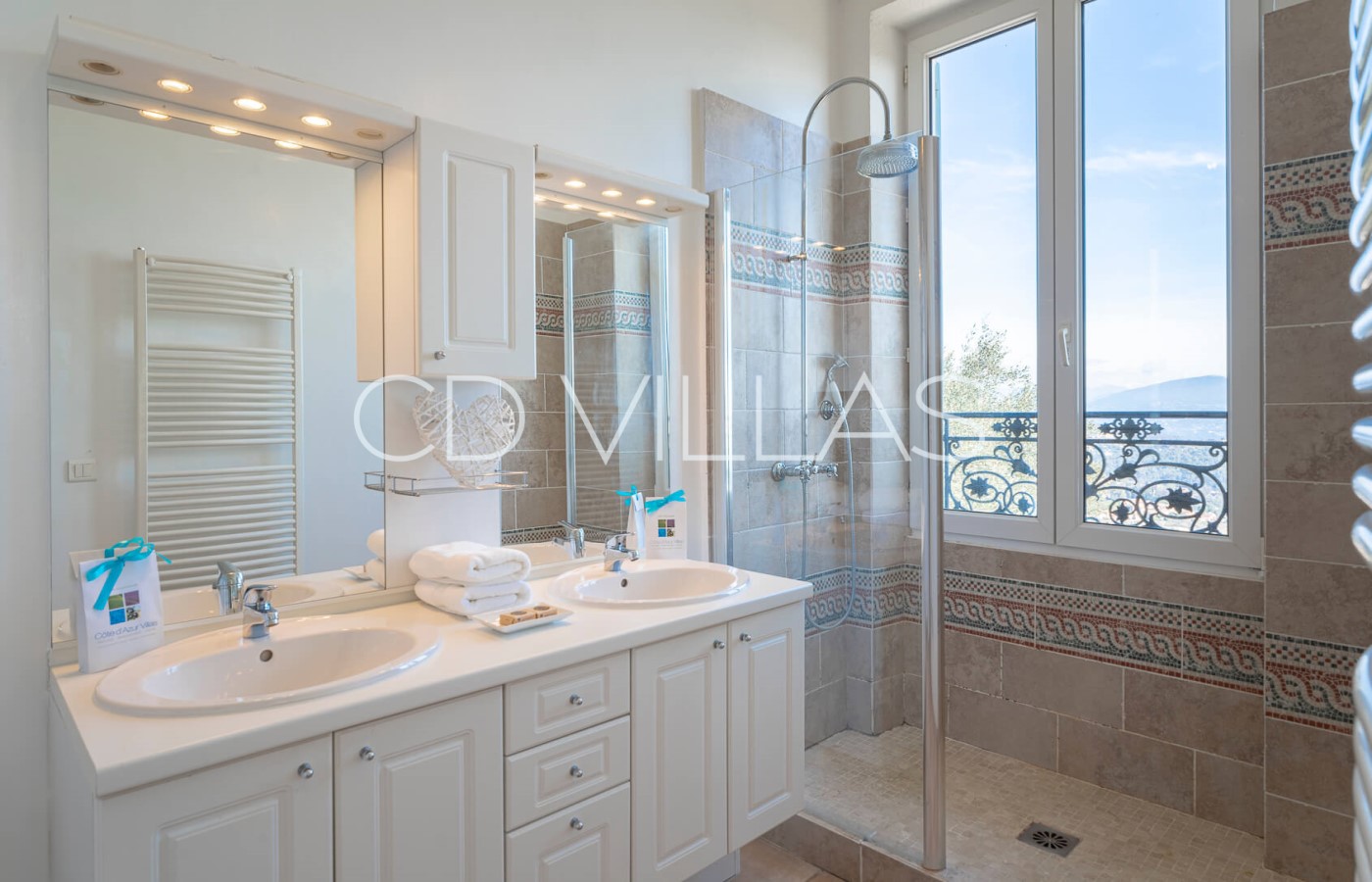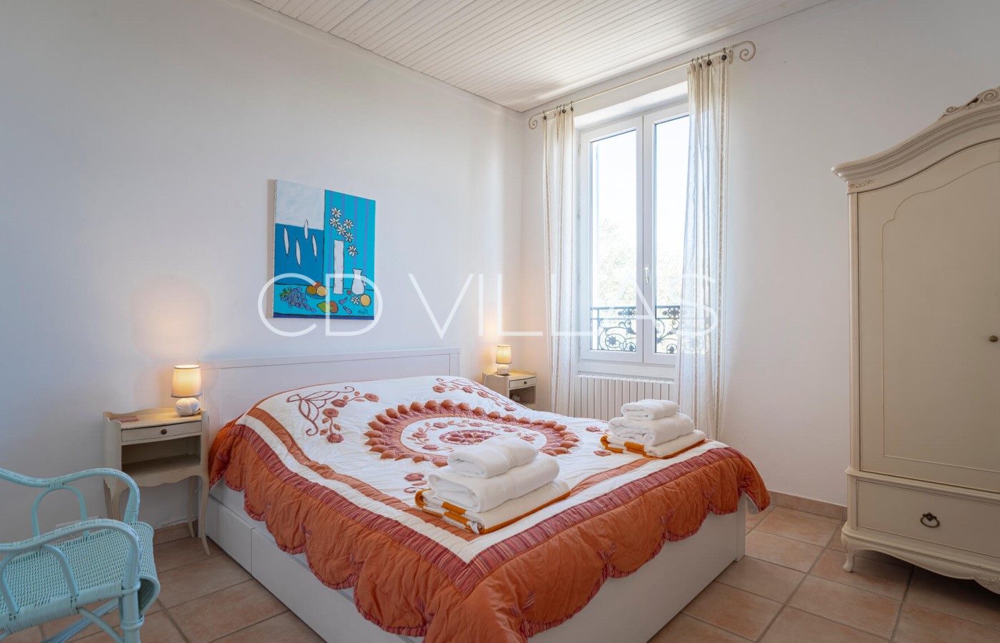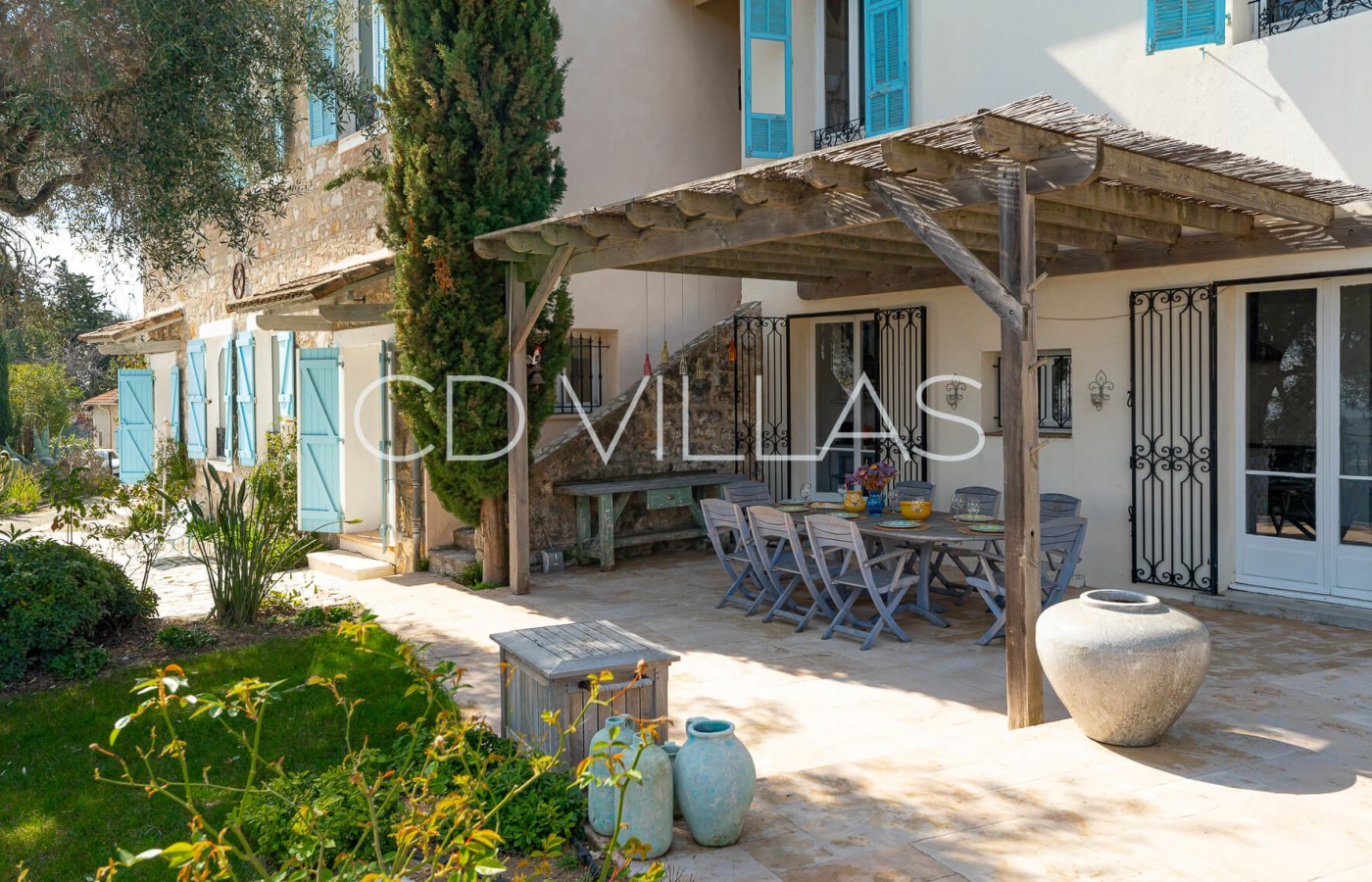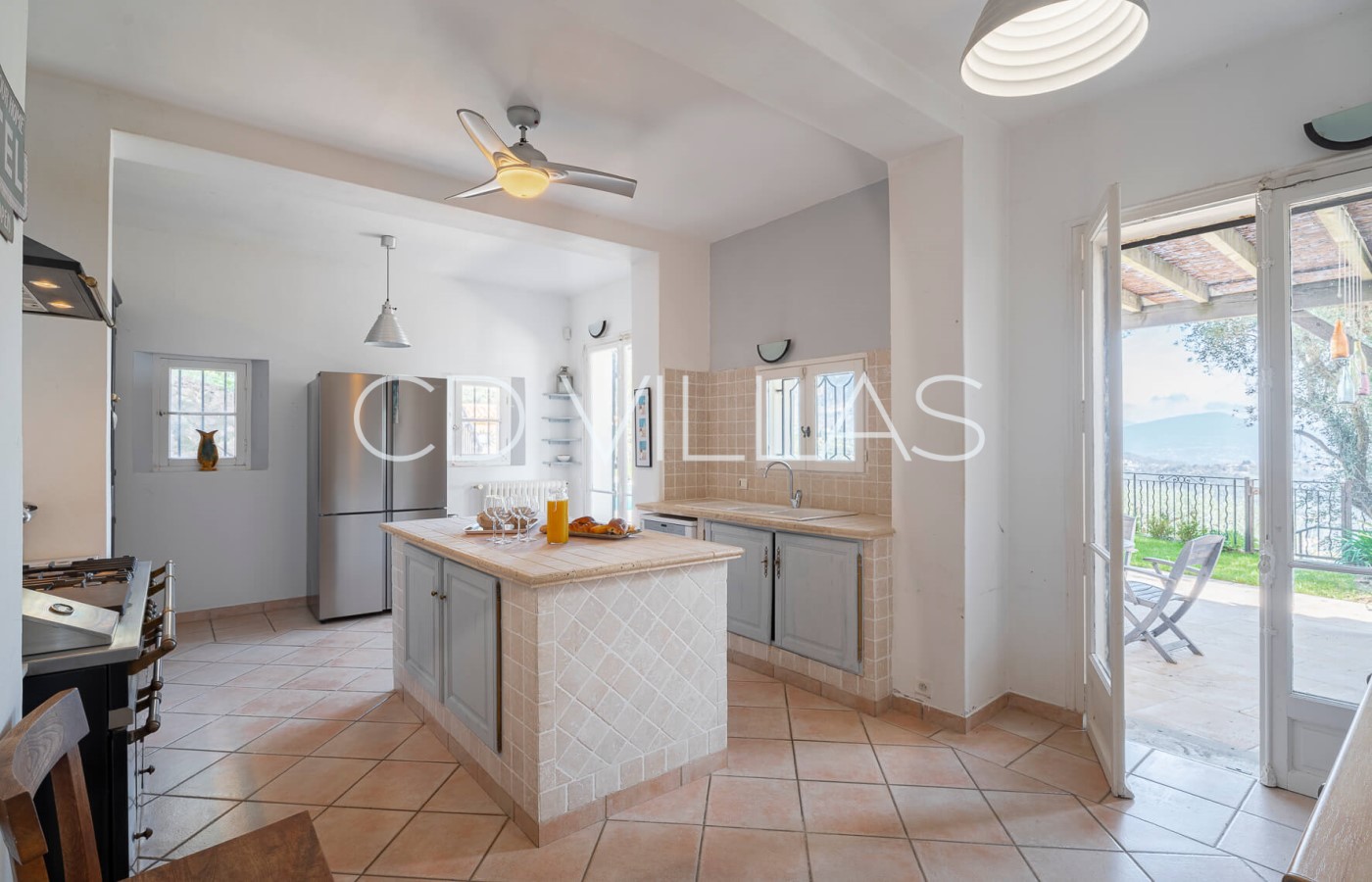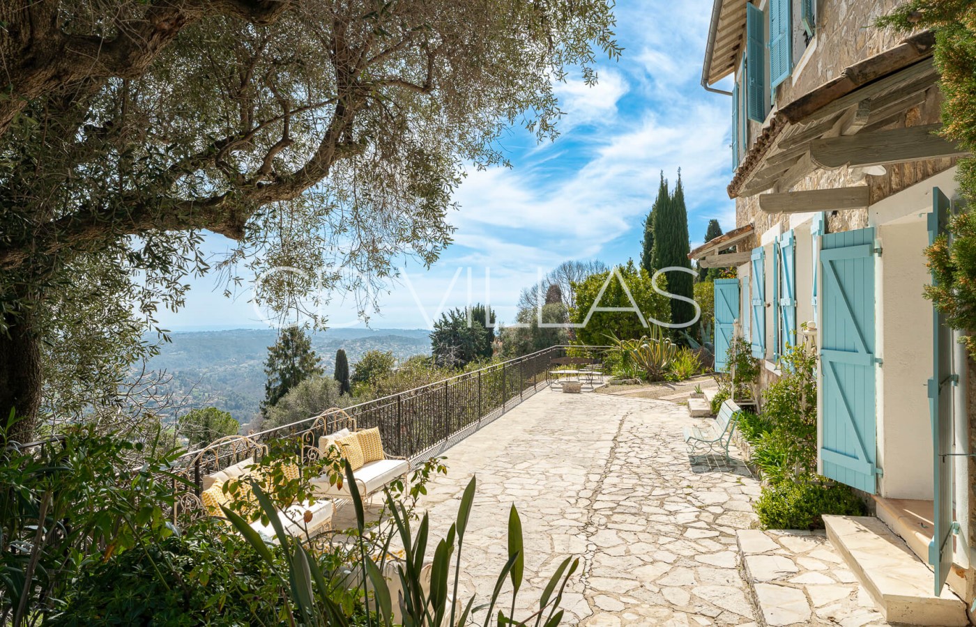 The villa, previously the main house of a flower farm, has been charmingly renovated in keeping with its traditional features, beautiful iron baulestrades and wooden shutters. The entrance hall leads into the light, spacious, double-aspect and high-ceilinged living and dining room with firelplace. Decorated with Mediterranean art in a holiday beach-theme with windows framing the gorgeous views which follow the changes in light across the Riviera. French doors open onto the main terrace leading to the garden and swimming pool.