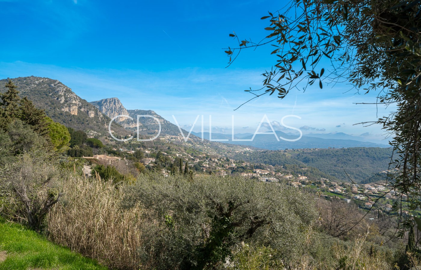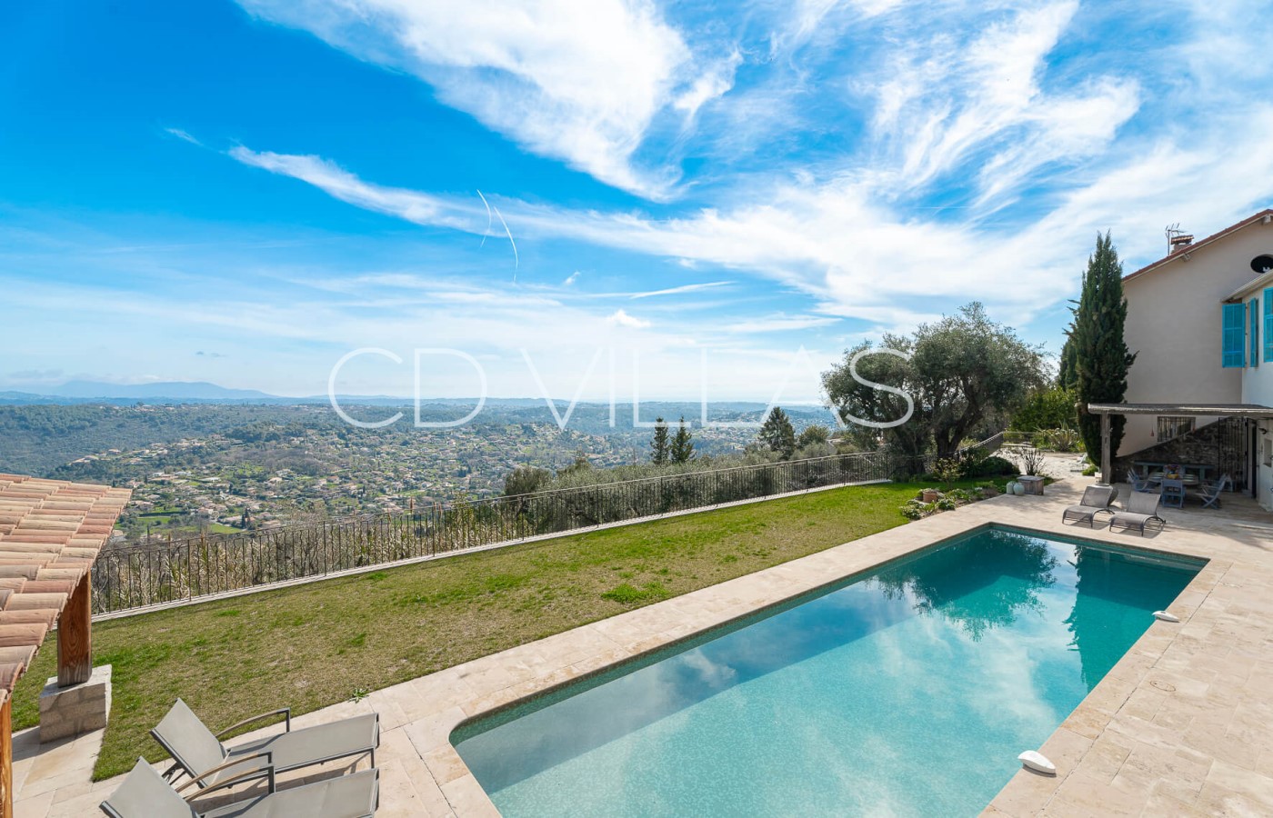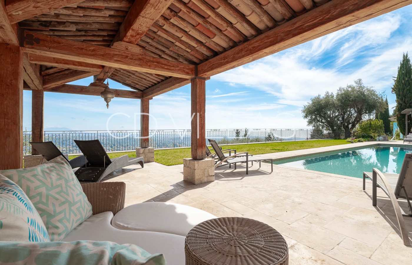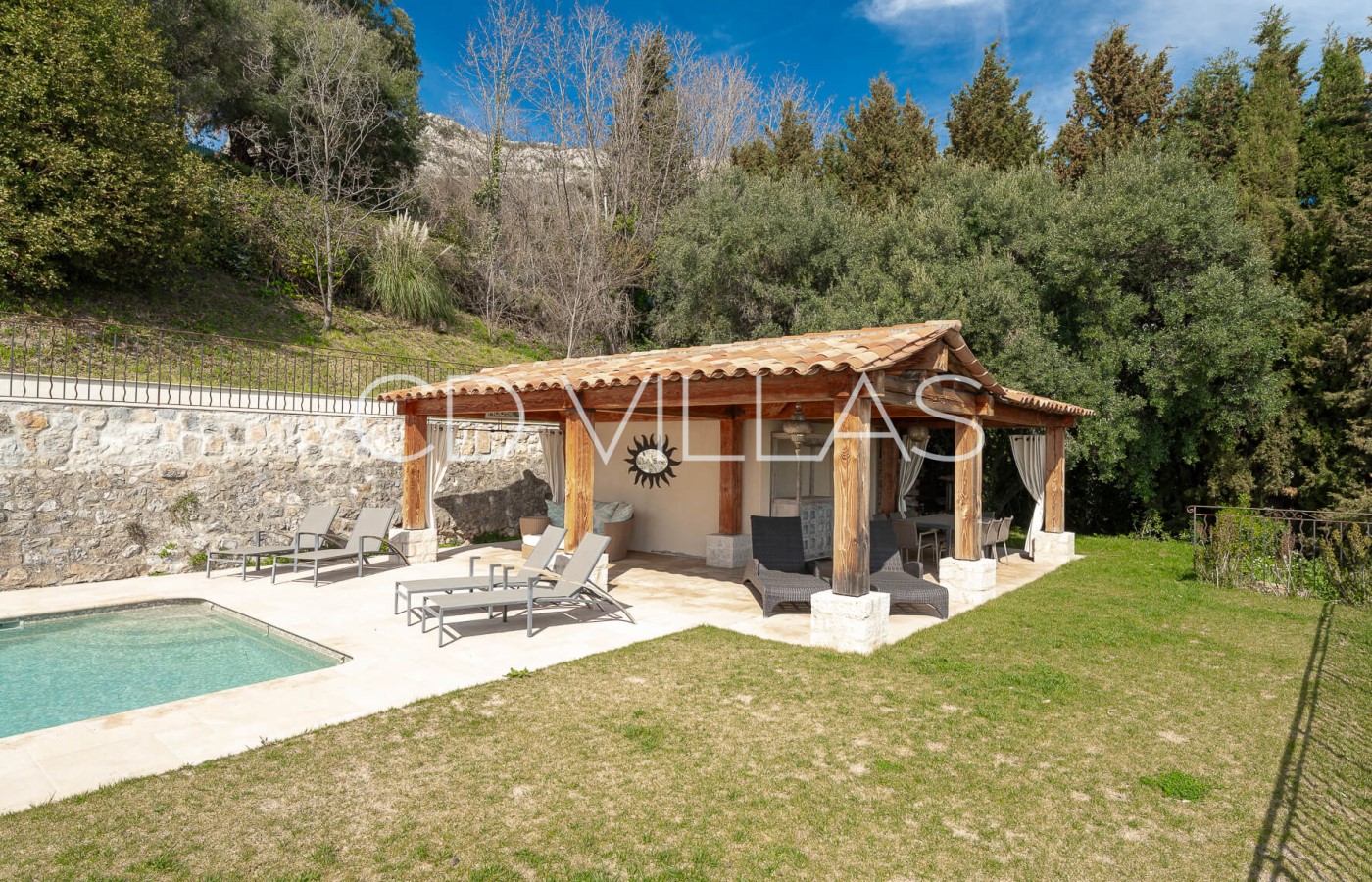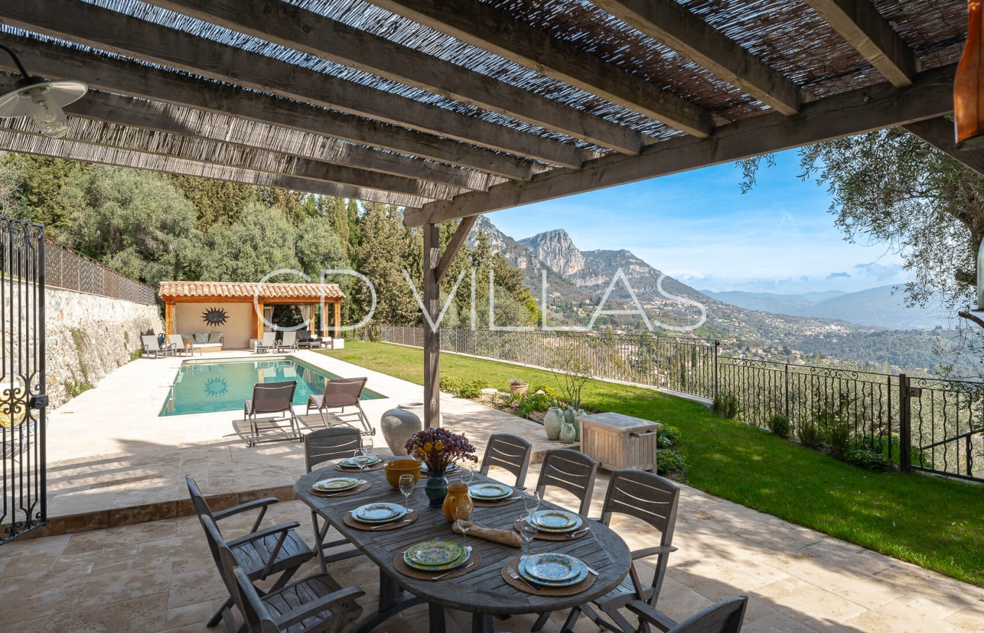 The villa, previously the main house of a flower farm, has been charmingly renovated in keeping with its traditional features, beautiful iron baulestrades and wooden shutters. The entrance hall leads into the light, spacious, double-aspect and high-ceilinged living and dining room with firelplace. Decorated with Mediterranean art in a holiday beach-theme with windows framing the gorgeous views which follow the changes in light across the Riviera. French doors open onto the main terrace leading to the garden and swimming pool.