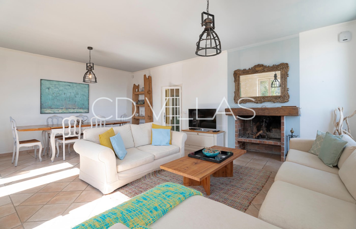 Living and Dining Room - Airconditioned double-aspect, light and spacious living room with sofas, fireplace, TV and dining area with a large table and seating for 6. French doors to the garden and terrace.